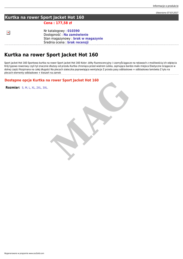 Informacje o produkcie Utworzono 07-03-2017 Kurtka na rower Sport Jacket Hot 160 Cena : 177,58 zł Nr katalogowy : 010390 Dostępność : Na zamówienie Stan magazynowy : brak w magazynie Średnia ocena : brak recenzji Kurtka na rower Sport Jacket Hot 160 Sport jacket Hot 160 Sportowa kurtka na rower Sport jacket Hot 160 Kolor: żółty fluorescencyjny / czarnyŚciągacze na rękawach z możliwością ich odpięcia Krój typowo rowerowy czyli tył znacznie dłuższy od przodu Kurtka chroniąca przed wiatrem Lekka, zajmująca bardzo mało miejsca Elastyczne ściągacze w dolnej części Rozpinana na całej długości Na plecach siateczka poprawiająca wentylacje Z przodu pasy odblaskowe + odblaskowa lamówka Z tyłu na plecach elementy odblaskowe + kieszeń na zamek Dostępne opcje Kurtka na rower Sport Jacket Hot 160 M AG Rozmiar: S, M, L, XL, 2XL, 3XL. Wygenerowano w programie www.oscGold.com