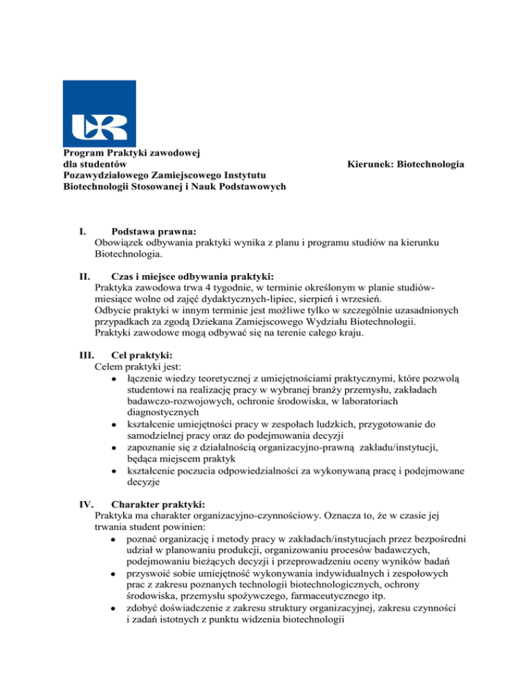 Program Praktyki zawodowej dla studentów Pozawydziałowego Zamiejscowego Instytutu Biotechnologii Stosowanej i Nauk Podstawowych Kierunek: Biotechnologia I. Podstawa prawna: Obowiązek odbywania praktyki wynika z planu i programu studiów na kierunku Biotechnologia. II. Czas i miejsce odbywania praktyki: Praktyka zawodowa trwa 4 tygodnie, w terminie określonym w planie studiówmiesiące wolne od zajęć dydaktycznych-lipiec, sierpień i wrzesień. Odbycie praktyki w innym terminie jest możliwe tylko w szczególnie uzasadnionych przypadkach za zgodą Dziekana Zamiejscowego Wydziału Biotechnologii. Praktyki zawodowe mogą odbywać się na terenie całego kraju. III. Cel praktyki: Celem praktyki jest: łączenie wiedzy teoretycznej z umiejętnościami praktycznymi, które pozwolą studentowi na realizację pracy w wybranej branży przemysłu, zakładach badawczo-rozwojowych, ochronie środowiska, w laboratoriach diagnostycznych kształcenie umiejętności pracy w zespołach ludzkich, przygotowanie do samodzielnej pracy oraz do podejmowania decyzji zapoznanie się z działalnością organizacyjno-prawną zakładu/instytucji, będąca miejscem praktyk kształcenie poczucia odpowiedzialności za wykonywaną pracę i podejmowane decyzje IV. Charakter praktyki: Praktyka ma charakter organizacyjno-czynnościowy. Oznacza to, że w czasie jej trwania student powinien: poznać organizację i metody pracy w zakładach/instytucjach przez bezpośredni udział w planowaniu produkcji, organizowaniu procesów badawczych, podejmowaniu bieżących decyzji i przeprowadzeniu oceny wyników badań przyswoić sobie umiejętność wykonywania indywidualnych i zespołowych prac z zakresu poznanych technologii biotechnologicznych, ochrony środowiska, przemysłu spożywczego, farmaceutycznego itp. zdobyć doświadczenie z zakresu struktury organizacyjnej, zakresu czynności i zadań istotnych z punktu widzenia biotechnologii Wykaz umiejętności praktyczno-organizacyjnych w czasie praktyk zawodowych: 1. Wykaz umiejętności w zakresie Biotechnologii w produkcji zwierzęcej i roślinnej: zakładanie hodowli in vitro zakładanie i monitorowanie hodowli drobnoustrojów wykonywanie testów bakteriologicznych, immunologicznych analizy toksykologiczne oznaczenia stosowane w biologii molekularnej zapoznanie z aspektami ekonomicznymi produkcji V. 2. Wykaz umiejętności w zakresie Biotechnologii w ochronie środowiska: zapoznanie z przepisami prawnymi obowiązującymi w ochronie środowiska zapoznanie z biotechnologicznymi procesami oczyszczania ścieków oznaczanie zanieczyszczeń i monitoring środowiska zapoznanie z monitoringiem jakości wody przeznaczonej do spożycia zapoznanie z zasadami produkcji i biotechnologicznym wykorzystaniem biomasy zapoznanie z metodami biodegradacji odpadów zapoznanie się z specyfiką zagrożeń problemów ekologicznych występujących na terenie zamieszkania i całego kraju udział w sporządzaniu dokumentacji z zakresu ochrony środowiska 3. Biotechnologia w przemyśle: zapoznanie z procesem produkcji surowic, szczepionek, hormonów, biopreparatów, dodatków paszowych, leków, enzymów i autoszczepionek przebieg i znaczenie procesów fermentacyjnych, zapoznanie z metodami konserwacji i utrwalanie żywności zapoznanie z oceną jakościową produktów zapoznanie się z metodami nadzoru nad żywnością genetycznie modyfikowaną (GMO) 4. Przygotowanie materiałów i prowadzenie analiz w specjalistycznych laboratoriach: podstawy interpretacji wyników badań laboratoryjnych w celu różnicowania stanów fizjologicznych i patologicznych organizmu człowieka. kryteria doboru badań laboratoryjnych oraz ukierunkowana interpretacja wyników z myślą o rozpoznaniu, prognozowaniu lub monitorowaniu procesu chorobowego. podstawy oceny wartości diagnostycznej metod analitycznych. wyniki badań laboratoryjnych a inne źródła informacji o stanie zdrowia pacjenta. znaczenie badań laboratoryjnych w profilaktyce. nowe parametry diagnostyczne wprowadzane do rutynowej diagnostyki laboratoryjnej.