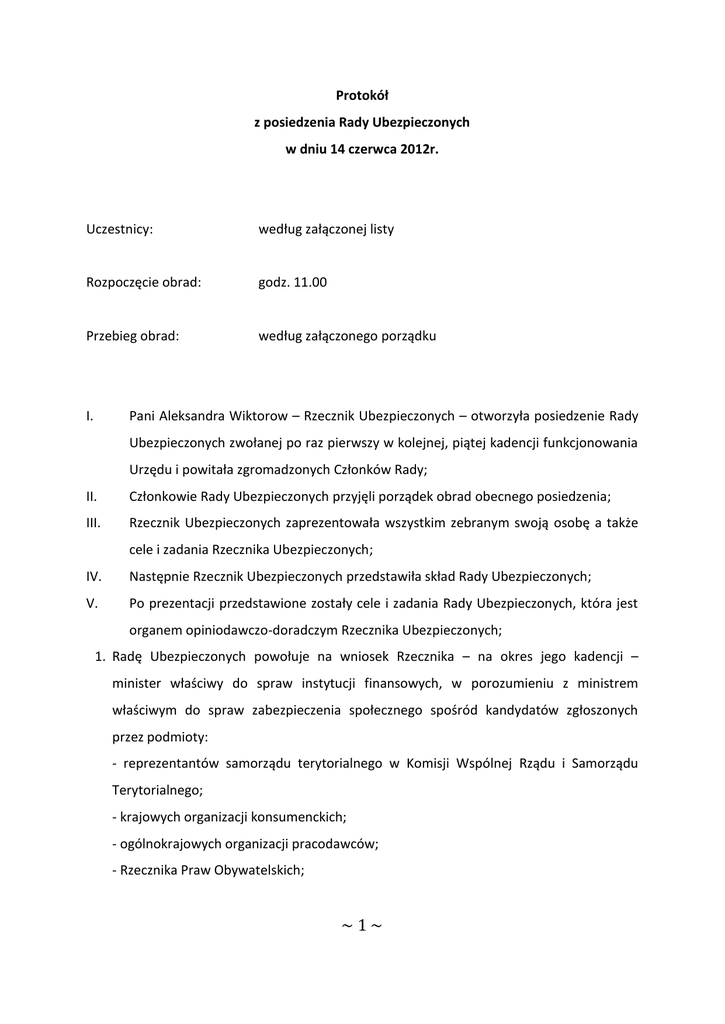 Protokół z posiedzenia Rady Ubezpieczonych w dniu 14 czerwca