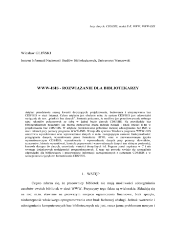 bazy danych, CDS/ISIS, model E-R, WWW, WWW-ISIS Wiesław GLIŃSKI Instytut Informacji Naukowej i Studiów Bibliologicznych, Uniwersytet Warszawski WWW-ISIS - ROZWIĄZANIE DLA BIBLIOTEKARZY Artykuł przedstawia szereg kwestii dotyczących: projektowania, budowania i utrzymywania baz CDS/ISIS w sieci Internet. Celem artykułu jest obalenie mitu, że system CDS/ISIS jest odpowiedni wyłącznie do tzw. „płaskich baz danych”. Zostanie pokazane, że możliwe jest przechowywanie różnego typu rekordów połączonych ze sobą w jednej bazie danych CDS/ISIS. Na przykładzie baz bibliograficznych pokażemy jak można zastosować znaną metodę Relacji i Encji (model E-R) w projektowaniu baz CDS/ISIS. W artykule przedstawiono pobieżnie metodę udostępniania baz ISIS w sieci Internet przy pomocy programu WWW-ISIS. Wersja dla systemu Windows programu WWW-ISIS umożliwia wyszukiwanie oraz wprowadzanie danych w m.in. następującym zakresie funkcjonalności: przeglądanie danych, wyszukiwanie przez formularze HTML oraz w zaawansowanym języku wyszukiwawczym CDS/ISIS; wyszukiwanie i wprowadzanie danych przy pomocy słowników, tezaurusów; historia wyszukiwań, kontrola poprawności wprowadzanych danych (na różnym poziomie); kontrola dostępu do danych, ustawianie wartości domyślnych itd. Pogram został napisany w C i nie wymaga dodatkowych umiejętności programistycznych. Z tego też powodu wydaje się szczególnie odpowiedni dla bibliotekarzy i pracowników informacji zaznajomionych z systemem CDS/ISIS a w szczególności z językiem formatowania CDS/ISIS. 1. WSTĘP Często zdarza się, że pracownicy bibliotek nie mają możliwości udostępniania zasobów swoich bibliotek w sieci WWW. Przyczyny tego faktu są wielorakie. Składają się na nie: m.in. stawiane na pierwszym miejscu ograniczenia finansowe, brak sprzętu, niedostępność właściwego oprogramowania oraz brak fachowej obsługi. Jednak tworzenie i udostępnianie komputerowych baz bibliotecznych nie jest, rzecz jasna problemem nowym i związanym wyłącznie z powstaniem sieci Internet. Zagadnienie to było wielokrotnie poruszane, a jego finansowe aspekty nie są wyłącznie domeną Polski. Powstały w latach 80-tych system CDS/ISIS był taką właśnie próbą rozwiązania dostępu do baz tekstowych 1 w sytuacjach ograniczonych zasobów finansowych. Z inicjatywy UNESCO program stał się sukcesem na skalę światową. Również w Polsce powstało wiele baz danych jak i złożonych aplikacji wykorzystujących system CDS/ISIS. Podstawowymi zaletami systemu były i są jego nieodpłatność, niezwykle ekonomiczny sposób przechowywania danych, jak też niewielkie wymagania sprzętowe. Niestety w dobie sieci Internet i udostępniania baz w sieci WWW te zalety stały się niemal niezauważalne. Należy jednak zdać sobie sprawę z tego, że z tamtych czasów pozostaje nadal wiele baz danych zapisanych w formacie ISIS (względnie ISO2709), które nie mogą być w pełni wykorzystane w sieci WWW. Istnieje oczywiście szereg rozwiązań, nie omówionych w niniejszej publikacji, pozwalających na udostępnianie baz ISIS w sieci WWW tak jak np.: WWW/ISIS 2 , JAVA ISIS itd. Jednak ich implementacja wymaga sporych umiejętności programistycznych i nie zawsze jest łatwa, a systemy te mają dość ograniczone możliwości. Stworzony w Polsce pod koniec lat 90-tych i udoskonalany do 2002 roku system WWW-ISIS jest próbą dania do ręki byłym użytkownikom łatwego w obsłudze narzędzia do tworzenia w pełni profesjonalnych aplikacji baz danych w sieci WWW. Przesłanki do stworzenia systemu WWW-ISIS były następujące: – posiadanie baz CDS/ISIS do wykorzystania w sieci WWW; – umiejętność w obsługi systemu CDS/ISIS 3 ; – w miarę nieograniczony czas i zasoby ludzkie; – ograniczone zasoby finansowe. W niniejszym artykule zakładamy pewną wiedzę czytelnika na temat systemu CDS/ISIS, a zwłaszcza języka formatowania. W dalszej części artykułu zwrócimy uwagę na duże możliwości systemu CDS/ISIS w tzw. modelowaniu E-R (relacji-encji) Chenna. Następnie przejdziemy do omówienia zagadnień wstępnych dotyczących: m.in. platformy serwerowej, aby na końcu omówić sam system WWW-ISIS oraz wybrane aspekty projektowania interfejsów w WWW-ISIS. 1 2 3 Trzeba jednak zaznaczyć, że ówczesna wersja systemu CDS/ISIS nie była związana z zagadnieniem sieci. System WWW/ISIS opracowany został przez firmę BIREME. Należy zwrócić uwagę jedynie na wybrane aspekty systemu CDS/ISIS jak: znajomość technik formatowania, tworzenie i obsługa zbioru odwróconego, eksport, import danych itd. 2. RELACJE W CDS/ISIS Jednym z rozpowszechnionych mitów dotyczących baz CDS-ISIS jest stwierdzenie, że bazy CDS-ISIS są w stanie odzwierciedlić wyłącznie tzw. jednowymiarowe tablice danych, tzn. bazy, w których nie ma możliwości pokazywania różnych typów rekordów połączonych między sobą relacjami. Jest rzeczą naturalną, że w danej bazie danych pragniemy zachować rekordy różnych typów. Na przykład w bazie bibliograficznej pragniemy zachować informacje o artykułach z czasopism, opisy bibliograficzne książek, i/lub opisy bibliograficzne samych czasopism. Powstaje jednak pytanie: W jaki sposób możemy odróżnić różnego typu rekordy zachowane w bazie ISISa? Oczywiście rekordy mogą być „rozróżnialne” na różne sposoby. Możemy je rozróżnić przez wprowadzenie specjalnego pola, które przechowuje informacje o typie danego rekordu. Rozróżnienie rekordów oraz ich struktury powinno być odzwierciedlone w strukturze zbioru odwróconego. W tym celu konieczne jest użycie łatwo identyfikowalnego pola przechowującego stosowne informacje o typie rekordu, zaś w zbiorze odwróconym wprowadzamy przedrostek "T=" i określamy jego zawartość w zależności od wartości we wspomnianym polu. Przykładowo w bazie bibliograficznej pole (o znaczniku) 11 zawiera informacje o rodzaju opisu bibliograficznego (bibliogra