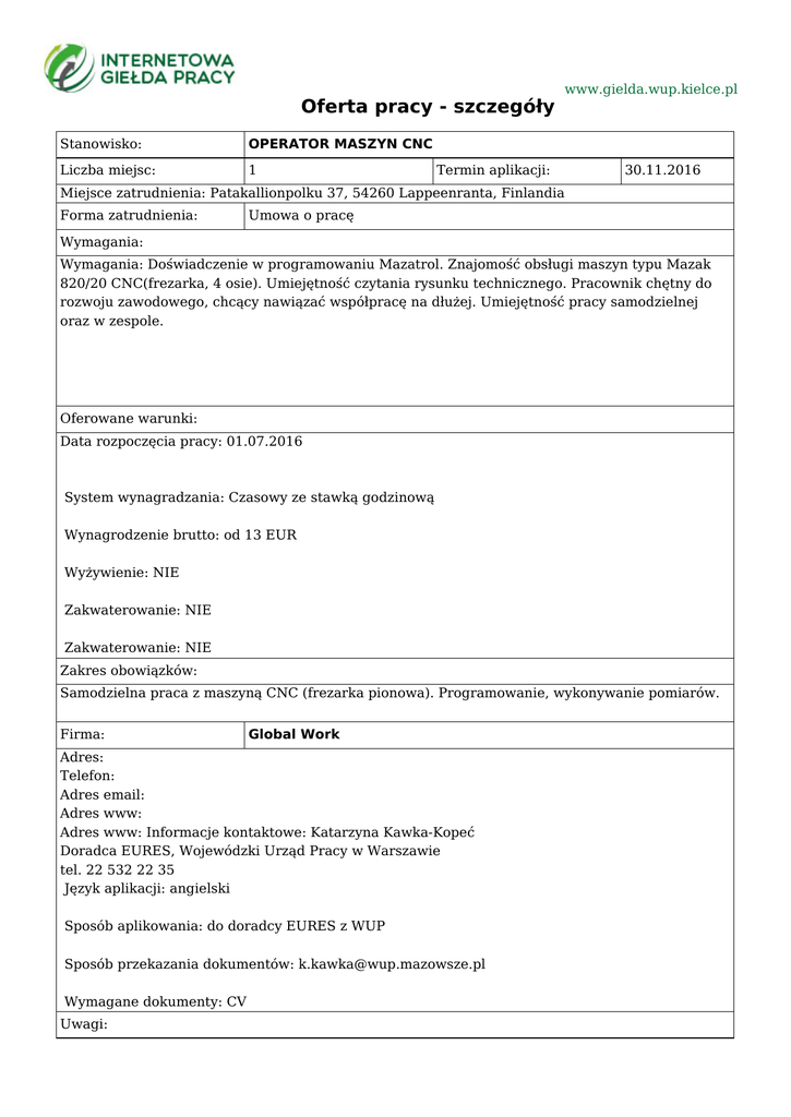 Oferta pracy - szczegóły Stanowisko: OPERATOR MASZYN CNC Liczba miejsc: 1 www.gielda.wup.kielce.pl Termin aplikacji: 30.11.2016 Miejsce zatrudnienia: Patakallionpolku 37, 54260 Lappeenranta, Finlandia Forma zatrudnienia: Umowa o pracę Wymagania: Wymagania: Doświadczenie w programowaniu Mazatrol. Znajomość obsługi maszyn typu Mazak 820/20 CNC(frezarka, 4 osie). Umiejętność czytania rysunku technicznego. Pracownik chętny do rozwoju zawodowego, chcący nawiązać współpracę na dłużej. Umiejętność pracy samodzielnej oraz w zespole. Oferowane warunki: Data rozpoczęcia pracy: 01.07.2016 System wynagradzania: Czasowy ze stawką godzinową Wynagrodzenie brutto: od 13 EUR Wyżywienie: NIE Zakwaterowanie: NIE Zakwaterowanie: NIE Zakres obowiązków: Samodzielna praca z maszyną CNC (frezarka pionowa). Programowanie, wykonywanie pomiarów. Firma: Global Work Adres: Telefon: Adres email: Adres www: Adres www: Informacje kontaktowe: Katarzyna Kawka-Kopeć Doradca EURES, Wojewódzki Urząd Pracy w Warszawie tel. 22 532 22 35 Język aplikacji: angielski Sposób aplikowania: do doradcy EURES z WUP Sposób przekazania dokumentów: [email protected] Wymagane dokumenty: CV Uwagi: Identyfikator oferty: 4899498 Instytucja koordynująca ofertę: Wojewódzki Urząd Pracy w Warszawie Urząd Pracy dokłada wszelkich starań, aby oferty pracy będące w zasobach urzędu, były rzetelne i wiarygodne. Ponieważ wszystkie oferty pracy pochodzą od osób trzecich Urząd Pracy zastrzega, że odpowiedzialność za ewentualne rozbieżności pomiędzy warunkami pracy zaprezentowanymi w niniejszej ofercie a warunkami zaproponowanymi przez potencjalnego pracodawcę ponosi pracodawca.