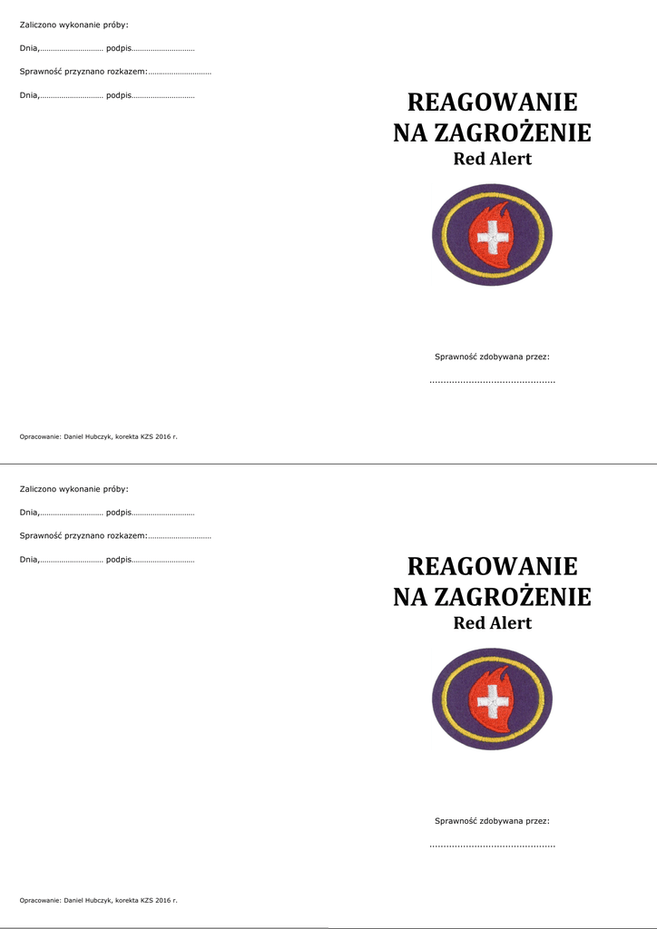 Zaliczono wykonanie próby: Dnia,………………………… podpis………………………… Sprawność przyznano rozkazem:………………………… Dnia,………………………… podpis………………………… REAGOWANIE NA ZAGROŻENIE Red Alert Sprawność zdobywana przez: ............................................. Opracowanie: Daniel Hubczyk, korekta KZS 2016 r. Zaliczono wykonanie próby: Dnia,………………………… podpis………………………… Sprawność przyznano rozkazem:………………………… Dnia,………………………… podpis………………………… REAGOWANIE NA ZAGROŻENIE Red Alert Sprawność zdobywana przez: ............................................. Opracowanie: Daniel Hubczyk, korekta KZS 2016 r. Wymagania próby na sprawność 1. Omówił co należy zrobić, aby uniknąć utraty zdrowia (uszkodzenia ciała) lub nawet życia w następujących niebezpiecznych sytuacjach: a. pożar w domu, domu sąsiadów lub w budynku użyteczności publicznej (np. sklep, centrum handlowe, itp.), b. utknięcie w samochodzie podczas zamieci śnieżnej lub na pustyni, c. wypadek samochodowy, d. trzęsienie ziemi, e. powódź, f. trąba powietrzna (tornado), g. huragan, h. burza z piorunami, i. zagrożenie nuklearne, j. lawina śnieżna lub kamienna (błotna), k. wywrotka do góry dnem łodzi lub kanoe na otwartych wodach. c. Omówił ze swoim egzaminatorem procedury zapewniające bezpieczną ewakuacje ludzi z budynku kościoła i szkoły w przypadku pożaru. Zwrócił szczególną uwagę na sposoby przeciwdziałania panice w kryzysowych sytuacjach. Zaliczono: data, podpis ………………………… 5. Omówił co należy zrobić, aby ograniczyć ryzyko porwania dzieci w jego rodzinie (co mogą zrobić rodzice, a także dzieci). Omówił co powinien zrobić jeśli jednak zostanie uprowadzony. Zaliczono: data, podpis ………………………… Zaliczono: data, podpis ………………………… 2. Odpowiedział na pytania: dzwoniąc po pomoc w sytuacji alarmowej, jakie podstawowe informacje powinny zostać podane? kto powinien zakończyć połączenie (rozłączyć się)? Zaliczono: data, podpis ………………………… 3. Zademonstrował jakie nadzwyczajne środki pierwszej pomocy powinny zostać wykonane w następujących sytuacjach: a. palące się ubranie na kimś, b. silnie krwawiąca rana, c. zadławienie/zakrztuszenie, d. połknięcie trucizny przez kogoś. Zaliczono: data, podpis ………………………… 4. Wykonał następujące zadania: a. Narysował mapkę drogi ewakuacyjnej dla swojej rodziny w razie pożaru w domu, kiedy normalne wyjścia są zablokowane, b. Razem ze swoją rodziną brał udział w ćwiczeniach pożarowych w swoim domu, Wymagania próby na sprawność 1. Omówił co należy zrobić, aby uniknąć utraty zdrowia (uszkodzenia ciała) lub nawet życia w następujących niebezpiecznych sytuacjach: a. pożar w domu, domu sąsiadów lub w budynku użyteczności publicznej (np. sklep, centrum handlowe, itp.), b. utknięcie w samochodzie podczas zamieci śnieżnej lub na pustyni, c. wypadek samochodowy, d. trzęsienie ziemi, e. powódź, f. trąba powietrzna (tornado), g. huragan, h. burza z piorunami, i. zagrożenie nuklearne, j. lawina śnieżna lub kamienna (błotna), k. wywrotka do góry dnem łodzi lub kanoe na otwartych wodach. Zaliczono: data, podpis ………………………… 2. Odpowiedział na pytania: dzwoniąc po pomoc w sytuacji alarmowej, jakie podstawowe informacje powinny zostać podane? kto powinien zakończyć połączenie (rozłączyć się)? Zaliczono: data, podpis ………………………… 3. Zademonstrował jakie nadzwyczajne środki pierwszej pomocy powinny zostać wykonane w następujących sytuacjach: a. palące się ubranie na kimś, b. silnie krwawiąca rana, c. zadławienie/zakrztuszenie, d. połknięcie trucizny przez kogoś. Zaliczono: data, podpis ………………………… 4. Wykonał następujące zadania: a. Narysował mapkę drogi ewakuacyjnej dla swojej rodziny w razie pożaru w domu, kiedy normalne wyjścia są zablokowane, b. Razem ze swoją rodziną brał udział w ćwiczeniach pożarowych w swoim domu, c. Omówił ze swoim egzaminatorem procedury zapewniające bezpieczną ewakuacje ludzi z budynku kościoła i szkoły w przypadku pożaru. Zwrócił szczególną uwagę na sposoby przeciwdziałania panice w kryzysowych sytuacjach. Zaliczono: data, podpis ………………………… 5. Omówił co należy zrobić, aby ograniczyć ryzyko porwania dzieci w jego rodzinie (co mogą zrobić rodzice, a także dzieci). Omówił co powinien zrobić jeśli jednak zostanie uprowadzony. Zaliczono: data, podpis …………………………