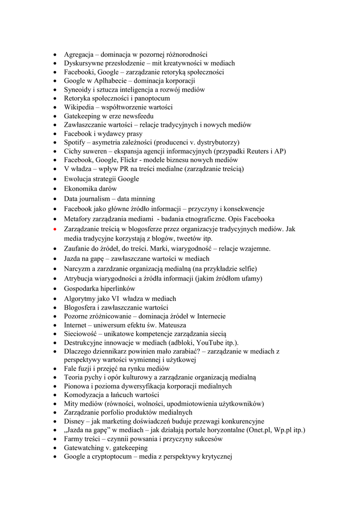 Agregacja – dominacja w pozornej różnorodności Dyskursywne przesłodzenie – mit kreatywności w mediach Facebooki, Google – zarządzanie retoryką społeczności Google w Aplhabecie – dominacja korporacji Syneoidy i sztucza inteligencja a rozwój mediów Retoryka społeczności i panoptocum Wikipedia – współtworzenie wartości Gatekeeping w erze newsfeedu Zawłaszczanie wartości – relacje tradycyjnych i nowych mediów Facebook i wydawcy prasy Spotify – asymetria zależności (producenci v. dystrybutorzy) Cichy suweren – ekspansja agencji informacyjnych (przypadki Reuters i AP) Facebook, Google, Flickr - modele biznesu nowych mediów V władza – wpływ PR na treści medialne (zarządzanie treścią) Ewolucja strategii Google Ekonomika darów Data journalism – data minning Facebook jako główne źródło informacji – przyczyny i konsekwencje Metafory zarządzania mediami - badania etnograficzne. Opis Facebooka Zarządzanie treścią w blogosferze przez organizacyje tradycyjnych mediów. Jak media tradycyjne korzystają z blogów, tweetów itp. Zaufanie do źródeł, do treści. Marki, wiarygodność – relacje wzajemne. Jazda na gapę – zawłaszczane wartości w mediach Narcyzm a zarzdzanie organizacją medialną (na przykładzie selfie) Atrybucja wiarygodności a źródła informacji (jakim źródłom ufamy) Gospodarka hiperlinków Algorytmy jako VI władza w mediach Blogosfera i zawłaszczanie wartości Pozorne zróżnicowanie – dominacja źródeł w Internecie Internet – uniwersum efektu św. Mateusza Sieciowość – unikatowe kompetencje zarządzania siecią Destrukcyjne innowacje w mediach (adbloki, YouTube itp.). Dlaczego dziennikarz powinien mało zarabiać? – zarządzanie w mediach z perspektywy wartości wymiennej i użytkowej Fale fuzji i przejęć na rynku mediów Teoria pychy i opór kulturowy a zarządzanie organizacją medialną Pionowa i pozioma dywersyfikacja korporacji medialnych Komodyzacja a łańcuch wartości Mity mediów (równości, wolności, upodmiotowienia użytkowników) Zarządzanie porfolio produktów medialnych Disney – jak marketing doświadczeń buduje przewagi konkurencyjne „Jazda na gapę” w mediach – jak działają portale horyzontalne (Onet.pl, Wp.pl itp.) Farmy treści – czynnii powsania i przyczyny sukcesów Gatewatching v. gatekeeping Google a cryptoptocum – media z perspektywy krytycznej    „Koniec pracy” (wpływ kosztów marginalnych) w dziennikarstwie Współtworzenie wartości Po co mediom publicznym CSR – cudze szaty organizacji medialnych