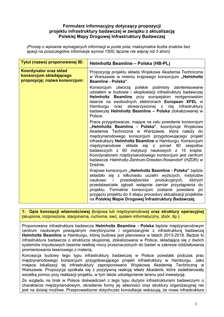 Formularz informacyjny dotyczący propozycji projektu infrastruktury badawczej w związku z aktualizacją Polskiej Mapy Drogowej Infrastruktury Badawczej (Proszę o wpisanie wymaganych informacji w puste pola; maksymalna liczba znaków bez spacji na poszczególne informacje wynosi 1500; łącznie nie więcej niż 5 stron) Tytuł (nazwa) proponowanej IB: Helmholtz Beamline – Polska (HB-PL) Koordynator oraz skład konsorcjum składającego propozycję; nazwa konsorcjum: Propozycję projektu składa Wojskowa Akademia Techniczna w Warszawie w imieniu krajowego konsorcjum „Helmholtz Beamline - Polska”. Konsorcjum utworzą polskie podmioty zainteresowane udziałem w budowie i eksploatacji infrastruktury badawczej Helmholtz Beamline przy europejskim rentgenowskim laserze na swobodnych elektronach European XFEL w Hamburgu oraz stowarzyszonej z nią infrastruktury badawczej Helmholtz Beamline – Polska zlokalizowanej w Polsce. Prace przygotowacze, mające na celu powołanie konsorcjum „Helmholtz Beamline - Polska”, koordynuje Wojskowa Akademia Techniczna w Warszawie, która należy do międzynarodowego konsorcjum przygotowującego projekt infrastruktury Helmholtz Beamline w Hamburgu. Konsorcjum międzynarodowe składa się z ponad 80 zespołów badawczych z 60 instytucji naukowych z 15 krajów. Koordynatorem międzynarodowego konsorcjum jest centrum badawcze Helmholtz-Zentrum-Dresden-Rosendorf (HZDR) w Dreźnie. Krajowe konsorcjum „Helmholtz Beamline - Polska” będzie składało się z kilkunastu uczelni wyższych, instytutów naukowo i przedsiębiorstw produkcyjnych, których przedstawiciele zgłosili wstępnie zamiar przystąpienia do projektu. Formalnie konsorcjum zostanie powołane po przyjęciu projektu do II etapu procedury aktualizacji projektów na Polskiej Mapie Drogowej Infrastruktury Badawczej. 1: Opis koncepcji własnościowej (krajowa lub międzynarodowa) oraz struktury operacyjnej (skupiona, rozproszona, stacjonarna, ruchoma, sieć, system informatyczny, zbiór, itp.): Proponowana infrastruktura badawcza Helmholtz Beamline - Polska będzie międzynarodowym centrum naukowym powiązanym merytorycznie i organizacyjnie z infrastrukturą badawczą Helmholtz Beamline w Hamburgu, której budowa jest planowana w latach 2013-2018. Będzie to infrastruktura badawcza o strukturze skupionej, zlokalizowana w Polsce, składająca się z dwóch systemów impulsowych laserów wielkiej mocy przeznaczonych do badań w zakresie oddziaływania promieniowania laserowego z materią. Koncepcja budowy tego typu infrastruktury badawczej w Polsce powstała podczas prac międzynarodowego konsorcjum przygotowującego projekt infrastruktury w Hamburgu. Jako miejsce lokalizacji tej infrastruktury zaproponowano Wojskową Akademię Techniczną w Warszawie. Propozycja spotkała się z pozytywną reakcją władz Akademii, które zadeklarowały wszelką pomoc przy realizacji projektu, w tym także udostępnienie terenu pod inwestycję. Ze względu na brak w Polsce doświadczeń z tego typu dużymi infrastrukturami badawczymi o charakterze międzynarodowym, określenie formy jej własności oraz struktury organizacyjnej nie jest na dzisiaj możliwe. Przeprowadzone dotychczas konsultacje wskazują, że nowa infrastruktura 1 może przystąpić do międzynarodowej spółki w ramach europejskiego konsorcjum ERIC, w skład, którego będzie także wchodziła planowana infrastruktura Helmholtz Beamline w Hamburgu oraz budowana obecnie wielka europejska infrastruktura badawcza Extreme Large Infrastructure ELI, składająca się z infrastruktury ELI - Beamline w Czechach, infrastruktury ELI – Atto na Węgrzech oraz infrastruktury ELI – NP w Rumunii. 2: Opis celów badawczych oraz programu badań: Z uwagi na merytoryczne połączenie planowanej nowej infrastruktury w Polsce z infrastrukturą Helmholtz Beamline w Niemczech, cele badawcze i program badań obydwu infrastruktur będą zbliżone. Zasadniczym obszarem badawczym nowej infrastruktury będzie oddziaływanie promieniowania laserowego z materią przy bardzo wysokich wartościach gęstości energii oraz intensywności promieniowania. Na infrastrukturze w Polsce prowadzone będą badania poprzedzające oraz uzupełniające badania prowadzone na infrastrukturze w Niemczech. Potrzeba takiej dodatkowej infrastruktury stowarzyszonej wynika z faktu, że badania planowane na infrastrukturze Helmholtz Beamline, z uwagi na bardzo wysokie koszty korzystania z wiązki lasera rentgenowskiego XFEL, będą musiały być poprzedzone wstępnymi badaniami wykonanymi za pomocą urządzeń o podobnych parametrach oraz w zbliżonych warunkach pomiarowych. Uwagę na konieczność takiego postępowania zwracano podczas spotkań roboczych przyszłych użytkowników infrastruktury European XFEL. Poza badaniami powiązanymi z pracami badawczymi planowanymi na infrastrukturze w Hamburgu, na infrastrukturze Helmholtz Beamline – Polska będą prowadzone także badania, które będą powiązane merytorycznie z badaniami planowanymi na infrastrukturach badawczych ELI. Dotyczy to w szczególności programu badań planowanych na infrastrukturze ELI - Beamline w Pradze, które dotyczą wytwarzania laserem wtórnego promieniowania elektromagnetycznego w krótkofalowym obszarze widma i strumieni cząstek naładowanych (secondary sources) oraz programu badań na infrastrukturze ELI - NP w Bukareszcie, które dotyczą zastosowania impulsowych laserów wielkiej mocy z fizyce jądrowej. 3: Opis unikalnego charakteru IB oraz potencjalnego wkładu w rozwój badań naukowych: Infrastruktura Helmholtz Beamline – Polska będzie unikalną infrastruktura badawczą w Europie i jedną z nielicznych na świecie. Analogicznie do infrastruktury w Hamburgu, będzie się składać z dwóch systemów impulsowych laserów wielkiej mocy i energii: femtosekundowego lasera o mocy w impulsie do 1 PW (1015 W) oraz nanosekundowego lasera o energii w impulsie do 1 kJ. Infrastruktura wyposażona będzie w stano