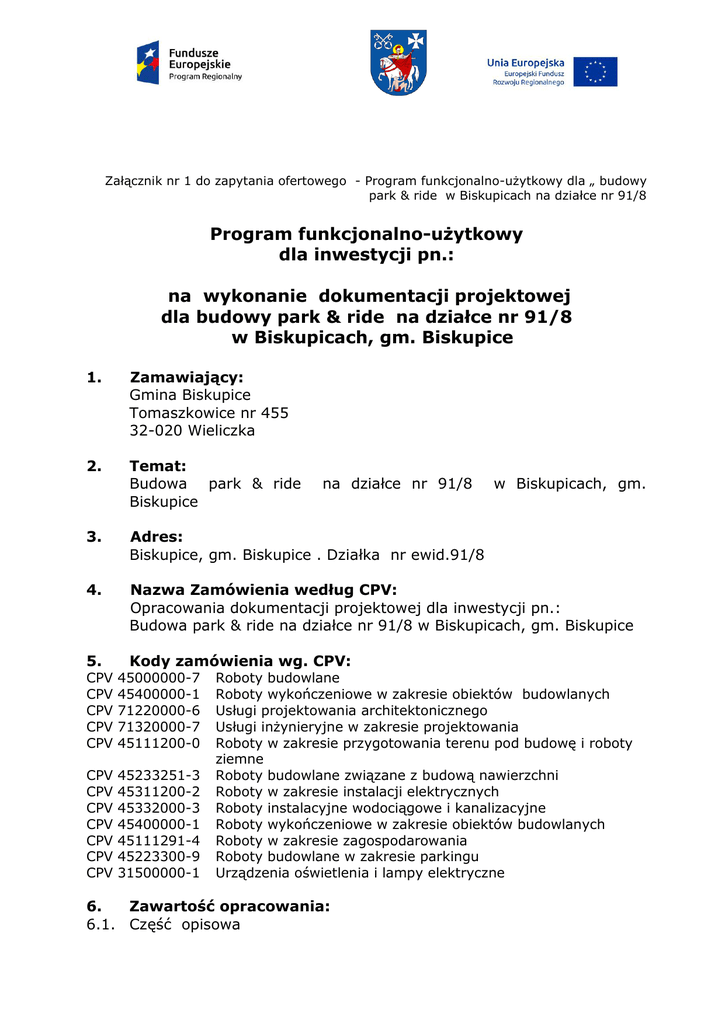 Załącznik nr 1 do zapytania ofertowego - Program funkcjonalno-użytkowy dla „ budowy park & ride w Biskupicach na działce nr 91/8 Program funkcjonalno-użytkowy dla inwestycji pn.: na wykonanie dokumentacji projektowej dla budowy park & ride na działce nr 91/8 w Biskupicach, gm. Biskupice 1. Zamawiający: Gmina Biskupice Tomaszkowice nr 455 32-020 Wieliczka 2. Temat: Budowa park & ride Biskupice 3. Adres: Biskupice, gm. Biskupice . Działka nr ewid.91/8 4. Nazwa Zamówienia według CPV: Opracowania dokumentacji projektowej dla inwestycji pn.: Budowa park & ride na działce nr 91/8 w Biskupicach, gm. Biskupice 5. Kody zamówienia wg. CPV: CPV CPV CPV CPV CPV 45000000-7 45400000-1 71220000-6 71320000-7 45111200-0 CPV CPV CPV CPV CPV CPV CPV 45233251-3 45311200-2 45332000-3 45400000-1 45111291-4 45223300-9 31500000-1 na działce nr 91/8 w Biskupicach, gm. Roboty budowlane Roboty wykończeniowe w zakresie obiektów budowlanych Usługi projektowania architektonicznego Usługi inżynieryjne w zakresie projektowania Roboty w zakresie przygotowania terenu pod budowę i roboty ziemne Roboty budowlane związane z budową nawierzchni Roboty w zakresie instalacji elektrycznych Roboty instalacyjne wodociągowe i kanalizacyjne Roboty wykończeniowe w zakresie obiektów budowlanych Roboty w zakresie zagospodarowania Roboty budowlane w zakresie parkingu Urządzenia oświetlenia i lampy elektryczne 6. Zawartość opracowania: 6.1. Część opisowa 6.2. Część informacyjna CZĘŚĆ OPISOWA PROGRAMU FUNKCJONALNO-UŻYTKOWEGO DLA BUDOWY PARK & RIDE DZIAŁCE NR 91/8 W BISKUPICACH, GM. BISKUPICE 1. Podstawa opracowania: ● ● ● Wypis z miejscowego planu zagospodarowania Gminy Biskupice Mapa zasadnicza terenu w skali 1:500 Projekt zagospodarowania terenu w skali 1:500 2. Opis ogólny przedmiotu zamówienia: NA Przedmiotem zamówienia jest wykonanie dokumentacji projektowej w zakresie inwestycji polegającej na budowie park & ride na działce nr 91/8 w Biskupicach, gm. Biskupice Zamówienie obejmuje: ●Wykonanie koncepcji programowo przestrzennej i zagospodarowania terenu ●Wykonanie projektu budowlanego i uzyskanie wynikających z przepisów opinii, uzgodnień i prawomocnego pozwolenia na budowę przedmiotu zamówienia. ●Wykonanie projektów wykonawczych dla projektowanej inwestycji ●Wykonanie przedmiaru robót i kosztorysów inwestorskich ● Wykonanie STWiORB ● Komplet dokumentacji projektowej na nośnikach elektronicznych ● Pełnienie nadzoru autorskiego przy realizacji inwestycji 3. Charakterystyczne parametry charakteryzujące wielkość inwestycji: Park & ride projektuje się na działce nr 91/8 w miejscowości Biskupice, działka zabudowana jest budynkiem ochotniczej straży pożarnej, od strony wschodniej przylega do drogi powiatowej a od strony południowej do drogi gminnej, od zachodu do boiska sportowego. Dojazd do projektowanej inwestycji w oparciu o przylegające drogi publiczne. Projektowana inwestycja pn.: park & ride ma być elementem systemu parkingów zlokalizowanych na terenie metropolii krakowskiej przy węzłach i przystankach transportu zbiorowego, umożliwiających pozostawienie samochodu i kontynuowanie podróży środkiem transportu publicznego oraz zwiększeniu atrakcyjności komunikacji zbiorowej i poruszania się transportem publicznym. W ramach przedmiotowej inwestycji na terenie działki nr 91/8 projektuje się place manewrowe, miejsca postojowe dla samochodów osobowych pozostawionych na czas podróży środkami transportu publicznego, chodniki i miejsca do wsiadania i wysiadania, co najmniej jedno miejsce postojowe dla środków transportu zbiorowego dla wsiadających i wysiadających, wiatę dla oczekujących na transport publiczny, zadaszone miejsca na bezpieczne przechowanie rowerów. Projektowany teren powinien być dostępny dla osób niepełnosprawnych. Place, parkingi i chodniki o nawierzchni utwardzonej wyposażone w kanalizacją opadową z odprowadzeniem ścieków do zbiornika na wody opadowe. Zjazd na teren parkingu powinien mieć kategorię i parametry zjazdu publicznego. Teren powinien być oświetlony, wyposażony w monitoring i oznakowanie w oparciu o projekt graficzny znaków jednolity dla całej Metropolii. 3.1. Charakterystyczne parametry określające wielkość inwestycji: Parking park & ride projektowany jest na terenie działki budowlanej nr 91/8 w miejscowości Biskupice, przedmiotowa inwestycja powinna zapewnić podróżnym maksymalny i wygodny dostęp do środków transportu zbiorowego. W ramach inwestycji należy zapewnić: ● Zatoka postojowa umożliwiająca zatrzymanie się przynajmniej jednego pojazdu dla wysiadających i wsiadających ● Peron dla wysiadających i wsiadających przy zatoce park & ride dostępny dla niepełnosprawnych ● Miejsca zadaszone dla podróżnych: wiata zadaszenia dla podróżnych, z miejscami do siedzenia dla podróżnych ● Zatoka postojowa umożliwiająca zatrzymanie się na krótko samochodu, pożegnanie i wysiadanie przynajmniej dla jednego samochodu Kiss & Ride ● Miejsca postojowe dla samochodów o wym. 2,50 x 5,0 m, / 3,6 x 5,0 dla niepełnosprawnych/, nawierzchnia utwardzona ● Miejsca postojowe dla rowerów w tym: wiata zadaszenia, stojaki rowerowe w kształcie odwróconego U ● Oznakowania parkingu: wjazd i wyjazd, miejsca postojowe, itp. ● Oświetlenie parkingu i terenu / technologia energooszczędna/ ● Likwidacja barier dla niepełnosprawnych / miejsca postojowe dla samochodów dla osób z niepełnosprawnością/ ● Infrastruktura zwiększająca bezpieczeństwo użytkowników: /progi zwalniające, wyniesione przejścia dla pieszych ● Infrastruktura umożliwiająca utrzymanie porządku ● Zieleń o właściwościach izolacyjnych i dekoracyjnych ● Przebudowa zjazdów z drogi publicznej 3.2. Lp. Wykaz realizowanych obiektów w zakresie projektu i zamówienia: Wykaz realizowanych obiektów Pow. użytkowa / szt lub m² / (orientacyjnie) 1. Zatoka postojowa umożliwiająca zatrzyma