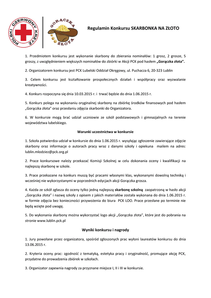 Regulamin Konkursu SKARBONKA NA ZŁOTO 1. Przedmiotem konkursu jest wykonanie skarbony do zbierania nominałów: 1 grosz, 2 grosze, 5 groszy, z uwzględnieniem większych nominałów do zbiórki w Akcji PCK pod hasłem „Gorączka złota”. 2. Organizatorem konkursu jest PCK Lubelski Oddział Okręgowy, ul. Puchacza 6, 20-323 Lublin 3. Celem konkursu jest kształtowanie prospołecznych działań i współpracy oraz wyzwalanie kreatywności. 4. Konkurs rozpoczyna się dnia 10.03.2015 r. i trwać będzie do dnia 1.06.2015 r. 5. Konkurs polega na wykonaniu oryginalnej skarbony na zbiórkę środków finansowych pod hasłem „Gorączka złota” oraz przesłaniu zdjęcia skarbonki do Organizatora. 6. W konkursie mogą brać udział uczniowie ze szkół podstawowych i gimnazjalnych na terenie województwa lubelskiego. Warunki uczestnictwa w konkursie 1. Szkoła potwierdza udział w konkursie do dnia 1.06.2015 r. wysyłając zgłoszenie zawierające zdjęcie skarbony oraz informacje o autorach pracy wraz z danymi szkoły i opiekuna mailem na adres: [email protected] 2. Prace konkursowe należy przekazać Komisji Szkolnej w celu dokonania oceny i kwalifikacji na najlepszą skarbonę w szkole. 3. Prace przekazane na konkurs muszą być pracami własnymi klas, wykonanymi dowolną techniką i wcześniej nie wykorzystanymi w poprzednich edycjach akcji Gorączka grosza. 4. Każda ze szkół zgłasza do oceny tylko jedną najlepszą skarbonę szkolną zaopatrzoną w hasło akcji „Gorączka złota” i nazwę szkoły z opisem z jakich materiałów została wykonana do dnia 1.06.2015 r. w formie zdjęcia bez konieczności przywożenia do biura PCK LOO. Prace przesłane po terminie nie będą wzięte pod uwagę. 5. Do wykonania skarbony można wykorzystać logo akcji „Gorączka złota”, które jest do pobrania na stronie www.lublin.pck.pl Wyniki konkursu i nagrody 1. Jury powołane przez organizatora, spośród zgłoszonych prac wyłoni laureatów konkursu do dnia 13.06.2015 r. 2. Kryteria oceny prac: zgodność z tematyką, estetyka pracy i oryginalność, promujące akcję PCK, przydatne do prowadzenia zbiórek w szkołach. 3. Organizator zapewnia nagrody za przyznane miejsce I, II i III w konkursie. 4. Jury ma prawo do wytypowania dodatkowych nagród, jak również prawo do nieprzyznania nagród w przypadku zbyt małej ilości przekazanych prac. Postanowienia końcowe 1. Przekazując pracę na konkurs, uczestnik zgadza się na ekspozycję pracy oraz na opublikowanie fotografii na stronie internetowej PCK. 2. Autorzy zgadzają się na publikowanie zwycięskich prac i fotografii na innych polach eksploatacji. 3. Biorąc udział w konkursie, uczestnik akceptuje regulamin. 4. Wszelkie wątpliwości dotyczące zasad Konkursu, postanowień jego Regulaminu i interpretacji rozstrzyga Organizator. 5. Organizator jest uprawniony do zmiany postanowień niniejszego Regulaminu, o ile nie wpłynie to na pogorszenie warunków uczestnictwa w Konkursie. Dotyczy to w szczególności zmian terminów poszczególnych czynności konkursowych oraz zmian specyfikacji nagrody. Zmieniony Regulamin obowiązuje od czasu opublikowania go na stronie lublin.pck.pl