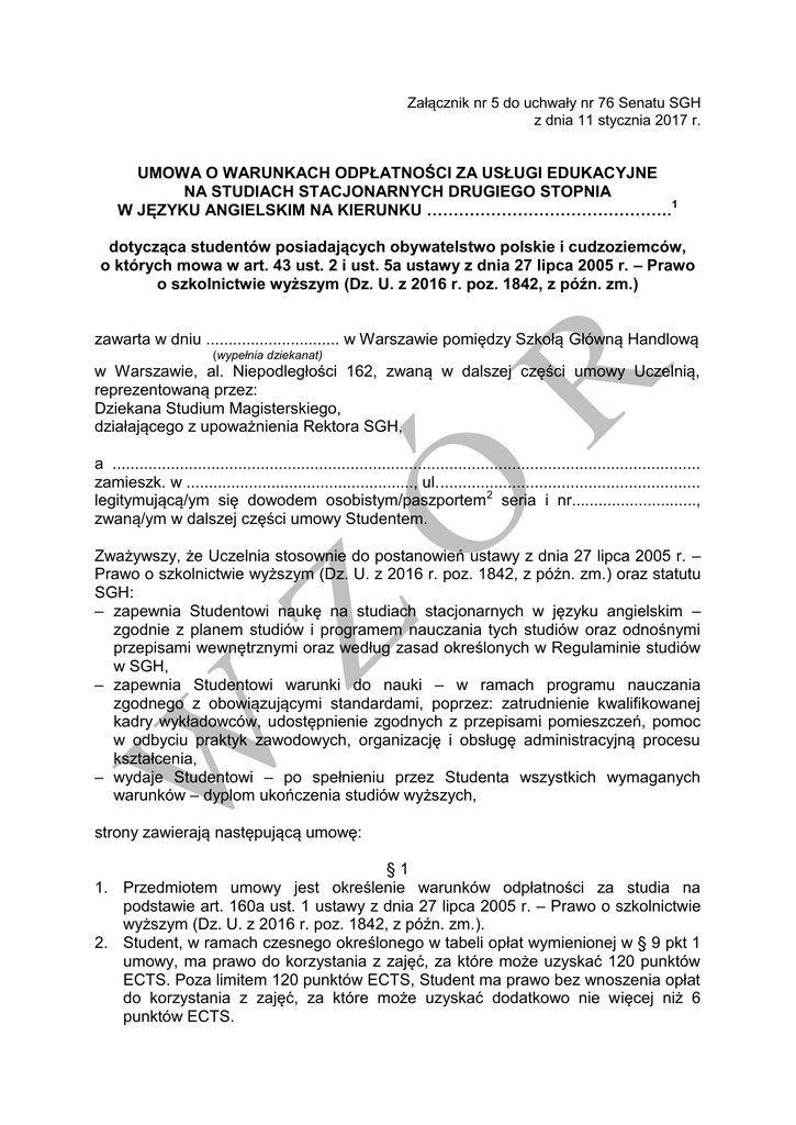 Załącznik nr 5 do uchwały nr 76 Senatu SGH z dnia 11 stycznia 2017 r. UMOWA O WARUNKACH ODPŁATNOŚCI ZA USŁUGI EDUKACYJNE NA STUDIACH STACJONARNYCH DRUGIEGO STOPNIA W JĘZYKU ANGIELSKIM NA KIERUNKU ……………………………………….1 dotycząca studentów posiadających obywatelstwo polskie i cudzoziemców, o których mowa w art. 43 ust. 2 i ust. 5a ustawy z dnia 27 lipca 2005 r. – Prawo o szkolnictwie wyższym (Dz. U. z 2016 r. poz. 1842, z późn. zm.) zawarta w dniu .............................. w Warszawie pomiędzy Szkołą Główną Handlową (wypełnia dziekanat) w Warszawie, al. Niepodległości 162, zwaną w dalszej części umowy Uczelnią, reprezentowaną przez: Dziekana Studium Magisterskiego, działającego z upoważnienia Rektora SGH, a ................................................................................................................................... zamieszk. w ..................................................., ul. .......................................................... legitymującą/ym się dowodem osobistym/paszportem 2 seria i nr............................, zwaną/ym w dalszej części umowy Studentem. Zważywszy, że Uczelnia stosownie do postanowień ustawy z dnia 27 lipca 2005 r. – Prawo o szkolnictwie wyższym (Dz. U. z 2016 r. poz. 1842, z późn. zm.) oraz statutu SGH: – zapewnia Studentowi naukę na studiach stacjonarnych w języku angielskim – zgodnie z planem studiów i programem nauczania tych studiów oraz odnośnymi przepisami wewnętrznymi oraz według zasad określonych w Regulaminie studiów w SGH, – zapewnia Studentowi warunki do nauki – w ramach programu nauczania zgodnego z obowiązującymi standardami, poprzez: zatrudnienie kwalifikowanej kadry wykładowców, udostępnienie zgodnych z przepisami pomieszczeń, pomoc w odbyciu praktyk zawodowych, organizację i obsługę administracyjną procesu kształcenia, – wydaje Studentowi – po spełnieniu przez Studenta wszystkich wymaganych warunków – dyplom ukończenia studiów wyższych, strony zawierają następującą umowę: §1 1. Przedmiotem umowy jest określenie warunków odpłatności za studia na podstawie art. 160a ust. 1 ustawy z dnia 27 lipca 2005 r. – Prawo o szkolnictwie wyższym (Dz. U. z 2016 r. poz. 1842, z późn. zm.). 2. Student, w ramach czesnego określonego w tabeli opłat wymienionej w § 9 pkt 1 umowy, ma prawo do korzystania z zajęć, za które może uzyskać 120 punktów ECTS. Poza limitem 120 punktów ECTS, Student ma prawo bez wnoszenia opłat do korzystania z zajęć, za które może uzyskać dodatkowo nie więcej niż 6 punktów ECTS. §2 1. Student studiujący na studiach stacjonarnych drugiego stopnia w języku angielskim na kierunku ……………………………………….. 1, zobowiązuje się do terminowego uiszczania, zgodnie z postanowieniami niniejszej umowy, opłat określonych w tabeli opłat, wymienionej w § 9 pkt 1 umowy. 2. Poza opłatami, o których mowa w ust. 1, Student zobowiązany jest wnosić opłaty, których wysokość i warunki wnoszenia określa zarządzenie Rektora nr … z dnia ……………. w sprawie odpłatności za niektóre dokumenty z przebiegu studiów wydawane w Szkole Głównej Handlowej w Warszawie3. 1. 2. 3. 4. 5. 6. 7. 8. §3 Opłaty, o których mowa w § 2 ust. 1,obowiązują przez czas trwania umowy. Opłata za naukę na studiach, o których mowa w § 2 ust. 1, odzwierciedla koszt przygotowania i realizacji programu studiów. W przypadku realizacji programu studiów w okresie krótszym niż planowy, opłata podlega uiszczeniu w całości. Na udokumentowany wniosek Studenta, w sytuacjach uzasadnionych jego trudną sytuacją materialną, Dziekan może wyrazić zgodę na przesunięcie terminu płatności, jednak termin płatności nie może wykraczać poza okres studiów. Student może wnieść opłatę w ratach, w wysokości i terminach określonych w tabeli opłat, o której mowa w § 9. Wpłacając kolejną ratę student może wskazać okres, którego rata dotyczy. W przypadku braku wskazania okresu, którego rata dotyczy, a także w przypadku zalegania studenta z opłatami, o zaliczeniu poszczególnych wpłat decyduje Uczelnia. Student zobowiązany jest do okazania dowodu wniesienia opłaty na wezwanie upoważnionych pracowników Uczelni. Za datę wniesienia opłaty uważa się datę zaksięgowania wpłaconej kwoty na wskazanym w systemie Wirtualny Dziekanat, właściwym, indywidualnym rachunku Studenta prowadzonym w ramach konta bankowego Uczelni. Każdorazowe opóźnienie w dokonaniu opłaty lub jej części, albo wniesienie jej w niepełnej kwocie, skutkuje naliczeniem przez Uczelnię odsetek ustawowych za opóźnienie od zaległej kwoty. Kwoty należne Uczelni, wynikające z niniejszej umowy, Student wnosi bez wezwania w terminach określonych w umowie, tabeli opłat lub decyzji właściwego organu Uczelni, na wskazany w systemie Wirtualny Dziekanat, właściwy, indywidualny rachunek Studenta prowadzony w ramach konta bankowego Uczelni, z zaznaczeniem tytułu płatności, w walucie określonej we właściwej tabeli opłat. Na wniosek Studenta Uczelnia wystawia fakturę opiewającą na kwotę wniesionej opłaty. Wniosek należy złożyć do właściwego Dziekanatu w terminie wynikającym z przepisów prawa podatkowego. §4 1. W przypadku opóźnienia we wnoszeniu opłat i płatności określonych w § 2 trwającego dłużej niż 30 dni Dziekan może podjąć decyzję o skreśleniu Studenta z listy studentów. 2. Wznowienie studiów i ponowny wpis na listę studentów wymaga zawarcia nowej umowy, zgodnie ze wzorem obowiązującym na dany semestr. 3. Warunkiem zawarcia umowy, o której mowa w ust. 2, jest uregulowanie wszystkich zaległości w opłatach wraz z odsetkami i wniesienie opłaty za 4. 5. 6. 7. postępowanie związane ze wznowieniem studiów w kwocie określonej na dany rok akademicki zgodnie z przepisami obowiązującymi w Uczelni. Rozwiązanie niniejszej u