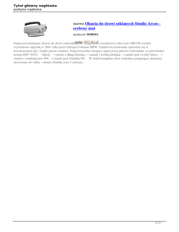 Tytuł główny nagłówka podtytuł nagłówka nazwa Okucia do drzwi szklanych Studio Arcos srebrny mat producent: DORMA cena: Oryginalne 952.02 zł wzornictwo całej serii ARCOS zostało Najnowocześniejsze okucie do drzwi całoszklanych. wyróżnione nagrodą w 2001 roku przez Design Centrum NRW. Zamek ten doskonale sprawdza się w nowoczesnym jak i tradycyjnym wnętrzu. Niepowtarzalny design o najwyższej jakości wykonania, co potwierdza norma DIN 18251. Opcje: • zamek z długą klamką, • zamek z krótką klamką, • zamek pod zwykły klucz, • zamek z zamknięciem WC, • zamek pod wkładkę PZ. W skład kompletu okuć wchodzą następujące elementy mocowane do szkła - zamek, klamka oraz 2 zawiasy. 1/1