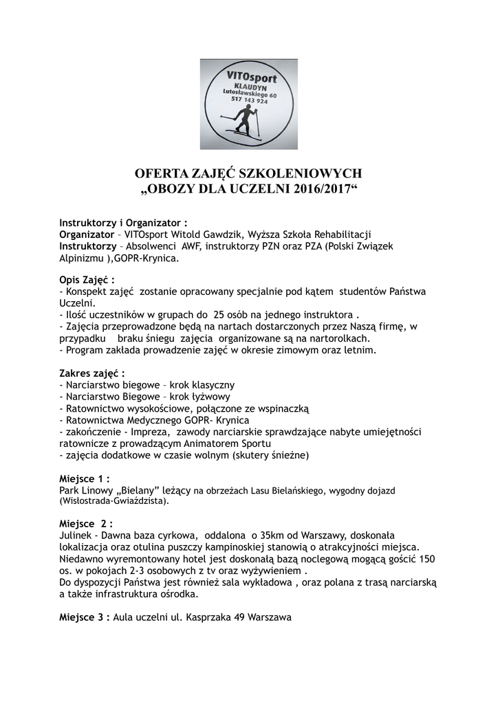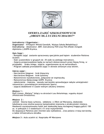 OFERTA ZAJĘĆ SZKOLENIOWYCH „OBOZY DLA UCZELNI 2016/2017“ Instruktorzy i Organizator : Organizator – VITOsport Witold Gawdzik, Wyższa Szkoła Rehabilitacji Instruktorzy – Absolwenci AWF, instruktorzy PZN oraz PZA (Polski Związek Alpinizmu ),GOPR-Krynica. Opis Zajęć : - Konspekt zajęć zostanie opracowany specjalnie pod kątem studentów Państwa Uczelni. - Ilość uczestników w grupach do 25 osób na jednego instruktora . - Zajęcia przeprowadzone będą na nartach dostarczonych przez Naszą firmę, w przypadku braku śniegu zajęcia organizowane są na nartorolkach. - Program zakłada prowadzenie zajęć w okresie zimowym oraz letnim. Zakres zajęć : - Narciarstwo biegowe – krok klasyczny - Narciarstwo Biegowe – krok łyżwowy - Ratownictwo wysokościowe, połączone ze wspinaczką - Ratownictwa Medycznego GOPR- Krynica - zakończenie - Impreza, zawody narciarskie sprawdzające nabyte umiejętności ratownicze z prowadzącym Animatorem Sportu - zajęcia dodatkowe w czasie wolnym (skutery śnieżne) Miejsce 1 : Park Linowy „Bielany” leżący na obrzeżach Lasu Bielańskiego, wygodny dojazd (Wisłostrada-Gwiaździsta). Miejsce 2 : Julinek - Dawna baza cyrkowa, oddalona o 35km od Warszawy, doskonała lokalizacja oraz otulina puszczy kampinoskiej stanowią o atrakcyjności miejsca. Niedawno wyremontowany hotel jest doskonałą bazą noclegową mogącą gościć 150 os. w pokojach 2-3 osobowych z tv oraz wyżywieniem . Do dyspozycji Państwa jest również sala wykładowa , oraz polana z trasą narciarską a także infrastruktura ośrodka. Miejsce 3 : Aula uczelni ul. Kasprzaka 49 Warszawa Opis Szkolenia POSZCZEGÓLNY DZIEŃ / MIEJSCE OPIS ZAJĘĆ DANEGO DNIA / TEMATYKA Godz. 9.00-13.00 Ćwiczenia i pokaz Dzień I* - miejsce 1 Ratownictwo wysokościowe : Zajęcia w Parku Linowym „Bielany” godz. 9.00-18.00 ( 8,5 - Wspinaczka, technika mocowań, technika wiązań h zegarowej) Godz. 13.30-18:00 Pokaz i wykład Ratownictwo i auto ratownictwo w technikach linowych : - Pierwsza pomoc medyczna - Pomoc poszkodowanemu *Dojazd we własnym zakresie, w trakcie zajęć ognisko i obiadokolacja( godz. 13:00-14:00) Dzień II - miejsce 3 Wykład na uczelni - Wybrane zagadnienia BTLS ( 4,5 h zegarowej ) TEMATYKA : - Urazy głowy - Urazy kręgosłupa - Urazy kończyn - Hipotermia Dzień III – miejsce 2 Zajęcia w Julinku K/Leszna ( 9h zegarowych ) godz. 7.30-8.00 zbiórka pod Uczelnią godz. 8.30-9.15 przyjazd do Julinka, zakwaterowanie godz. 9.30-13.30 Zasady obowiązujące w ratownictwie górskim : - Ustawa o bezpieczeństwie w górach i na zorganizowanych terenach narciarskich - Jazda na nartach (krok klasyczny) godz. 13.30-14.00 obiad godz. 14.00-19.00 Ratownictwo narciarskie cz. 1 Zajęcia praktyczne przy użyciu sprzętu ratownictwa zimowego GOPR - Sprzęt narciarski - Pomoc poszkodowanemu na stoku. godz. 19.00 czas wolny (kolacja, ognisko) Dzień IV – Julinek (8 h zegarowych ) godz. 7.30-8.00 śniadanie godz. 8.00-13.00 Ratownictwo narciarskie cz. 2 Zajęcia praktyczne przy użyciu sprzętu ratownictwa zimowego GOPR Zasady działania jednostek TOPR i GOPR - Organizacja - Skutery śnieżne, zabezpieczenie poszkodowanych w transporcie. - Narciarstwo biegowe (krok dowolny, łyżwowy) godz. 13.00-13.30 Obiad godz. 13.30-16.30 Test sprawnościowy w formie zawodów godz. 16.30-17.00 Wykwaterowanie godz. 17.00-18.00 Powrót pod Uczelnię Transport : Zapewniamy transport w obie strony (dzień III i IV), autobusem klasy luks z pod Uczelni. Tabela godzinowa: Godziny zegarowe Godziny lekcyjne Miejsce 1 8,5 h 11,333 Miejsce 2 / dzień 3 i 4 17 h 22,667 Miejsce 3 4,5 h 6 Razem 30 h 40 h Tabela Cenowa cena obejmuje : transport, nocleg, wyżywienie, instruktorów, zajęcia narciarskie oraz szkolenie, zakończenie-zawody Cena/ilość osób 1 os Cena za 3 dni ( 1 nocleg ) 600 zł