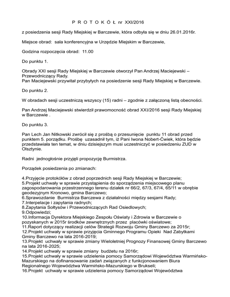 P R O T O K Ó Ł nr XXI/2016 z posiedzenia sesji Rady Miejskiej w Barczewie, która odbyła się w dniu 26.01.2016r. Miejsce obrad: sala konferencyjna w Urzędzie Miejskim w Barczewie, Godzina rozpoczęcia obrad: 11.00 Do punktu 1. Obrady XXI sesji Rady Miejskiej w Barczewie otworzył Pan Andrzej Maciejewski – Przewodniczący Rady. Pan Maciejewski przywitał przybyłych na posiedzenie sesji Rady Miejskiej w Barczewie. Do punktu 2. W obradach sesji uczestniczą wszyscy (15) radni – zgodnie z załączoną listą obecności. Pan Andrzej Maciejewski stwierdził prawomocność obrad XXI/2016 sesji Rady Miejskiej w Barczewie . Do punktu 3. Pan Lech Jan Nitkowski zwrócił się z prośbą o przesunięcie punktu 11 obrad przed punktem 5. porządku. Prośbę uzasadnił tym, iż Pani Iwona Nobert-Ćwiek, która będzie przedstawiała ten temat, w dniu dzisiejszym musi uczestniczyć w posiedzeniu ZUD w Olsztynie. Radni jednogłośnie przyjęli propozycję Burmistrza. Porządek posiedzenia po zmianach: 4.Przyjęcie protokółów z obrad poprzednich sesji Rady Miejskiej w Barczewie; 5.Projekt uchwały w sprawie przystąpienia do sporządzenia miejscowego planu zagospodarowania przestrzennego terenu działek nr 66/2, 67/3, 67/4, 65/11 w obrębie geodezyjnym Kronowo, gmina Barczewo; 6.Sprawozdanie Burmistrza Barczewa z działalności między sesjami Rady; 7.Interpelacje i zapytania radnych; 8.Zapytania Sołtysów i Przewodniczących Rad Osiedlowych; 9.Odpowiedzi; 10.Informacja Dyrektora Miejskiego Zespołu Oświaty i Zdrowia w Barczewie o pozyskanych w 2015r środków zewnętrznych przez placówki oświatowe; 11.Raport dotyczący realizacji celów Strategii Rozwoju Gminy Barczewo za 2015r; 12.Projekt uchwały w sprawie przyjęcia Gminnego Programu Opieki Nad Zabytkami Gminy Barczewo na lata 2016-2019; 13.Projekt uchwały w sprawie zmiany Wieloletniej Prognozy Finansowej Gminy Barczewo na lata 2016-2025; 14.Projekt uchwały w sprawie zmiany budżetu na 2016r; 15.Projekt uchwały w sprawie udzielenia pomocy Samorządowi Województwa WarmińskoMazurskiego na dofinansowanie zadań związanych z funkcjonowaniem Biura Regionalnego Województwa Warmińsko-Mazurskiego w Brukseli; 16.Projekt uchwały w sprawie udzielenia pomocy Samorządowi Województwa Warmińsko-Mazurskiego na potrzeby realizacji Planu Cyfrowego 2025 dla Warmii i Mazur; 17.Sprawy różne i wolne wnioski. Do punktu 4. Protokół z obrad XIX/15 sesji Rady Miejskiej w Barczewie przyjęty został jednogłośnie(15); Protokół z obrad XX/16 sesji Rady Miejskiej w Barczewie przyjęty został jednogłośnie(15); Pan Andrzej Maciejewski – Przewodniczący Rady Miejskiej w Barczewie i Pan Lech Jan Nitkowski Burmistrz Barczewa wręczyli okolicznościowy dyplom dla Państwa Eweliny Storoniańskiej i Adama Jaworskiego za zdobycie I miejsca w ogólnopolskim konkursie Mister Camping 2015. Rada udzieliła głosu dla Dyrektora Powiatowej Służby Drogowej Panu Arturowi Bal. Pan Artur Bal: -dziękuję za zaproszenie. Myślę, że spotkania takie jak dzisiejsze są dobrym sposobem na kontaktowanie się ze sobą. Drogi są burzliwym tematem. Przygotowałem odpowiedź na zapytanie Pana Przewodniczącego. Co roku staramy się robić podsumowanie prac wykonywanych przez cały rok. Pani Starosta przekazała dla wszystkich gmin powiatu zestawienia prac, które niezbędne są do wykonania na danych drogach . Pani Starosta ma nadzieję, że pomożecie Państwo wybrać z tej listy prace najbardziej niezbędne do wykonania na terenie każdej Gminy oraz wskazanie kolejności ich wykonania. Pan Bogusław Matłoka: -dużo korzystam z dróg powiatowych. Od kilku lat panuje taki zwyczaj, że zwracamy się do Państwa o ich naprawę i one są jakoś tam naprawiane. Niestety wystarcza to na krótko. Droga Szynowo-Tuławki nadaje się znów do naprawy i wydaje mi się, że łata na łacie nic nie daje. Czy nie można zastosować jakiejś innej technologii? Pan Artur Bal: -niestety, drogi bitumiczne, które są na tym terenie, póki nie zostaną przebudowane nie zmieni to ich przepustowości przejazdów. Póki co zostaje tylko i wyłącznie ich łatanie. Po tych drogach już nie może poruszać się ciężki sprzęt. Należy je przebudować, na co potrzebne są potężne środki. Drogi są spękane. Jedyne wyjście to przebudowa bo wykonanie nakładki na jednym odcinku niczego nie załatwia. Tam gdzie jest to możliwe realizowane są przebudowy. Pani Balbina Buras: -otrzymałam odpowiedź od Pana zastępcy. Radosty odcięte były od świata. 200 metrowy odcinek jest całkowicie zdewastowany a Pana zastępca odpisał mi, że droga ta jest na bieżąco naprawiana. Tam przecież nie ma asfaltu. Ja proszę o utwardzenie tych 200 metrów drogi. Dyrektor Bal: -jest z 2008r porozumienie Gminy z powiatem o utrzymaniu takich dróg; Pan Lech Nitkowski: -dlatego też podtrzymujemy nasze wypowiedzenie . Nie jest stać nas na pobudowanie drogi; Pan Kazimierz Kozon: -czy PSD wydało zezwolenie na przejazd po tych drogach pojazdów ponad 45 tonowych na trasie Barczewo-Klucznik.Tam stoi znak dopuszczający przejazd 10 ton. Konkretnie chodzi o pojazdy ALDES-y. Pytałem się na Komisariacie Policji. Nasza Policja takiego zezwolenia od Państwa nie posiada. Dyrektor Bal: -wydajemy zezwolenia ale nie wiem czy akurat tam. Jeśli Policja nie posiada takiego pisma to możliwe jest, że takowego nie wydawaliśmy. Pan Kazimierz Kozon: -wycinka drzew w Jedzbarku i zniwelowanie skarpy. Ten temat przerabiamy 6 miesięcy. Dyrektor Bal: -drzewa będą wycięte. Pan Kozon: -przebudowa drogi w Jedzbarku; Pan Artur Bal: -nie mam do tej pory tego pisma. To powinno być na tej liście skierowanej do Burmistrza Barczewa. Pan Kazimierz Kozon: -czy jest spisana umowa z ALDES-ą na wypłatę odszkodowań za drogi? Pan Artur Bal: -ze Starostwem nie jest podpisana taka umowa. Do Komisariatu Policji w Barczewie zwracaliśmy się wielokrotnie o objęcie nadzorem dróg. Pan Kazimierz Kozon: -stan drogi Mokiny – B