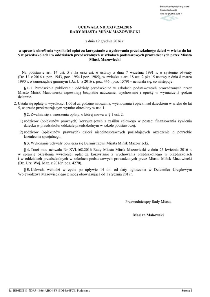 Elektronicznie podpisany przez: Marian Makowski dnia 19 grudnia 2016 r. UCHWAŁA NR XXIV.234.2016 RADY MIASTA MIŃSK MAZOWIECKI z dnia 19 grudnia 2016 r. w sprawie określenia wysokości opłat za korzystanie z wychowania przedszkolnego dzieci w wieku do lat 5 w przedszkolach i w oddziałach przedszkolnych w szkołach podstawowych prowadzonych przez Miasto Mińsk Mazowiecki Na podstawie art. 14 ust. 5 i 5a oraz art. 6 ustawy z dnia 7 września 1991 r. o systemie oświaty (Dz. U. z 2016 r. poz. 1943, poz. 1954 i poz. 1985), w związku z art. 18 ust. 2 pkt 15 ustawy z dnia 8 marca 1990 r. o samorządzie gminnym (Dz. U. z 2016 r. poz. 446 i poz. 1579) – uchwala się, co następuje: § 1. 1. Przedszkola publiczne i oddziały przedszkolne w szkołach podstawowych prowadzonych przez Miasto Mińsk Mazowiecki zapewniają bezpłatne nauczanie, wychowanie i opiekę w wymiarze 5 godzin dziennie. 2. Ustala się opłatę w wysokości 1,00 zł za godzinę nauczania, wychowania i opieki nad dzieckiem w wieku do lat 5, w czasie przekraczającym wymiar określony w ust. 1. § 2. Zwalnia się z wnoszenia opłaty, o której mowa w § 1 ust. 2: 1) rodziców (opiekunów prawnych) korzystających z zasiłku celowego w postaci finansowania żywienia dziecka w przedszkolu/ oddziale przedszkolnym w szkole podstawowej. 2) rodziców (opiekunów prawnych) dzieci niepełnosprawnych posiadających orzeczenie o potrzebie kształcenia specjalnego. § 3. Wykonanie uchwały powierza się Burmistrzowi Miasta Mińsk Mazowiecki. § 4. Traci moc uchwała Nr XVI.168.2016 Rady Miasta Mińsk Mazowiecki z dnia 25 kwietnia 2016 r. w sprawie określenia wysokości opłat za korzystanie z wychowania przedszkolnego w przedszkolach i w oddziałach przedszkolnych w szkołach podstawowych prowadzonych przez Miasto Mińsk Mazowiecki (Dz. Urz. Woj. Maz. z 2016r. poz. 4270). § 5. Uchwała wchodzi w życie po upływie 14 dni od daty ogłoszenia w Dzienniku Urzędowym Województwa Mazowieckiego z mocą obowiązującą od 1 stycznia 2017r. Przewodniczący Rady Miasta Marian Makowski Id: BB6D8111-7DF5-4E66-ABC4-FF11D14A4FC6. Podpisany Strona 1