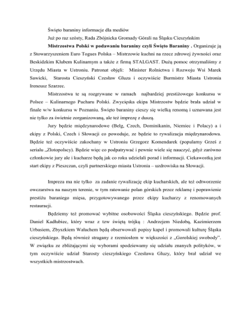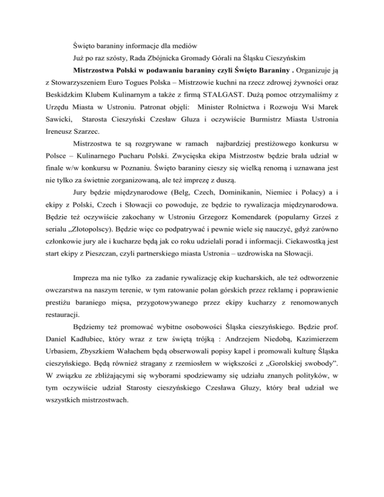 Święto baraniny informacje dla mediów Już po raz szósty, Rada Zbójnicka Gromady Górali na Śląsku Cieszyńskim Mistrzostwa Polski w podawaniu baraniny czyli Święto Baraniny . Organizuje ją z Stowarzyszeniem Euro Togues Polska – Mistrzowie kuchni na rzecz zdrowej żywności oraz Beskidzkim Klubem Kulinarnym a także z firmą STALGAST. Dużą pomoc otrzymaliśmy z Urzędu Miasta w Ustroniu. Patronat objęli: Sawicki, Minister Rolnictwa i Rozwoju Wsi Marek Starosta Cieszyński Czesław Gluza i oczywiście Burmistrz Miasta Ustronia Ireneusz Szarzec. Mistrzostwa te są rozgrywane w ramach najbardziej prestiżowego konkursu w Polsce – Kulinarnego Pucharu Polski. Zwycięska ekipa Mistrzostw będzie brała udział w finale w/w konkursu w Poznaniu. Święto baraniny cieszy się wielką renomą i uznawana jest nie tylko za świetnie zorganizowaną, ale też imprezę z duszą. Jury będzie międzynarodowe (Belg, Czech, Dominikanin, Niemiec i Polacy) a i ekipy z Polski, Czech i Słowacji co powoduje, ze będzie to rywalizacja międzynarodowa. Będzie też oczywiście zakochany w Ustroniu Grzegorz Komendarek (popularny Grześ z serialu „Złotopolscy). Będzie więc co podpatrywać i pewnie wiele się nauczyć, gdyż zarówno członkowie jury ale i kucharze będą jak co roku udzielali porad i informacji. Ciekawostką jest start ekipy z Pieszczan, czyli partnerskiego miasta Ustronia – uzdrowiska na Słowacji. Impreza ma nie tylko za zadanie rywalizację ekip kucharskich, ale też odtworzenie owczarstwa na naszym terenie, w tym ratowanie polan górskich przez reklamę i poprawienie prestiżu baraniego mięsa, przygotowywanego przez ekipy kucharzy z renomowanych restauracji. Będziemy też promować wybitne osobowości Śląska cieszyńskiego. Będzie prof. Daniel Kadłubiec, który wraz z tzw świętą trójką : Andrzejem Niedobą, Kazimierzem Urbasiem, Zbyszkiem Wałachem będą obserwowali popisy kapel i promowali kulturę Śląska cieszyńskiego. Będą również stragany z rzemiosłem w większości z „Gorolskiej swobody”. W związku ze zbliżającymi się wyborami spodziewamy się udziału znanych polityków, w tym oczywiście udział Starosty cieszyńskiego Czesława Gluzy, który brał udział we wszystkich mistrzostwach. Rozpoczynamy punktualnie o godz. 12 – strzałem z armaty i pistoletów oraz głosem trombity – tu gwiazdą będzie nasz 8 - letni Kacper Darmstaedter z Ustronia. Gwiazdami tegorocznej BARANINY będą: Jean Alfons Ange Bos – Szef EURO-Togues – przewodniczący jury, kultowa postać w świecie kulinarnym Wolfgang Menge - Prezes Euro-Toques Niemcy, Vice Prezes ETI (Euro-Toques International (ETI), Kucharska Wspólnota Europejska tworzy ponad 7000 europejskich kucharzy i szefów kuchni w Europie i na Świecie. Utworzony w 1986 r. wokół kilku "wielkich nazwisk", Romeyer Pierre i Paul Bocuse, wizjonerów, którzy już byli świadomi ryzyka nadużyć żywności. Carlos Tejera Gonzales – znany już z ubiegłych lat. Wybitna osobowość, barwna postać. Piotr Szczygielski – znakomity kucharz, współorganizator (po raz drugi) tej imprezy- kordynator, pedagog, rzecznik tych mistrzostw Wiesław Wróblewski – szef Beskidzkiego Klubu Kulinarnego – niestrudzony organizator imprez kulinarnych na naszym terenie. współorganizator (po raz drugi) tej imprezy Piotr Paweł Malewski – z firmy STALGAST, znawca kuchni nie tylko od strony wyposażenia Leszek Makulski – współtwórca Święta Baraniny, znawca spraw kulinarnych. Grzegorz Komendarek – wybitny znawca kuchni, występował w roli kucharza w serialu Złotopolscy”, zakochany w Ustroniu. Jindřich Židek - (vice prezydent czeskiej organizacji kucharskiej) Waldemar Hołówka – świetny manager i znawca kuchni Janusz Skrobot – znawca kuchni, organizator imprez kulinarnych Jacek Dudka- Wiceprezes Beskidzkiego Klubu Kulinarnego Wystąpią ponadto: Prof. Daniel Kadłubiec – Wybitna postać, której przedstawiać nie trzeba Andrzej Niedoba – świetny skrzypek, wybitny animator kultury góralskiej na Zaolziu, który będzie prowadzić imprezę. Kazo Nędza Urbaś – świetny skrzypek, wybitny animator muzyki góralskiej i neofolkowej, który wraz z zespołem „Torka”i przyjaciółmi zapewnia oprawę muzyczną całej imprezy Zbyszek Wałach – świetny multiinstrumentalista, lutnik, kompozytor, lider zespołu kultowego zespołu „Wałasi”, wychował dziesiątki muzyków. Piotr Kohut – w roli baczy, pasjonat i animator kultury owczrskiej, „wojewoda wołoski”, gazda z Koniakowa, który będzie wyrabiał ser owczy i dzielił się swoją wiedzą. Dr Michał Milerski – z Pragi, niezwykły naukowiec i pasjonat, który ma rodzinę w Nydku, gdzie odtwarza stado owiec czystej rasy wałaskiej. Zespół „Tekla Klebetnica” z Zygmuntem Czuprynem z Ustronia na czele, który zapewnia oprawę muzyczną całej imprezy i organizuje popisy kapel góralskich. Wiadomo już, ze wystąpi Zespół „Hora” ze Szczyrku z wybitnym wirtuozami gry na skrzypcach i cymbałach Ekipy kucharskie: Imię i nazwisko Kapitan Drużyny Nazwa Teamu Paweł Hotel „Verde Montana“ Drużyny Maciej Niedzielski Pyra Wiktor Stefaniak Górecki Kudowa Zdrój Michał Łojek Michał Artur Wieloch Jakeš Wilamocki Smoter Anna Solarz Jaroslav Cabúk Dundek Rybacki Bełchatów Hotel Jaro Team Słowacja Paweł Getka Krzysztof Restauracja Jan Chefs Team Bukowina Tatrzańska Daniel Marek Moravia Team Republika Czeska Paweł Adam Vendi Culinary Team Warszawa Jan Przemysław Restauracja „Vilanova” Wilanów Wawer Karel Drápal Bobola Członek GastroArt Team Garwolin Marek Lechowicz Zamek Dubiecko Bukovina Innymi atrakcjami będą:: Stoiska rzemiosła ludowego, Konkurs plastyczny dla dzieci Rajczula (zagroda) z owcami Strzyżenie owcy - ręczne (Karol Zorychta z Dzięgielowa ok. godz. 13) Na miejscu będzie gotowana zupa zbójnicka na baraninie oraz przyrządzane będą potrawy z jagnięciny (mięso będzie z naszego terenu)
