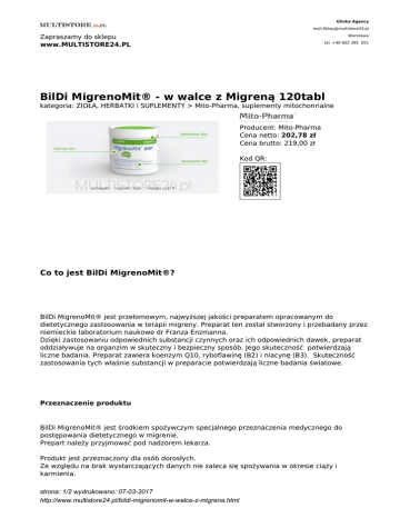 Glinka Agency mail;[email protected] Zapraszamy do sklepu www.MULTISTORE24.PL Warszawa tel. +48 602 395 051 BilDi MigrenoMit® - w walce z Migreną 120tabl kategoria: ZIOŁA, HERBATKI i SUPLEMENTY > Mito-Pharma, suplementy mitochonrialne Producent: Mito-Pharma Cena netto: 202,78 zł Cena brutto: 219,00 zł Kod QR: Co to jest BilDi MigrenoMit®? BilDi MigrenoMit® jest przełomowym, najwyższej jakości preparatem opracowanym do dietetycznego zastosowania w terapii migreny. Preparat ten został stworzony i przebadany przez niemieckie laboratorium naukowe dr Franza Enzmanna. Dzięki zastosowaniu odpowiednich substancji czynnych oraz ich odpowiednich dawek, preparat oddziaływuje na organzim w skuteczny i bezpieczny sposób. Jego skuteczność potwierdzają liczne badania. Preparat zawiera koenzym Q10, ryboflawinę (B2) i niacynę (B3). Skuteczność zastosowania tych właśnie substancji w preparacie potwierdzają liczne badania światowe. Przeznaczenie produktu BilDi MigrenoMit® jest środkiem spożywczym specjalnego przeznaczenia medycznego do postępowania dietetycznego w migrenie. Prepart należy przyjmować pod nadzorem lekarza. Produkt jest przeznaczony dla osób dorosłych. Ze względu na brak wystarczających danych nie zaleca się spożywania w okresie ciąży i karmienia. strona: 1/2 wydrukowano: 07-03-2017 http://www.multistore24.pl/bildi-migrenomit-w-walce-z-migrena.html Produkt nie jest wskazany dla osób, u których istnieje nadwrażliwość na którykolwiek ze składników. Produkt nie jest odpowiedni jako jedyne zródło pożywienia. Nie jest przeznaczony do stosowania pozajelitowego Skład i sposób użycia Skład: Maltodekstryna, Ryboflawina ( witamina B2), żelatyna, koenzym Q10, substancja wypełniająca laktoza i celuloza mikrokrystaliczna, niacynamid ( witamina B3) , substancja przeciwzbrylająca sole magnezowe kwasów tłuszczowych. PROSIMY NIE ŁACZYĆ PRODUKTÓW FIRMY MITO PHARMA Z INNYMI PRODUCENTAMI W JEDNYM ZAMÓWIENIU Czystość i jakość preparatu Wszystkie produkty Laboratorium MSE Pharmazeutika dr Franz Enzmann zawierają fizjologiczne substancje o najwyższym stopniu czystości, w odpowiednio wysokich dawkach i formie. Jedynie tak przygotowane substancje mogą w wystarczającej ilości trafić bezpośrednio do komórek i mitochondriów. Ich działanie jest potwierdzone badaniami. Niemieckie Laboratorium MSE dr Franz Enzmann, w oparciu o 40 lat badań, gwarantuje nam zachowanie stałości składu i najwyższej czystości preparatów. strona: 2/2 wydrukowano: 07-03-2017 http://www.multistore24.pl/bildi-migrenomit-w-walce-z-migrena.html