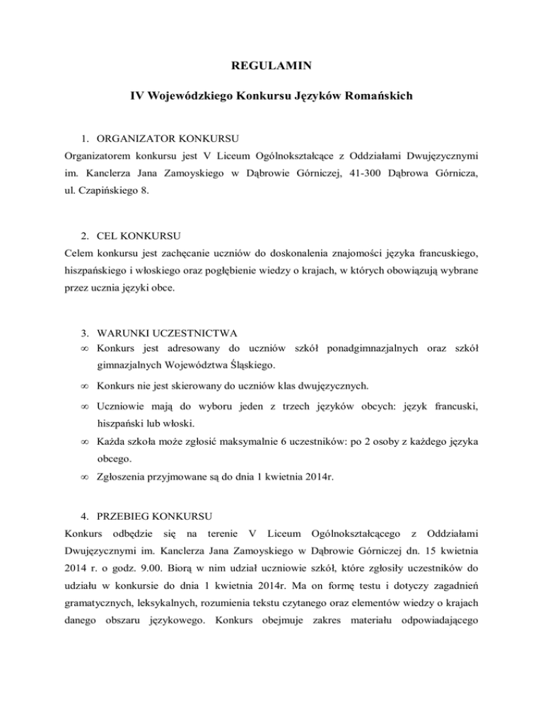 REGULAMIN IV Wojewódzkiego Konkursu Języków Romańskich 1. ORGANIZATOR KONKURSU Organizatorem konkursu jest V Liceum Ogólnokształcące z Oddziałami Dwujęzycznymi im. Kanclerza Jana Zamoyskiego w Dąbrowie Górniczej, 41-300 Dąbrowa Górnicza, ul. Czapińskiego 8. 2. CEL KONKURSU Celem konkursu jest zachęcanie uczniów do doskonalenia znajomości języka francuskiego, hiszpańskiego i włoskiego oraz pogłębienie wiedzy o krajach, w których obowiązują wybrane przez ucznia języki obce. 3. WARUNKI UCZESTNICTWA • Konkurs jest adresowany do uczniów szkół ponadgimnazjalnych oraz szkół gimnazjalnych Województwa Śląskiego. • Konkurs nie jest skierowany do uczniów klas dwujęzycznych. • Uczniowie mają do wyboru jeden z trzech języków obcych: język francuski, hiszpański lub włoski. • Każda szkoła może zgłosić maksymalnie 6 uczestników: po 2 osoby z każdego języka obcego. • Zgłoszenia przyjmowane są do dnia 1 kwietnia 2014r. 4. PRZEBIEG KONKURSU Konkurs odbędzie się na terenie V Liceum Ogólnokształcącego z Oddziałami Dwujęzycznymi im. Kanclerza Jana Zamoyskiego w Dąbrowie Górniczej dn. 15 kwietnia 2014 r. o godz. 9.00. Biorą w nim udział uczniowie szkół, które zgłosiły uczestników do udziału w konkursie do dnia 1 kwietnia 2014r. Ma on formę testu i dotyczy zagadnień gramatycznych, leksykalnych, rozumienia tekstu czytanego oraz elementów wiedzy o krajach danego obszaru językowego. Konkurs obejmuje zakres materiału odpowiadającego wymaganiom poziomu A1/A2 (szkoły gimnazjalne) oraz poziomu B1 (szkoły ponadgimnazjalne). 5. OCENA I PRZYZNAWANIE NAGRÓD • Kandydatów ocenia komisja składająca się z nauczycieli języków francuskiego, hiszpańskiego i włoskiego V LO z Oddziałami Dwujęzycznymi im. K. J. Zamoyskiego w Dąbrowie Górniczej. • Komisja przyznaje nagrody za zdobycie I, II i III miejsca. 6. ZGŁOSZENIA Zgłoszenie do udziału w konkursie odbywa się poprzez przesłanie karty zgłoszenia na adres mailowy: [email protected] lub przesłanie faksem: 032 262 27 67. Termin nadsyłania karty zgłoszenia upływa 1 kwietnia 2014 r.