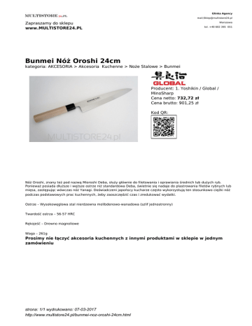 Glinka Agency mail;[email protected] Zapraszamy do sklepu www.MULTISTORE24.PL Warszawa tel. +48 602 395 051 Bunmei Nóż Oroshi 24cm kategoria: AKCESORIA > Akcesoria Kuchenne > Noże Stalowe > Bunmei Producent: 1. Yoshikin / Global / MinoSharp Cena netto: 732,72 zł Cena brutto: 901,25 zł Kod QR: Nóż Oroshi, znany też pod nazwą Mioroshi Deba, służy głównie do filetowania i oprawiania średnich lub dużych ryb. Ponieważ posiada dłuższe i węższe ostrze niż standardowa Deba, świetnie się nadaje do plastrowania filetów rybnych lub mięsa, zastępując wówczas nóż Yanagi. Doświadczeni japońscy kucharze często wykorzystują ten stosunkowo ciężki nóż podczas podstawowych prac kuchennych, żeby zaoszczędzić czas i zredukować wydatki. Ostrze – Wysokowęglowa stal nierdzewna molibdenowo-wanadowa (szlif jednostronny) Twardość ostrza – 56-57 HRC Rękojeść – Drewno magnoliowe Waga – 261g Prosimy nie łączyć akcesoria kuchennych z innymi produktami w sklepie w jednym zamówieniu strona: 1/1 wydrukowano: 07-03-2017 http://www.multistore24.pl/bunmei-noz-oroshi-24cm.html