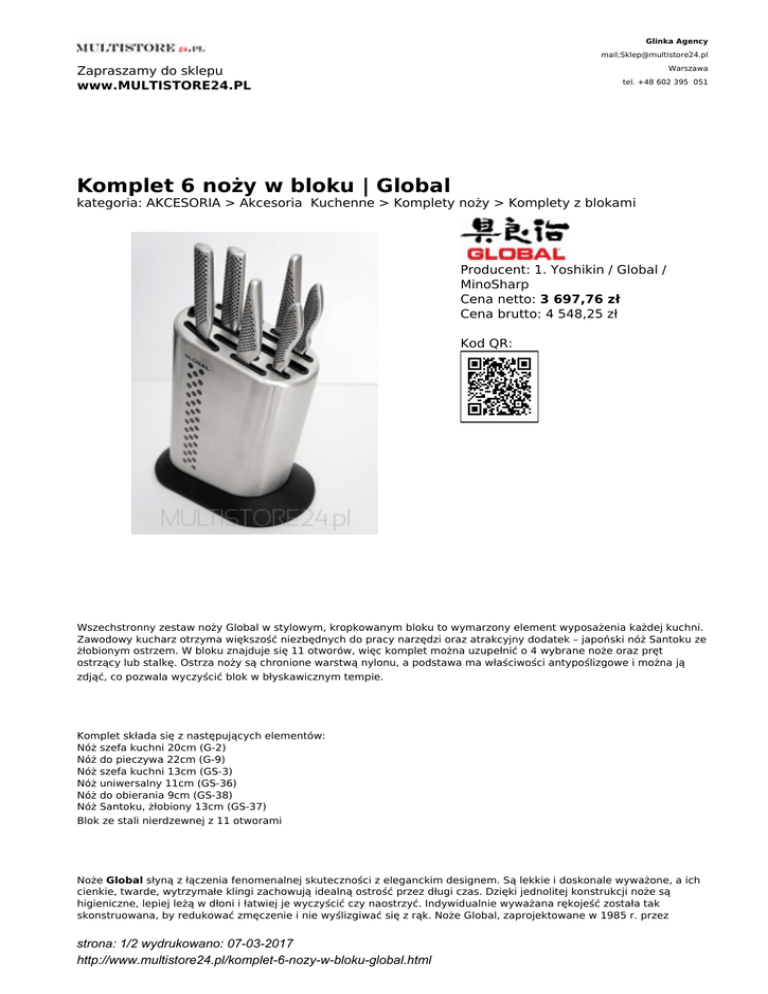 Glinka Agency mail;[email protected] Zapraszamy do sklepu www.MULTISTORE24.PL Warszawa tel. +48 602 395 051 Komplet 6 noży w bloku | Global kategoria: AKCESORIA > Akcesoria Kuchenne > Komplety noży > Komplety z blokami Producent: 1. Yoshikin / Global / MinoSharp Cena netto: 3 697,76 zł Cena brutto: 4 548,25 zł Kod QR: Wszechstronny zestaw noży Global w stylowym, kropkowanym bloku to wymarzony element wyposażenia każdej kuchni. Zawodowy kucharz otrzyma większość niezbędnych do pracy narzędzi oraz atrakcyjny dodatek – japoński nóż Santoku ze żłobionym ostrzem. W bloku znajduje się 11 otworów, więc komplet można uzupełnić o 4 wybrane noże oraz pręt ostrzący lub stalkę. Ostrza noży są chronione warstwą nylonu, a podstawa ma właściwości antypoślizgowe i można ją zdjąć, co pozwala wyczyścić blok w błyskawicznym tempie. Komplet składa się z następujących elementów: Nóż szefa kuchni 20cm (G-2) Nóż do pieczywa 22cm (G-9) Nóż szefa kuchni 13cm (GS-3) Nóż uniwersalny 11cm (GS-36) Nóż do obierania 9cm (GS-38) Nóż Santoku, żłobiony 13cm (GS-37) Blok ze stali nierdzewnej z 11 otworami Noże Global słyną z łączenia fenomenalnej skuteczności z eleganckim designem. Są lekkie i doskonale wyważone, a ich cienkie, twarde, wytrzymałe klingi zachowują idealną ostrość przez długi czas. Dzięki jednolitej konstrukcji noże są higieniczne, lepiej leżą w dłoni i łatwiej je wyczyścić czy naostrzyć. Indywidualnie wyważana rękojeść została tak skonstruowana, by redukować zmęczenie i nie wyślizgiwać się z rąk. Noże Global, zaprojektowane w 1985 r. przez strona: 1/2 wydrukowano: 07-03-2017 http://www.multistore24.pl/komplet-6-nozy-w-bloku-global.html Komina Yamadę, zdobyły wiele międzynarodowych nagród i cieszą się niesłabnącym uznaniem największych mistrzów kuchni – zarówno profesjonalistów, jak i kuchmistrzów domowych. Prosimy nie łączyć akcesoria kuchennych z innymi produktami w sklepie w jednym zamówieniu strona: 2/2 wydrukowano: 07-03-2017 http://www.multistore24.pl/komplet-6-nozy-w-bloku-global.html