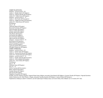 CZĘŚĆ PLASTYCZNA kategoria - uczniowie klas 0 - III miejsce I - Klaudia Kubić (SP Mełgiew) miejsce II - Martyna Słomka (SP Dominów) miejsce III - Paulina Krasa (SP Krępiec) kategoria - uczniowie klas IV - VI miejsce I - Ola Chyćko (SP Krzesimów) miejsce II - Małgorzata Okoń (SP Dominów) miejsce III - Diana Kozyra (SP Jacków) Wyróżnienia klasy 0 - III Agnieszka Bujek (SP Krępiec) Krzysztof Grochecki (SP Krępiec) Oliwia Kicińska (SP Krępiec) Mateusz Libicki (SP Krępiec) Karolina Motyl (SP Krępiec) Julia Pilecka (SP Krępiec) Jan Welman (SP Mełgiew) Paweł Woźniak (SP Krępiec) Maja Pszeniczka (SP Krępiec) kategoria - uczniowie klas IV - VI Karol Bocian (SP Dominów) Monika Bocian (SP Dominów) Kasia Lech (SP Dominów) Agnieszka Królik (SP Krzesimów) Weronika Winiarczyk (SP Krępiec) CZĘŚĆ LITERACKA kategoria - uczniowie klas 0 - III miejsce I - Emilia Tatara (SP Krępiec) miejsce II - Szymon Kowalczuk (SP Krępiec) miejsce III - Gracjan Pietruszka (SP Krępiec) kategoria - uczniowie klas IV - VI miejsce I - Natalia Adamiak (SP Krzesimów) miejsce II - Oliwia Badach (SP Krępiec) miejsce III - Anna Libicka (SP Krępiec) Wyróżnienia klasy 0 - III Michalina Anasz (SP Krępiec) klasy IV - VI Sylwia Czarnota (SP Krzesimów) Błażej Adamek (SP Krępiec) Zuzanna Bereza (SP Krępiec) Julia Kozieł (SP Krępiec) Magdalena Szypulska (SP Krępiec) Ponadto wręczono Nagrody specjalne: Nagrodę Wójta Gminy Mełgiew otrzymała Alicja Banach (SP Mełgiew) i Szymon Wronka (SP Krępiec). Nagrodę Dyrektora Szkoły Podstawowej im. Marii Wójcik w Krępcu otrzymały: Karolina Kanclerz (SP Krępiec) i Amelia Wińska (SP Dominów). Organizatorzy dziękują za udział w konkursie i już dziś zapraszają do kolejnej edycji, tym razem letniej, która odbędzie się we wrześniu 2017 roku
