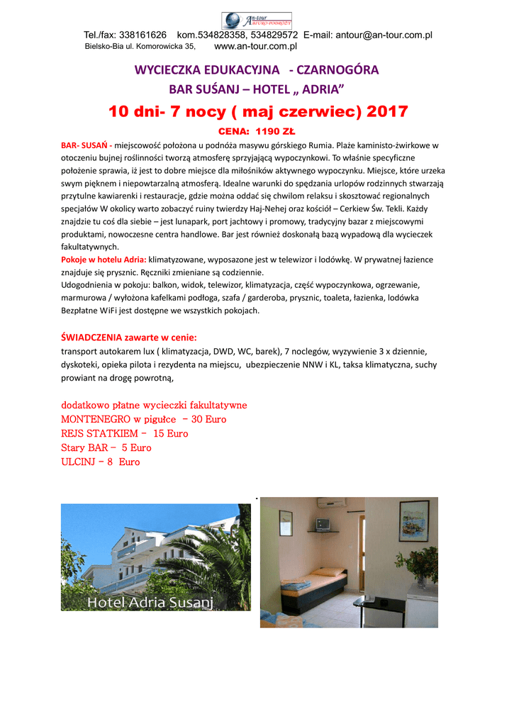 Tel./fax: 338161626 kom.534828358, 534829572 E-mail: [email protected] www.an-tour.com.pl Bielsko-Bia ul. Komorowicka 35, WYCIECZKA EDUKACYJNA - CZARNOGÓRA BAR SUŚANJ – HOTEL „ ADRIA” 10 dni- 7 nocy ( maj czerwiec) 2017 CENA: 1190 ZŁ BAR- SUSAŃ - miejscowość położona u podnóża masywu górskiego Rumia. Plaże kaministo-żwirkowe w otoczeniu bujnej roślinności tworzą atmosferę sprzyjającą wypoczynkowi. To właśnie specyficzne położenie sprawia, iż jest to dobre miejsce dla miłośników aktywnego wypoczynku. Miejsce, które urzeka swym pięknem i niepowtarzalną atmosferą. Idealne warunki do spędzania urlopów rodzinnych stwarzają przytulne kawiarenki i restauracje, gdzie można oddać się chwilom relaksu i skosztować regionalnych specjałów W okolicy warto zobaczyć ruiny twierdzy Haj-Nehej oraz kościół – Cerkiew Św. Tekli. Każdy znajdzie tu coś dla siebie – jest lunapark, port jachtowy i promowy, tradycyjny bazar z miejscowymi produktami, nowoczesne centra handlowe. Bar jest również doskonałą bazą wypadową dla wycieczek fakultatywnych. Pokoje w hotelu Adria: klimatyzowane, wyposazone jest w telewizor i lodówkę. W prywatnej łazience znajduje się prysznic. Ręczniki zmieniane są codziennie. Udogodnienia w pokoju: balkon, widok, telewizor, klimatyzacja, część wypoczynkowa, ogrzewanie, marmurowa / wyłożona kafelkami podłoga, szafa / garderoba, prysznic, toaleta, łazienka, lodówka Bezpłatne WiFi jest dostępne we wszystkich pokojach. ŚWIADCZENIA zawarte w cenie: transport autokarem lux ( klimatyzacja, DWD, WC, barek), 7 noclegów, wyzywienie 3 x dziennie, dyskoteki, opieka pilota i rezydenta na miejscu, ubezpieczenie NNW i KL, taksa klimatyczna, suchy prowiant na drogę powrotną, dodatkowo płatne wycieczki fakultatywne MONTENEGRO w pigułce - 30 Euro REJS STATKIEM - 15 Euro Stary BAR – 5 Euro ULCINJ - 8 Euro