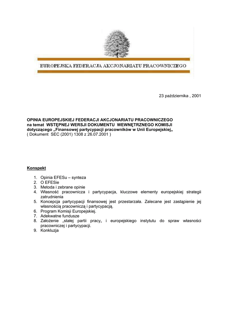 23 października , 2001 OPINIA EUROPEJSKIEJ FEDERACJI AKCJONARIATU PRACOWNICZEGO na temat WSTĘPNEJ WERSJI DOKUMENTU WEWNĘTRZNEGO KOMISJI dotyczącego „Finansowej partycypacji pracowników w Unii Europejskiej„ ( Dokument SEC (2001) 1308 z 26.07.2001 ) Konspekt 1. 2. 3. 4. 5. 6. 7. 8. 9. Opinia EFESu – synteza O EFESie Metoda i zebrane opinie Własność pracownicza i partycypacja, kluczowe elementy europejskiej strategii zatrudnienia Koncepcja partycypacji finansowej jest przestarzała. Zalecane jest zastąpienie jej własnością pracowniczą i partycypacją. Program Komisji Europejskiej. Adekwatne fundusze Założenie „stałej partii pracy„ i europejskiego instytutu do spraw własności pracowniczej i partycypacji. Konkluzja OPINIA EUROPEJSKIEJ FEDERACJI AKCJONARIATU PRACOWNICZEGO na temat WSTĘPNEJ WERSJI DOKUMENTU WEWNĘTRZNEGO KOMISJI dotyczącego „Finansowej partycypacji pracowników w Unii Europejskiej„ ( Dokument SEC (2001) 1308 z 26.07.2001 ) 1. OPINIA EFESU – SYNTEZA Sens opinii EFESu jest następujący: Tak, Komsja Europejska powinna przygotować dla Wspólnoty plan inicjatywy zmierzającej do promowania własności pracowniczej i partycypacji. Używamy terminu „własność pracownicza i partycypacja„ częściej niż „partycypacja finansowa”. T rozróżnienie jest znaczące. Pojęcie „partycypacji finansowej„ narodziło się i zaczęło być stosowane pod koniec lat 80- tych. Od tego czasu zarówno praktyka , jak i badania wskazywały na potrzebę doprecyzowania terminów. Spośród różnych praktyk stosowanych z użyciem pojęcia „partycypacja finansowa” niektóre byly korzystne , a inne miały skutki negatywne. Jednak nasze spostrzeżenia z ostatniej dekady pozwalają dostrzec pozytywny wpływ połączonych praktyk własności pracowniczej i partycypacyjnego zarządzania na dynamikę ekonomiczną i społeczną. Własność pracownicza i partycypacja są po prostu dwiema niezależnymi zmiennymi organizacyjnymi. Żadna z nich sama w sobie nie prowadzi do znaczących udoskonaleń w osiągnięciach przedsiębiorstwa, jakkolwiek obie mogą być doceniane za wartość, jaką stanowią same w sobie. Jednak dopiero ich połączenie pozwoliło po raz pierwszy uwolnić ich prawdziwy potencjał. Działania powinny zostać podjęte na terenach Unii Europejskiej i krajów kandydujących. Konieczne jest ustanowienie głównych zasad na poziomie europejskim aby zachęcić do częstszego i bardziej efektywnego stosowania schematów własności pracowniczej i partycypacji. Główne zasady i działania, które Komisja powinna uwzględnić w swoim kolejnym Komunikacie i Planie Działania są zdefiniowane w „Europejskim Programie Działania„ Europejskiej Federacji Akcjonariatu Pracowniczego. Progrm ten jest oparty na Rezolucji Parlamentu Europejskiego ze stycznia 1998 i został napisany jako konkluzja warsztatu, który zgromadził razem, w Parlamencie Europejskim w Brukseli , wszystkie instytucje europejskie, podobnie jak partnerów społecznych i organizacje zajmujące się własnością pracowniczą. Program działania wzywa Komisję Europejską do: • • • Ustanowienia stałej partii pracy Wprowadzenia programu wraz z adekwatnymi funduszami Założenia europejskiego instytutu do spraw własności pracowniczej i partycypacji. Program działania jet ściśle związany w całej rozciągłości z bieżącymi opiniami, z których składa się główna jego część. Bieżący pogląd EFESu został przedyskutowany i uzgodniony z CECOPem – Europejską Konfederacją Współdziałaczy Pracowniczych, Współdziałaczy Społecznych i Przedsiębiorstw Partycypacyjnych”; pozwalamy sobie przypomnieć, że CECOP jest członkiem EFESu i wzajemnie, EFES jest partnerem członkowskim CECOPu. 2. O EFESIE EFES - Europejska Federacja Akcjonariatu Pracowniczego- został utworzony na podstawie decyzji podjętej w maju 1998 w Brukseli, na konferencji, która zebrała razem 250 uczestników z 28 krajów. Federacja bardzo szybko zorganizowała się, deklarując w statucie, iż jest międzynarodową organizacją typu not-for-profit, zatwierdzoną przez Rząd Belgijski. Przedmiotem dzialań EFESu (Europejskiej Federacji do spraw Własności Pracowniczej) jest zrzeszanie organizacji , zajmujących się własnością pracowniczą, oraz wszystkich osób, przedsiębiorstw, związków zawodowych, ekspertów, badaczy i instytucji, które mają na celu promowanie własności i partycypacji pracowniczej w Europie. Ambicja EFESu jest realizowana. EFES posiada członków w większosci krajów Europy, zarówno w krajach Unii Europejskiej , jak i w krajach kandydujących. Pośród członków EFESu znajdują się jednostki, przedsiębiorstwa, stowarzyszenia, związki zawodowe, eksperci, badacze, federacje narodowe. Rada Dyrektorów EFESu liczy 22 reprezentantów z 14 krajów , a jej Biuro Wykonawcze 7 osób , które spotykają sie co miesiąc. 3. METODA I ZEBRANE OPINIE Aby przygotować swoją opinię EFES spotkał się i skonsultował z szerokim kręgiem osób i organizacji: reprezentantami rządów, członkami Parlamentu Europejskiego, reprezentantami związków zawodowych na poziomie europejskim, organizacjami pracowniczymi, organizacjami promującymi własność pracowniczą etc. EFES zorganizował również forum internetowe na temat konsultacji zorganizowanej przez Komisję . Niektóre chrakterystyczne zebrane opinie zostały zaprezentowane w załączniku. Reakcje, które zebraliśmy od szerokiego kręgu osób mają nastepujący ogólny wydźwięk: Zadowolenie może wzbudzić jedynie wyrażenie przez Komisję Europejską woli „wznowienia debaty nad partycypacją finansową na szczeblu europejskim, obejmującej wszystkie zaangażowane strony”. Dokument posiada wiele pozytywnych aspektów , jest jednak jeden zasadniczy brak w podstawowych założeniach i – być może zrozumiały – rażący brak propozycji działań. Zalety dokumentu są następujące: Komisja wyraża zdecydow