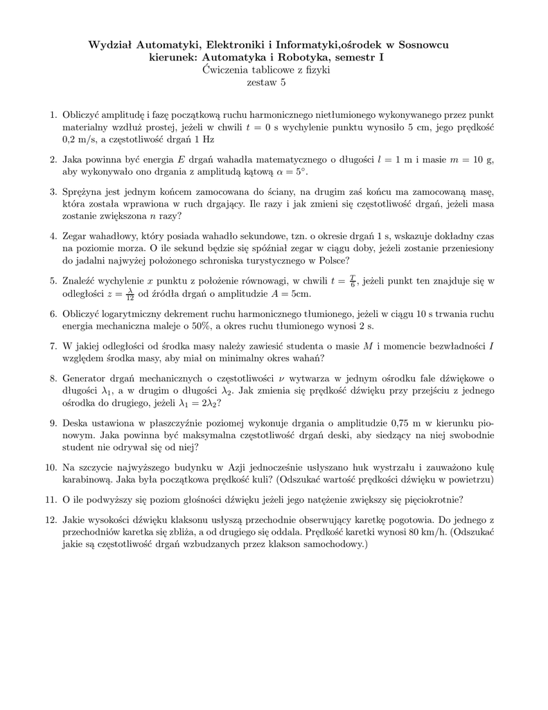 Wydział Automatyki, Elektroniki i Informatyki,ośrodek w Sosnowcu kierunek: Automatyka i Robotyka, semestr I Ćwiczenia tablicowe z fizyki zestaw 5 1. Obliczyć amplitudę i fazę początkową ruchu harmonicznego nietłumionego wykonywanego przez punkt materialny wzdłuż prostej, jeżeli w chwili t = 0 s wychylenie punktu wynosiło 5 cm, jego prędkość 0,2 m/s, a częstotliwość drgań 1 Hz 2. Jaka powinna być energia E drgań wahadła matematycznego o długości l = 1 m i masie m = 10 g, aby wykonywało ono drgania z amplitudą kątową α = 5 ◦ . 3. Sprężyna jest jednym końcem zamocowana do ściany, na drugim zaś końcu ma zamocowaną masę, która została wprawiona w ruch drgający. Ile razy i jak zmieni się częstotliwość drgań, jeżeli masa zostanie zwiększona n razy? 4. Zegar wahadłowy, który posiada wahadło sekundowe, tzn. o okresie drgań 1 s, wskazuje dokładny czas na poziomie morza. O ile sekund będzie się spóźniał zegar w ciągu doby, jeżeli zostanie przeniesiony do jadalni najwyżej położonego schroniska turystycznego w Polsce? 5. Znaleźć wychylenie x punktu z położenie równowagi, w chwili t = λ od źródła drgań o amplitudzie A = 5cm. odległości z = 12 T 6, jeżeli punkt ten znajduje się w 6. Obliczyć logarytmiczny dekrement ruchu harmonicznego tłumionego, jeżeli w ciągu 10 s trwania ruchu energia mechaniczna maleje o 50%, a okres ruchu tłumionego wynosi 2 s. 7. W jakiej odległości od środka masy należy zawiesić studenta o masie M i momencie bezwładności I względem środka masy, aby miał on minimalny okres wahań? 8. Generator drgań mechanicznych o częstotliwości ν wytwarza w jednym ośrodku fale dźwiękowe o długości λ1 , a w drugim o długości λ2 . Jak zmienia się prędkość dźwięku przy przejściu z jednego ośrodka do drugiego, jeżeli λ1 = 2λ2 ? 9. Deska ustawiona w płaszczyźnie poziomej wykonuje drgania o amplitudzie 0,75 m w kierunku pionowym. Jaka powinna być maksymalna częstotliwość drgań deski, aby siedzący na niej swobodnie student nie odrywał się od niej? 10. Na szczycie najwyższego budynku w Azji jednocześnie usłyszano huk wystrzału i zauważono kulę karabinową. Jaka była początkowa prędkość kuli? (Odszukać wartość prędkości dźwięku w powietrzu) 11. O ile podwyższy się poziom głośności dźwięku jeżeli jego natężenie zwiększy się pięciokrotnie? 12. Jakie wysokości dźwięku klaksonu usłyszą przechodnie obserwujący karetkę pogotowia. Do jednego z przechodniów karetka się zbliża, a od drugiego się oddala. Prędkość karetki wynosi 80 km/h. (Odszukać jakie są częstotliwość drgań wzbudzanych przez klakson samochodowy.)