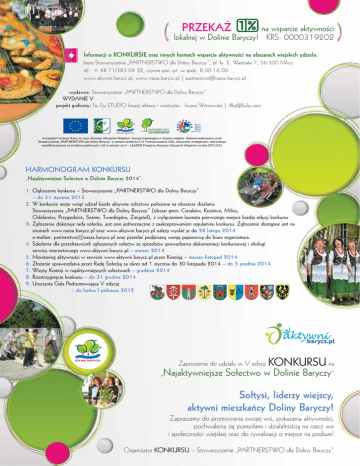 PRZEKAŻ na wsparcie aktywności lokalnej w Dolinie Baryczy! KRS: 0000319202 Informacji o KONKURSIE oraz innych formach wsparcia aktywności na obszarach wiejskich udziela: biuro Stowarzyszenia „PARTNERSTWO dla Doliny Baryczy”, pl. ks. E. Waresiaka 7, 56-300 Milicz tel.: + 48 71/383 04 32, czynne pon.-pt. w godz. 8.00-16.00 www.aktywni.barycz.pl, www.nasza.barycz.pl | [email protected] wydawca: Stowarzyszenie „PARTNERSTWO dla Doliny Baryczy” WYDANIE V projekt graficzny: Fju Fju STUDIO kreacji reklamy i wizerunku Iwona Wiśniowska | [email protected] Europejski Fundusz Rolny na rzecz Rozwoju Obszarów Wiejskich. Europa inwestująca w obszary wiejskie. Zadanie realizowane przez Stowarzyszenie „PARTNERSTWO dla Doliny Baryczy” w ramach działania 4.31 Funkcjonowanie LGD, nabywanie umiejętności i aktywizacja, współfinansowane ze środków publicznych i UE w ramach osi 4 – LEADER Programu Rozwoju Obszarów Wiejskich na lata 2007-2013. HARMONOGRAM KONKURSU „Najaktywniejsze Sołectwo w Dolinie Baryczy 2014”: 1. Ogłoszenie konkursu – Stowarzyszenie „PARTNERSTWO dla Doliny Baryczy” – do 31 stycznia 2013 2. W konkursie może wziąć udział każde aktywne sołectwo położone na obszarze działania Stowarzyszenia „PARTNERSTWO dla Doliny Baryczy” (obszar gmin: Cieszków, Krośnice, Milicz, Odolanów, Przygodzice, Sośnie, Twardogóra, Żmigród), z wyłączeniem laureata pierwszego miejsca każdej edycji konkursu. 3. Zgłoszenia dokonuje rada sołecka, jest ono jednoznaczne z zaakceptowaniem regulaminu konkursu. Zgłoszenie dostępne jest na stronach www.nasza.barycz.pl oraz www.aktywni.barycz.pl należy wysłać je do 28 lutego 2014 e-mailem: [email protected] oraz przesłać podpisaną wersję papierową do biura organizatora. 4. Szkolenie dla przedstawicieli zgłoszonych sołectw ze sposobów prowadzenia dokumentacji konkursowej i obsługi serwisu internetowego www.aktywni.barycz.pl – marzec 2014 5. Monitoring aktywności w serwisie www.aktywni.barycz.pl przez Komisję – marzec-listopad 2014 6. Złożenie sprawozdania przez Radę Sołecką za okres od 1 stycznia do 30 listopada 2014 – do 5 grudnia 2014 7. Wizyty Komisji w najaktywniejszych sołectwach – grudzień 2014 8. Rozstrzygnięcie konkursu – do 31 grudnia 2014 9. Uroczysta Gala Podsumowująca V edycję – do końca I półrocza 2015 Zaproszenie do udziału w V edycji „Najaktywniejsze KONKURSU na Sołectwo w Dolinie Baryczy” Sołtysi, liderzy wiejscy, aktywni mieszkańcy Doliny Baryczy! Zapraszamy do promowania swojej wsi, pokazania aktywności, pochwalenia się pomysłami i działalnością na rzecz wsi i społeczności wiejskiej oraz do rywalizacji o miejsce na podium! Organizator KONKURSU – Stowarzyszenie „PARTNERSTWO dla Doliny Baryczy” CELEM KONKURSU jest aktywizacja mieszkańców wsi Doliny Baryczy do podejmowania i promowania inicjatyw na rzecz rozwoju własnych miejscowości, w szczególności poprzez tworzenie wspólnych miejsc rekreacji i wypoczynku, kultywowanie tradycji i obyczajów lokalnych, zwiększanie integracji mieszkańców oraz dbanie o zachowanie tradycyjnej architektury regionu. Do tej pory współpracowały z nami: 2010 r. – 15 sołectw | 2011 r. – 22 sołectwa | 2012 r. – 23 sołectwa | 2013 r. – 21 sołectw OFERTA dla sołectw biorących udział w KONKURSIE: możliwość redagowania własnej strony w serwisie www.aktywni.barycz.pl - liczne spotkania integracyjne - wyjazdy studyjne - warsztaty rękodzielnicze - tworzenie oferty wsi tematycznej, opracowanie strategii rozwoju - Questing – odkrywanie swojej wsi - udział w jarmarkach rękodzieła i produktów lokalnych m.in. w ramach Dni Karpia, Jarmarku „Dolina Baryczy – Świąteczna Kraina” - pomoc w zakładaniu stowarzyszeń - wymiana doświadczeń i współpraca między uczestnikami konkursu NOWOŚĆ 2014! – „Akademia Lidera” – możliwość zrealizowania wspólnie z innymi sołectwami pomysłu współpracy na rzecz rozwoju oferty wsi, integracji lokalnej, aktywności mieszkańców. NAGRODY: • Komisja wybierze laureatów miejsc I-III oraz wskaże wyróżnienia. • Laureat I miejsca otrzyma tytuł „Najaktywniejsze Sołectwo Doliny Baryczy w roku 2014”. • Pula nagród w edycji 2014 wynosi 15000 zł. Za I miejsce przysługuje nagroda rzeczowa o wartości 5000 zł, II – 3000 zł i III – 2000 zł. Pozostałe środki mogą być przeznaczone na wyróżnienia. • Organizator konkursu może sprecyzować cel i sposób wykorzystania środków. • W razie pozyskania dodatkowych środków i sponsorów dopuszcza się przyznanie dodatkowych nagród. KRYTERIA oceny: - Redagowanie podstrony w serwisie www.aktywni.barycz.pl Estetyka i dbałość o zachowanie i kształtowanie krajobrazu wiejskiego oraz ładu przestrzennego i architektonicznego Aktywność i partnerskie działanie wsi Realizacja projektów Oferta tematyczna wsi Planowe i zaplanowane działanie Promocja sołectwa i działań Aktywne wykorzystanie oferty Stowarzyszenia „PARTNERSTWO dla Doliny Baryczy” WIĘCEJ informacji w regulaminie KONKURSU dostępnym na stronach: www.nasza.barycz.pl | www.aktywni.barycz.pl