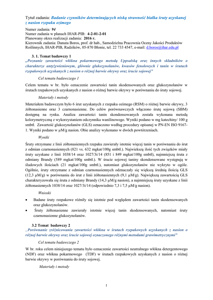Tytuł zadania: Badanie czynników determinujących niską strawność białka śruty uzyskanej z nasion rzepaku ozimego Numer zadania: 94 Numer zadania w planach IHAR-PIB: 4-2-01-2-01 Planowany okres realizacji zadania: 2016 r. Kierownik zadania: Danuta Boros, prof. dr hab., Samodzielna Pracownia Oceny Jakości Produktów Roślinnych, IHAR-PIB, Radzików, 05-870 Błonie, tel. 22 733 4547, e-mail: [email protected] 3. 1. Temat badawczy 1 „Poznanie zawartości włókna pokarmowego metodą Uppsalską oraz innych składników o charakterze antyżywieniowym, głównie glukozynolanów, kwasów fenolowych i tanin w śrutach rzepakowych uzyskanych z nasion o różnej barwie okrywy oraz śrucie sojowej” Cel tematu badawczego 1 Celem tematu w br. było oznaczenie zawartości tanin skodensowanych oraz glukozynolanów w śrutach rzepakowych uzyskanych z nasion o różnej barwie okrywy w porównaniu do śruty sojowej. Materiały i metody Materiałem badawczym było 6 śrut uzyskanych z rzepaku ozimego (RSM) o różnej barwie okrywy, 3 żółtonasienne oraz 3 czarnonasienne. Do celów porównawczych włączono śrutę sojową (SBM) dostępną na rynku. Analiza zawartości tanin skondensowanych została wykonana metodą kolorymetryczną z wykorzystaniem odczynnika wanilinowego. Wyniki podano w mg katechiny/ 100 g smbtł. Zawartość glukozynolanów (GLS) oznaczono według procedury opisanej w PN-EN ISO 91671. Wyniki podano w µM/g nasion. Obie analizy wykonano w dwóch powtórzeniach. Wyniki Śruty otrzymane z linii zółtonasiennych rzepaku zawierały istotnie więcej tanin w porównaniu do śrut z odmian czarnonasiennych (821 vs. 632 mgkat/100g smbtł.). Najwiekszą ilość tych związków miały śruty uzyskane z linii 1038/14 oraz 1027/3i/14 (851 i 849 mgkat/100g smbtł), najmniejszą śruta z odmiany Brandy (589 mgkat/100g smbtł.). W śrucie sojowej taniny skondensowane występują w śladowych ilościach (21 mgkat/100g smbtł.), natomiast glukozynolanów nie wykryto w ogóle. Ogólnie, śruty otrzymane z odmian czarnonasiennych odznaczały się większą średnią ilością GLS (12,3 µM/g) w porównaniu do śrut z linii żółtonasiennych (9,1 µM/g). Największą zawartością GLS charakteryzowała się śruta z odmiany Brandy (14,3 µM/g nasion), a najmniejszą śruty uzyskane z linii żółtonasiennych 1038/14 oraz 1027/3i/14 (odpowiednio 7,3 i 7,5 µM/g nasion). Wnioski • • Badane śruty rzepakowe różniły się istotnie pod względem zawartości tanin skodensowanych oraz glukozynolanów. Śruty żółtonasienne zawierały istotnie więcej tanin skodensowanych, natomiast śruty czarnonasienne glukozynolanów. 3.2 Temat badawczy 2 „Porównanie zróżnicowania zawartości włókna w śrutach rzepakowych uzyskanych z nasion o różnej barwie okrywy oraz śrucie sojowej oznaczonego różnymi metodami grawimetrycznymi” Cel tematu badawczego 2 W br. roku celem niniejszego tematu było oznaczenie zawartości neutralnego włókna detergentowego (NDF) oraz włókna pokarmowego (TDF) w śrutach rzepakowych uzyskanych z nasion o różnej barwie okrywy w porównaniu do śruty sojowej. Materiały i metody 1 Materiałem były te same śruty jak w temacie badawczym nr 1. Wykonano w nich analizę zawartości NDF metodą grawimetryczną wg Van Soest (1963) z modyfikacją Van Soest i Wine (1967) oraz włókna pokarmowego wg metody enzymatyczno-grawimetrycznej Asp i in. (1983). Wyniki Śruty żółtonasienne różniły się istotnie między sobą zawartością NDF, jednakże była ona istotnie mniejsza od zawartości tego włókna w śrutach czarnonasiennych. W grupie śrut żółtonasiennych największą zawartością NDF (21,2%) charakteryzowała się śruta uzyskana z linii 1058/6i/14, a najmniejszą (15,5%) śruta otrzymana z linii 1038/14. Śruty uzyskane z odmian czarnonasiennych charakteryzowały się średnią zawartością NDF wynoszącą 25,4% i nie różniły się istotnie między sobą pod względem tej cechy. Zawartość NDF w śrucie sojowej była istotnie mniejsza w porównaniu do obu rodzajów śrut rzepakowych. W odniesieniu do zawartości TDF wszystkie śruty żółtonasienne charakteryzowały się istotnie mniejszą zawartością tego włókna w porównaniu do śrut uzyskanych z odmian czarnonasiennych. Najmniejszą ilość TDF podobnie jak w przypadku NDF oznaczono w śrucie otrzymanej z linii 1038/14 (26,6%), największą zaś w śrucie czarnonasiennej z odmiany Konkret (36,3%). W śrucie sojowej ilość TDF (18,1%) była 2 krotnie mniejsza w porównaniu do śrut czarnonasiennych i ok. 40% niższa w porównaniu do śrut uzyskanych z linii żółtonasiennych. Wnioski • • Śruty rzepakowe różniły się istotnie pod względem zawartości NDF i TDF, istotnie niższe ich ilości stwierdzono w śrutach otrzymanych z nasion linii żółtonasiennych. Śruta sojowa miała istotnie niższe zawartości obu rodzajów włókna w porównaniu do śrut rzepakowych. 3.3 Temat badawczy 3 „Badania ilościowe wyizolowanych frakcji włókna pokarmowego ze śrut rzepakowych o różnej barwie okrywy oraz włókna sojowego, w tym związanego z nimi białka” Cel tematu badawczego 3 Celem tematu było określenie ilości białka związanego z każdą z frakcji włókna detergentowego i pokarmowego w śrutach rzepakowych uzyskanych z nasion o różnej barwie okrywy w porównaniu do śruty sojowej. Materiały i metody Materiałem badawczym były trzy rodzaje włókna wyizolowane z każdej z 6 śrut rzepakowych uzyskanych z nasion rzepaku ozimego oraz ze śruty sojowej (tych samych jak w temacie badawczym nr 1 i 2). Z próbek tych śrut wyizolowano ilościowo kwaśne (ADF) i neutralne włókno detergentowe (NDF) oraz włókno pokarmowe (TDF) wg metodyk opisanych w temacie 2. Następnie oznaczono ilość białka związanego z każdą z tych rodzajów włókna. Wyniki Procent białka związanego z danym włóknem wyrażono jako procent całkowitej zawartości białka w śrucie. W przypadku biał