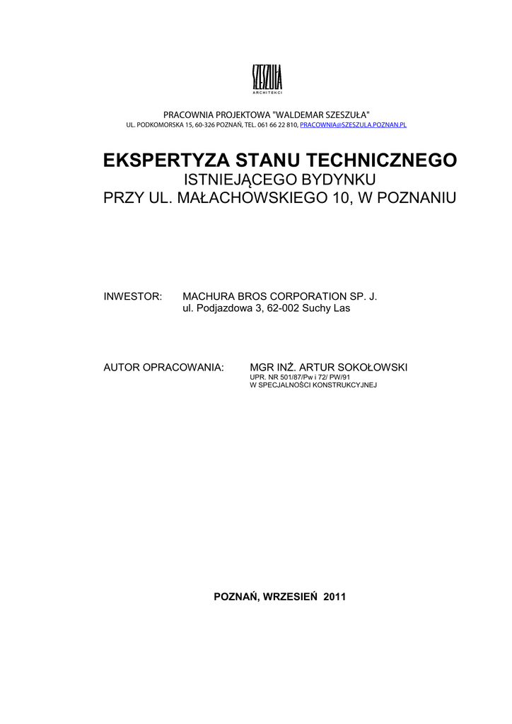 PRACOWNIA PROJEKTOWA "WALDEMAR SZESZUŁA" UL. PODKOMORSKA 15, 60-326 POZNAŃ, TEL. 061 66 22 810, [email protected] EKSPERTYZA STANU TECHNICZNEGO ISTNIEJĄCEGO BYDYNKU PRZY UL. MAŁACHOWSKIEGO 10, W POZNANIU INWESTOR: MACHURA BROS CORPORATION SP. J. ul. Podjazdowa 3, 62-002 Suchy Las AUTOR OPRACOWANIA: MGR INŻ. ARTUR SOKOŁOWSKI UPR. NR 501/87/Pw i 72/ PW/91 W SPECJALNOŚCI KONSTRUKCYJNEJ POZNAŃ, WRZESIEŃ 2011 EKSPERTYZA STANU TECHNICZNEGO ISTNIEJĄCEGO BUDYNKU MAGAZYNOWEGO PRZY UL. MAŁACHOWSKIEGO 10 W POZNANIU 1. WSTĘP 1.1. Przedmiot opracowania Opracowanie zawiera ocenę techniczną stanu konstrukcji istniejących budynków magazynowych zlokalizowanych przy ul. Małachowskiego 10 w Poznaniu, w związku z projektowaną rozbudową i przebudową z przeznaczeniem na cele biurowe. W podpiwniczeniu ma być zlokalizowany parking podziemny. W ramach projektowanej inwestycji zostanie dobudowana partia wejściowa oraz III piętro nad niższym budynkiem. Ponadto w obrębie istniejących budynków przewiduje się wykonanie szeregu prac budowlanych związanych ze zmianą dotychczasowej funkcji obiektu z magazynowej na biurową. 1.2. Cel opracowania Celem opracowania jest określenie stanu istniejących budynków magazynowych. Opracowanie wraz z projektem budowlanym stanowi załącznik do wniosku o wydanie pozwolenia na budowę. 1.3. Podstawa opracowania 1. Dokumentacja techniczna budynku magazynowego w Poznaniu przy ul. Projektowanej (obecnie ul. Małachowskiego) opracowany w 1952 – 1954 r. 2. Projekt wstępny na budowę magazynu obuwia w Poznaniu przy ul. Bydgoskiej (obecnie ul. Małachowskiego) opracowany w 1962 r. 3. Inwentaryzacja budowlana budynku magazynowego zlokalizowanego w Poznaniu przy ul. Małachowskiego 10 opracowana w 1984 r 4. Inwentaryzacja budowlana budynków „A” i „B” – piwnice, parter i I piętro Poznań ul. Małachowskiego 10 opracowana w 1994 r 5. Projekt budowlany wewnętrznej windy towarowej i rampy opracowany w czerwcu 1998 r. 6. Opinia geotechniczna w sprawie warunków gruntowo wodnych - na potrzeby projektu przebudowy budynku przy ul. Małachowskiego 10 w Poznaniu we wrześniu 2011r. 7. Koncepcja rozbudowy, nadbudowy i zmiany sposobu użytkowania istniejącego budynku przy ul. Małachowskiego 10 w Poznaniu opracowana we wrześniu 2011 r. 8. Wizja lokalna przeprowadzona przez autora niniejszego opracowania 9. Dokumentacja fotograficzna z oględzin obiektu 1.4. Literatura • • • • • • Polskie Normy Budowlane, „Warunki techniczne wykonania i odbioru robót budowlanych” dotyczące wykonania konstrukcji murowych – Instrukcja nr 425/2006, „Projektowanie elementów żelbetowych i murowych z uwagi na odporność ogniową” – Instrukcja nr 425/2006, „Warunki techniczne jakim powinny odpowiadać budynki i ich usytuowanie’ – Dz. U. z 2002r. nr 75, poz. 690 z późniejszymi zmianami, Małyszko L., Orłowicz R.: Konstrukcje murowe, Zarysowania i naprawy. Wydawnictwo Uniwersytetu Warszawsko-Mazurskiego w Olsztynie 2000 r., Masłowski E., Spiżewska D.: Wzmacnianie konstrukcji budowlanych, Arkady 2000, 2. DANE TECHNICZNE 2.1. Opis ogólny istniejących obiektów Istniejący obiekt przeznaczony do przebudowy składa się z dwóch budynków oddzielonych dylatacją. Oba budynki mają po 3 pełne kondygnacje nadziemne (parter i 2 piętra) i jedną podziemną. Pierwszy z budynków, pierwotnie przeznaczony na magazyn centrali tekstylnej, został zaprojektowany w latach 1952-1954 i wzniesiony około 55 lat temu. Drugi budynek zaprojektowano około roku 1962 jako magazyn obuwia. W okresie eksploatacji sposób użytkowania ulegał częściowym zmianom. W ostatnim okresie pierwszy budynek pełnił funkcję biurowo-produkcyjno-magazynową natomiast w drugim znajdowały się przestrzenie produkcyjno-magazynowe. Użytkownikiem obiektu była firma Inline Poland produkująca opakowania z folii polietylenowej. Obecnie obiekty nie są użytkowane. 2.2. Opis ogólny istniejącego budynku biurowo-produkcyjno-magazynowego (A) Budynek wykonano na planie prostokąta o wymiarach 19,0x72,9 m. Jego wysokość wynosi 12,8 m od poziomu terenu a kubatura 20200 m3. Konstrukcję nośną budynku stanowi żelbetowy szkielet monolityczny wraz z zewnętrznymi ścianami murowanymi z cegły ceramicznej pełnej. Płyty stropowe wykonano jako monolityczne wieloprzęsłowe oparte na trójprzęsłowych belkach żelbetowych. Budynek posadowiono na żelbetowych ławach i stopach fundamentowych. Ławy fundamentowe posadowiono 1,10 m poniżej poziomu posadzki podpiwniczenia a stopy pod słupy głównej konstrukcji nośnei 1,60 m poniżej posadzki podpiwniczenia. Elementy konstrukcji żelbetowej wykonano z betonu, którego klasę określa się na nie wyższą niż B15. Główna konstrukcję nośną stanowi szkielet żelbetowy ze słupami rozmieszczonymi co 6,0x6,0 m. Słupy w poziomie piwnicy wykonano o przekroju 65x65 cm, w poziomie parteru 55x55 cm, w poziomie I piętra 45x45 cm oraz w poziomie II piętra 35x35 cm. Zostały one otynkowane słabym tynkiem cementowo-wapiennym. Otulina głównego zbrojenia słupów – nie większa niż 2 cm. Podparte słupami podciągi podłużne sa monolitycznymi belkami ciągłymi 3- i 5-przęsłowymi o przekroju przęsłowym 40x70 cm w poziomach stropu nad piwnicą i nad parterem oraz o przekroju 35x70 w poziomach stropu nad I i II piętrem. Poprzeczne belki stropowe – 3-przęsłowe o długości przęsła 6 m i o przekrojach 35x50 cm w poziomach stropu nad piwnicą i nad parterem oraz o przekroju 30x50 w poziomach stropu nad I i II piętrem. Płyta stropowa – monolityczna wieloprzęsłowa o długości przęsła (w osiach podpór) 3,0 m projektowana na obciążenie charakterystyczne zewnętrzne 11 kN/m2. Ściany konstrukcyjne wewnętrzne i ściany zewnętrzne wykonano jako murowane z cegły ceramicznej pełnej. W miejscach oparcia na scianach podciągów i belek stropowych wykonano filary z cegły klinkierowej. Nad II piętrem wykonano stropodach w