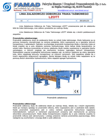 (+48) 774390070 / fax. (+48) 774316110 Marketing (+48) 774390071 [72,73] [email protected], www.famad.com.pl LINIA ZAŁADOWCZO ODBIORCZA TRAKA TAŚMOWEGO LZOTT v1 2013/01/23 Linia Załadowczo Odbiorcza do Traka Taśmowego LZOTT przeznaczona jest do załadunku kłód do traka taśmowego, oraz odbioru produktów po rozkroju kłody. Linia Załadowczo Odbiorcza do Traka Taśmowego LZOTT składa się z dwóch podstawowych zespołów: Przenośnika załadowczego Przenośnik załadowczy służy do podawania kłody na wózek traka taśmowego. Kłody ładowane są za pomocą transportu zewnętrznego na ramiona podajnika, które wyposażone są w specjalny łańcuch transportowy z zabierakami. Operator uruchamiając przenośnik transportuje kłodę w kierunku traka aż kłoda znajdzie się w polu działania ramienia hydraulicznego, które ładuje kłodę bezpośrednio na wózek traka. Ramiona przenośnika od strony załadunku kłody zostały wyposażone w specjalne blachy zamykające, w których znajduje się mechanizm śrubowy napinający łańcuch transportowy. Motoreduktor poprzez przekładnie łańcuchową napędza wał, na którym osadzone są cztery specjalne koła, które napędzają łańcuchy transportowy na czterech ramionach. Wał napędowy składa się z trzech segmentów połączonych sprzęgłem. Ramię ładujące kłodę na wózek traka napędzane są za pomocą dwóch siłowników hydraulicznych, które napędza agregat hydrauliczny. Przenośnik załadowczy Przenośnika odbiorczego Przenośnik odbiorczy służy do odebrania desek po rozkroju kłody, składa się z dwóch segmentów. Deski po rozcięciu spadają na przenośnik rolkowy, który wyposażony jest w podwójne koła zębate. Każdy przenośnik wyposażony jest w cztery ramiona poprzeczne łańcuchowe napędzane motoreduktorem. Łańcuch w ramionach poprzecznych unoszony jest mechanicznie za pomocą siłowników pneumatycznych. Kiedy deska transportowana znajdzie się w polu widzenia czujnika to przenośnik rolkowy jest zatrzymywany i zostają uniesione ramiona przenośnika poprzecznego, które następnie są uruchomiane i zrzucają deski w pole odbiorcze. 1 z 2| S t r o n a (+48) 774390070 / fax. (+48) 774316110 Marketing (+48) 774390071 [72,73] [email protected], www.famad.com.pl Przenośnik odbiorczy DANE TECHNICZNO - EKSPLOATACYJNE: Parametry elementu wsadowego: - średnica kłody - długość kłody PRZENOŚNIK ZAŁADOWCZY Prędkość Moc silnika Zasilanie elektryczne Napięcie sterownicze Poziom hałasu Wymiary urządzenia: • • • szerokość wysokość długość Masa urządzenia PRZENOŚNIK ODBIORCZY Prędkość Moc silnika Maksymalne ciśnienie robocze sprężonego powietrza Zasilanie elektryczne Napięcie sterownicze Poziom hałasu Wymiary urządzenia: • • • szerokość wysokość długość Masa urządzenia mm mm max 1000 2000 - 10000 m/min kW V AC V DC dBA 3-5 7 3x400 + PE – 50Hz 24 75 mm mm mm 7750 1600 5700 kg ~ 8000 m/min kW MPa V AC V DC dBA 30 - 50 0,55+1,5 0,6 3x400 + PE – 50Hz 24 75 mm mm mm 3700 1350 15000 kg ~ 4500 Paramerty linii załadowczo odbiorczej traka taśmowego dostosowywane są do indywidualnego zapotrzebowania klienta. 2 z 2| S t r o n a