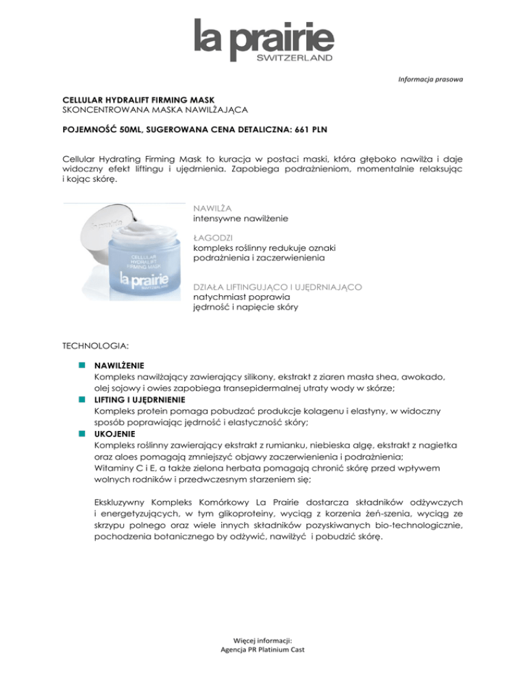 Informacja prasowa CELLULAR HYDRALIFT FIRMING MASK SKONCENTROWANA MASKA NAWILŻAJĄCA POJEMNOŚĆ 50ML, SUGEROWANA CENA DETALICZNA: 661 PLN Cellular Hydrating Firming Mask to kuracja w postaci maski, która głęboko nawilża i daje widoczny efekt liftingu i ujędrnienia. Zapobiega podrażnieniom, momentalnie relaksując i kojąc skórę. NAWILŻA intensywne nawilżenie ŁAGODZI kompleks roślinny redukuje oznaki podrażnienia i zaczerwienienia DZIAŁA LIFTINGUJĄCO I UJĘDRNIAJĄCO natychmiast poprawia jędrność i napięcie skóry TECHNOLOGIA: NAWILŻENIE Kompleks nawilżający zawierający silikony, ekstrakt z ziaren masła shea, awokado, olej sojowy i owies zapobiega transepidermalnej utraty wody w skórze; LIFTING I UJĘDRNIENIE Kompleks protein pomaga pobudzać produkcje kolagenu i elastyny, w widoczny sposób poprawiając jędrność i elastyczność skóry; UKOJENIE Kompleks roślinny zawierający ekstrakt z rumianku, niebieska algę, ekstrakt z nagietka oraz aloes pomagają zmniejszyć objawy zaczerwienienia i podrażnienia; Witaminy C i E, a także zielona herbata pomagają chronić skórę przed wpływem wolnych rodników i przedwczesnym starzeniem się; Ekskluzywny Kompleks Komórkowy La Prairie dostarcza składników odżywczych i energetyzujących, w tym glikoproteiny, wyciąg z korzenia żeń-szenia, wyciąg ze skrzypu polnego oraz wiele innych składników pozyskiwanych bio-technologicznie, pochodzenia botanicznego by odżywić, nawilżyć i pobudzić skórę. Więcej informacji: Agencja PR Platinium Cast