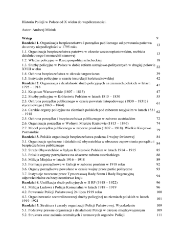 Historia Policji w Polsce od X wieku do współczesności. Autor: Andrzej Misiuk 9 Wstęp Rozdział 1. Organizacja bezpieczeństwa i porządku publicznego od powstania państwa 13 do utraty niepodległości w 1795 roku 1.1. Organizacja bezpieczeństwa państwa w okresie wczesnopiastowskim, rozbicia 13 dzielnicowego i monarchii stanowej 1.2. Władze policyjne w Rzeczpospolitej szlacheckiej 18 1.3. Służby policyjne w Polsce w dobie reform ustrojowo-politycznych w drugiej połowie 22 XVIII wieku 1.4. Ochrona bezpieczeństwa w okresie targowiczan 39 1.5. Instytucje policyjne w czasie insurekcji kościuszkowskiej 42 Rozdział 2. Organizacja i działalność służb policyjnych na ziemiach polskich w latach 47 1795 – 1918 2.1. Księstwo Warszawskie (1807 – 1815) 47 2.2. Służby policyjne w Królestwie Polskim w latach 1815 – 1830 55 2.3. Ochrona porządku publicznego w czasie powstań listopadowego (1830 – 1831) i 61 styczniowego (1863 – 1864) 2.4. Carskie organy policyjne na ziemiach polskich pod zaborem rosyjskim w latach 1831 62 – 1918 2.5. Ochrona porządku i bezpieczeństwa publicznego w zaborze austriackim 72 2.6. Organizacja porządku w Wolnym Mieście Krakowie (1815 – 1846) 74 2.7. Model porządku publicznego w zaborze pruskim (1807 – 1918). Wielkie Księstwo 79 Poznańskie Rozdział 3. Polskie organizacje bezpieczeństwa podczas I wojny światowej 84 3.1. Organizacje społeczne i działalność obywatelska w obszarze zapewnienia porządku i 84 bezpieczeństwa publicznego 3.2. Straże Obywatelskie w byłym Królestwie Polskim w latach 1914 – 1915 85 3.3. Polskie organy porządkowe na obszarze zaboru austriackiego 88 3.4. Milicja Miejska w latach 1916 – 1918 89 3.5. Formacje porządkowe w Galicji w zaborze pruskim w 1918 roku 92 3.6. Organy porządkowe powołane w czasie wojny przez partie polityczne 93 3.7. Instytucje tworzone przez Tymczasową Radę Stanu i Radę Regencyjną 94 odpowiedzialne za bezpieczeństwo kraju Rozdział 4. Unifikacja służb policyjnych w II RP (1918 – 1922) 96 4.1. Milicja Ludowa i Policja Komunalna w latach 1918 – 1919 96 4.2. Powstanie Policji Państwowej 24 lipca 1919 roku 100 4.3. Organizowanie scentralizowanej służby policyjnej na ziemiach polskich w latach 101 1919–1921 Rozdział 5. Struktura i zasady organizacji Policji Państwowej. Wyszkolenie 109 5.1. Podstawy prawne organizacji i działalność Policji w okresie międzywojennym 109 5.2. Struktura oraz zadania centralnych i terenowych organów Policji 111 5.3. Polityka kadrowa w Policji Państwowej 5.4. System szkolenia zawodowego Rozdział 6. Rola i miejsce Policji Państwowej w systemie polityczno-prawnym Polski w latach 1919 – 1939 6.1. Policja a władze administracji politycznej 6.2. Policja a inne instytucje państwowe oraz organy samorządowe 6.3. Rola Policji w życiu społeczno-politycznym kraju Rozdział 7. Policja kryminalna i polityczna w Polsce międzywojennej 7.1. Organizacja i działalność policji kryminalnej 7.2. Policja polityczna w II Rzeczpospolitej Rozdział 8. Losy polskich policjantów po 1 września 1939 roku 8.1. Przygotowania i udział Policji Państwowej i Policji Województwa Śląskiego w kampanii wrześniowej 1939 roku 8.2. Polscy policjanci w niewoli sowieckiej 8.3. Losy funkcjonariuszy Policji Państwowej po zakończeniu II wojny światowej Rozdział 9. Polska Policja w Generalnym Gubernatorstwie w czasie II wojny światowej 9.1. Sytuacja polityczna po 1939 roku 9.2. Organizacja Policji Polskiej Generalnego Gubernatorstwa 9.3. Polska Policja Kryminalna 9.4. Udział policji „granatowej” w ruchu oporu 9.5. Państwowy Korpus Bezpieczeństwa 9.6. Policja Polska w walce z przestępczością pospolitą 9.7. Społeczeństwo polskie a policja „granatowa” Rozdział 10. Działalność Milicji Obywatelskiej na tle przemian społecznych w powojennej Polsce 10.1. Dekret PKWN o ustanowieniu Milicji Obywatelskiej 10.2. Struktura organizacyjna MO 10.3. Cele i zadania Milicji Obywatelskiej – ideologizacja służby bezpieczeństwa publicznego 10.4. Specjalistyczne oddziały Milicjo – ZOMO 10.5. Rozwój uprawnień i obowiązków Milicji w zwalczaniu przestępczości i wykroczeń Rozdział 11. Policja w III Rzeczpospolitej 11.1. Nowa organizacja Policji po roku 1989 11.2. Struktura organizacyjna polskiej Policji na przełomie wieków XX i XXI 11.3. Polska Policja na arenie międzynarodowej 11.4. Policja w walce z przestępczością Bibliografia Indeks osób Ilustracje 115 117 122 122 126 130 135 135 140 148 148 153 157 160 160 161 163 165 166 167 168 171 172 174 177 181 182 187 187 196 206 208 216 221