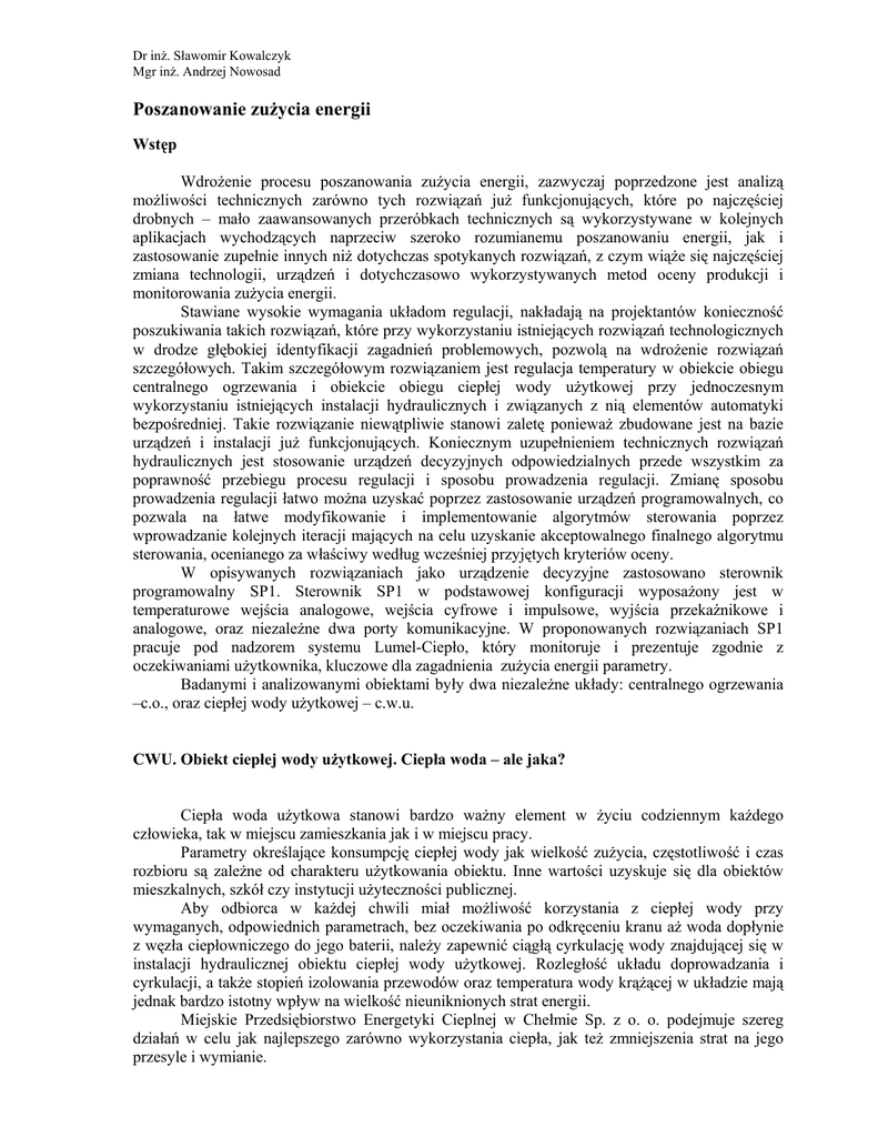 Dr inż. Sławomir Kowalczyk Mgr inż. Andrzej Nowosad Poszanowanie zużycia energii Wstęp Wdrożenie procesu poszanowania zużycia energii, zazwyczaj poprzedzone jest analizą możliwości technicznych zarówno tych rozwiązań już funkcjonujących, które po najczęściej drobnych – mało zaawansowanych przeróbkach technicznych są wykorzystywane w kolejnych aplikacjach wychodzących naprzeciw szeroko rozumianemu poszanowaniu energii, jak i zastosowanie zupełnie innych niż dotychczas spotykanych rozwiązań, z czym wiąże się najczęściej zmiana technologii, urządzeń i dotychczasowo wykorzystywanych metod oceny produkcji i monitorowania zużycia energii. Stawiane wysokie wymagania układom regulacji, nakładają na projektantów konieczność poszukiwania takich rozwiązań, które przy wykorzystaniu istniejących rozwiązań technologicznych w drodze głębokiej identyfikacji zagadnień problemowych, pozwolą na wdrożenie rozwiązań szczegółowych. Takim szczegółowym rozwiązaniem jest regulacja temperatury w obiekcie obiegu centralnego ogrzewania i obiekcie obiegu ciepłej wody użytkowej przy jednoczesnym wykorzystaniu istniejących instalacji hydraulicznych i związanych z nią elementów automatyki bezpośredniej. Takie rozwiązanie niewątpliwie stanowi zaletę ponieważ zbudowane jest na bazie urządzeń i instalacji już funkcjonujących. Koniecznym uzupełnieniem technicznych rozwiązań hydraulicznych jest stosowanie urządzeń decyzyjnych odpowiedzialnych przede wszystkim za poprawność przebiegu procesu regulacji i sposobu prowadzenia regulacji. Zmianę sposobu prowadzenia regulacji łatwo można uzyskać poprzez zastosowanie urządzeń programowalnych, co pozwala na łatwe modyfikowanie i implementowanie algorytmów sterowania poprzez wprowadzanie kolejnych iteracji mających na celu uzyskanie akceptowalnego finalnego algorytmu sterowania, ocenianego za właściwy według wcześniej przyjętych kryteriów oceny. W opisywanych rozwiązaniach jako urządzenie decyzyjne zastosowano sterownik programowalny SP1. Sterownik SP1 w podstawowej konfiguracji wyposażony jest w temperaturowe wejścia analogowe, wejścia cyfrowe i impulsowe, wyjścia przekaźnikowe i analogowe, oraz niezależne dwa porty komunikacyjne. W proponowanych rozwiązaniach SP1 pracuje pod nadzorem systemu Lumel-Ciepło, który monitoruje i prezentuje zgodnie z oczekiwaniami użytkownika, kluczowe dla zagadnienia zużycia energii parametry. Badanymi i analizowanymi obiektami były dwa niezależne układy: centralnego ogrzewania –c.o., oraz ciepłej wody użytkowej – c.w.u. CWU. Obiekt ciepłej wody użytkowej. Ciepła woda – ale jaka? Ciepła woda użytkowa stanowi bardzo ważny element w życiu codziennym każdego człowieka, tak w miejscu zamieszkania jak i w miejscu pracy. Parametry określające konsumpcję ciepłej wody jak wielkość zużycia, częstotliwość i czas rozbioru są zależne od charakteru użytkowania obiektu. Inne wartości uzyskuje się dla obiektów mieszkalnych, szkół czy instytucji użyteczności publicznej. Aby odbiorca w każdej chwili miał możliwość korzystania z ciepłej wody przy wymaganych, odpowiednich parametrach, bez oczekiwania po odkręceniu kranu aż woda dopłynie z węzła ciepłowniczego do jego baterii, należy zapewnić ciągłą cyrkulację wody znajdującej się w instalacji hydraulicznej obiektu ciepłej wody użytkowej. Rozległość układu doprowadzania i cyrkulacji, a także stopień izolowania przewodów oraz temperatura wody krążącej w układzie mają jednak bardzo istotny wpływ na wielkość nieuniknionych strat energii. Miejskie Przedsiębiorstwo Energetyki Cieplnej w Chełmie Sp. z o. o. podejmuje szereg działań w celu jak najlepszego zarówno wykorzystania ciepła, jak też zmniejszenia strat na jego przesyle i wymianie. W październiku 2003 roku w dwóch węzłach ciepłowniczych przedsiębiorstwa zastosowano eksperymentalny układ zaproponowany przez inż. A. Nowosada zmniejszający wartość zadaną temperatury wyjściowej cwu w normalnych warunkach rozbioru, do obniżonej wartości zadanej temperatury ciepłej wody podczas braku rozbioru. Jednym z wytypowanych do przetestowania układu obiektów był węzeł ciepłowniczy W - 009 wybudowany dla potrzeb Zespołu Szkół Ogólnokształcących nr 2 usytuowany w budynku szkolnym. Zespół szkół należy do odbiorców użytkujących cwu w czasie dnia. W godzinach wieczornych i nocnych rozbiór całkowicie ustaje. Układ przewiduje zmniejszenie wartości zadanej temperatury cwu z 49 ºC w normalnych warunkach rozbioru do 36 ºC w okresie braku rozbioru, oraz powrót do temperatury zadanej 49 ºC natychmiast po zaistnieniu rozbioru. Elementem sygnalizującym rozbiór cwu jest wodomierz z wyjściem impulsowym zamontowany na przewodzie doprowadzającym zimną wodę do wymiennika. Zastosowanie wodomierza z wyjściem impulsowym pozwala precyzyjnie określić moment faktycznego rozbioru jak i braku rozbioru i obniżyć w czasie jego trwania temperaturę zasilania cwu. W momencie pojawienia się rozbioru impulsy z wodomierza przesyłane są do urządzenia regulacyjnego powodując natychmiastowy powrót temperatury zasilania cwu z wartości 36 ºC do wartości wymaganej w warunkach rozbioru czyli 49 ºC. Urządzeniem decyzyjnym w układzie regulacji cwu jest sterownik SP1 firmy Lumel S.A. Inżynierowie firmy Lumel, w oparciu o sugestie inż. A. Nowosada, zaimplementowali w sterowniku algorytm umożliwiający właściwą pracę eksperymentalnego układu zarówno pod względem właściwej regulacji temperatury cwu jak i pracy członu obniżającego temperaturę. Sterownik został włączony do zbudowanego na urządzeniach firmy Lumel S.A. i na bazie programu Lumel – Ciepło, układu wizualizacji miejskiego systemu ciepłowniczego. Schemat technologiczny rozwiązania przedstawia rysunek 1. Rysunek 1 Schemat technologiczny węzła cieplnego. Zaimplementowany w sterowniku SP1 algory