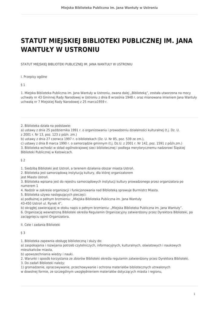 statut miejskiej biblioteki publicznej im. jana wantuły w ustroniu