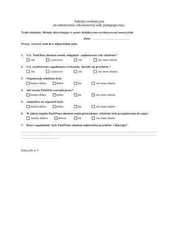 Ankieta ewaluacyjna na zakończenie szkoleniowej rady pedagogicznej. Tytuł szkolenia: Metody aktywizujące w pracy dydaktyczno-wychowawczej nauczyciela Data: .................................................. Proszę wstawić znak x w odpowiednie pole: 1. Czy Pani/Pan zdaniem zostały osiągnięte zaplanowane cele szkolenia? tak 2. częściowo dobra zła nie mam zdania dobre złe nie mam zdania dobra zła nie mam zdania W jakim stopniu Pani/Pana zdaniem osoba prowadząca szkolenie była przygotowana do zajęć; bardzo dobrze 7. nie mam zdania Atmosfera na zajęciach była: bardzo dobra 6. nie Jak ocenia Pani/Pan warunki pracy? bardzo dobre 5. nie mam zdania Organizacja szkolenia była: bardzo dobra 4. nie Czy zrealizowane zagadnienia i ćwiczenia okazały się przydatne ? tak 3. częściowo dobrze źle nie mam zdania Które zagadnienia były Pani/Pana zdaniem najbardziej przydatne i dlaczego? ..................................................................................................................................................................................... ..................................................................................................................................................................................... .................................................... Załącznik nr 5