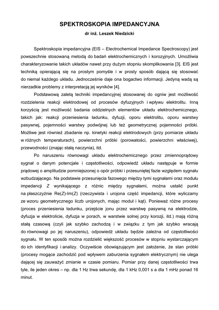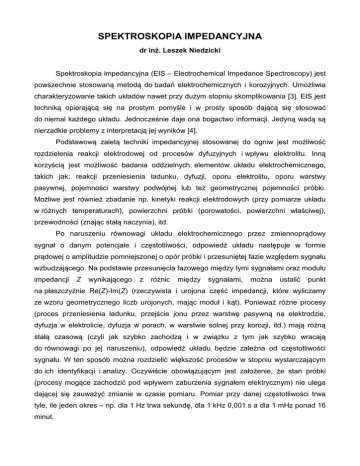 SPEKTROSKOPIA IMPEDANCYJNA dr inż. Leszek Niedzicki Spektroskopia impedancyjna (EIS – Electrochemical Impedance Spectroscopy) jest powszechnie stosowaną metodą do badań elektrochemicznych i korozyjnych. Umożliwia charakteryzowanie takich układów nawet przy dużym stopniu skomplikowania [3]. EIS jest techniką opierającą się na prostym pomyśle i w prosty sposób dającą się stosować do niemal każdego układu. Jednocześnie daje ona bogactwo informacji. Jedyną wadą są nierzadkie problemy z interpretacją jej wyników [4]. Podstawową zaletą techniki impedancyjnej stosowanej do ogniw jest możliwość rozdzielenia reakcji elektrodowej od procesów dyfuzyjnych i wpływu elektrolitu. Inną korzyścią jest możliwość badania oddzielnych elementów układu elektrochemicznego, takich jak: reakcji przeniesienia ładunku, dyfuzji, oporu elektrolitu, oporu warstwy pasywnej, pojemności warstwy podwójnej lub też geometrycznej pojemności próbki. Możliwe jest również zbadanie np. kinetyki reakcji elektrodowych (przy pomiarze układu w różnych temperaturach), powierzchni próbki (porowatości, powierzchni właściwej), przewodności (znając stałą naczynia), itd. Po naruszeniu równowagi układu elektrochemicznego przez zmiennoprądowy sygnał o danym potencjale i częstotliwości, odpowiedź układu następuje w formie prądowej o amplitudzie pomniejszonej o opór próbki i przesuniętej fazie względem sygnału wzbudzającego. Na podstawie przesunięcia fazowego między tymi sygnałami oraz modułu impedancji Z wynikającego z różnic między sygnałami, można ustalić punkt na płaszczyźnie Re(Z)-Im(Z) (rzeczywista i urojona część impedancji, które wyliczamy ze wzoru geometrycznego liczb urojonych, mając moduł i kąt). Ponieważ różne procesy (proces przeniesienia ładunku, przejście jonu przez warstwę pasywną na elektrodzie, dyfuzja w elektrolicie, dyfuzja w porach, w warstwie solnej przy korozji, itd.) mają różną stałą czasową (czyli jak szybko zachodzą i w związku z tym jak szybko wracają do równowagi po jej naruszeniu), odpowiedź układu będzie zależna od częstotliwości sygnału. W ten sposób można rozdzielić większość procesów w stopniu wystarczającym do ich identyfikacji i analizy. Oczywiście obowiązującym jest założenie, że stan próbki (procesy mogące zachodzić pod wpływem zaburzenia sygnałem elektrycznym) nie ulega dającej się zauważyć zmianie w czasie pomiaru. Pomiar przy danej częstotliwości trwa tyle, ile jeden okres – np. dla 1 Hz trwa sekundę, dla 1 kHz 0,001 s a dla 1 mHz ponad 16 minut. Tak więc, jeśli przykładamy zmiennoprądowy sygnał napięciowy o małej amplitudzie (w celu możliwie małego zaburzenia próbki): E (t ) = E0 cos(ωt ) (1) gdzie: E(t) – potencjał w czasie t [V]; t – czas [s]; E0 – amplituda sygnału [V]; ω – częstotliwość kołowa (ω = 2πf, f – częstotliwość) [Hz]; Odpowiedzią układu na taki sygnał jest odpowiedź prądowa: I (t ) = I 0 cos(ωt + ϕ ) (2) gdzie : I(t) – natężenie prądu w czasie t [A]; t – czas [s]; I0 – amplituda sygnału [A]; ω – częstotliwość kołowa (ω = 2πf, f – częstotliwość) [Hz]; φ – przesunięcie fazowe; Tak więc impedancja wyraża się wzorem: Z= E (t ) cos(ωt ) = Z0 I (t ) cos(ωt + ϕ ) (3) gdzie: Z – impedancja; Z0 – moduł impedancji; φ – kąt przesunięcia fazowego; Do prezentacji wyników impedancyjnych (sygnału wyjściowego, czyli odpowiedzi prądowej) najczęściej używa się wykresów Nyquista lub Bode'ego. Wykres Nyquista to krzywa w układzie Re(Z) - -Im(Z), natomiast Bode'ego to dwie krzywe w układzie log(f) - log(Z) (jedna krzywa) i log(f) - log(φ) (druga krzywa na tym samym wykresie). Odwrócenie osi części urojonej wynika z konwencji przedstawiania wyników elektrochemicznych w pierwszej ćwiartce układu współrzędnych. Wykres Nyquista łatwo interpretować jeśli chodzi o naturę procesów, natomiast z wykresu Bode'ego łatwo ustalić ilość elementów i zakres częstotliwości przy których zachodzą. Zależność między układem Nyquista i Bode’ego to: Re(Z) = |Z|·cosφ (4a) -Im(Z) = -|Z|·sinφ (4b) Aby pomiary nie trwały nieskończenie długo (czas jest wielkością ciągłą), przyrząd pomiarowy (FRA – Frequency Response Analyzer – analizator odpowiedzi częstotliwościowej) wybiera na skali częstotliwości pojedyncze punkty i ze zmierzonych odpowiedzi prądowych przy tych częstotliwościach tworzy widmo impedancyjne. Większość procesów elektrochemicznych, bądź fizycznych, daje się interpretować w spektroskopii impedancyjnej jako elementy elektryczne obwodów o odpowiednich stałych czasowych. Najpopularniejszym przykładem jest warstwa podwójna na elektrodzie, 2 która składając się z powierzchni elektrody o jednym ładunku i powierzchni tworzonej przez pokrywające ją jony przeciwnego ładunku może być przybliżona jako kondensator. Stąd narodziła się idea reprezentacji widm impedancyjnych jako tak zwanych obwodów zastępczych. Polega to na przyporządkowaniu każdemu procesowi chemicznemu (elektrochemicznemu) odpowiedniego elementu typu RLC (lub mu zbliżonego) o odpowiednim parametrze charakteryzującym i tworząc z takich elementów obwód elektryczny. Czyli np. warstwie podwójnej - kondensatora, a warstwie pasywnej – opornika. Procesy ściśle powiązane ze sobą łączy się równolegle, natomiast niezależne od siebie łączy się szeregowo. Na widmie impedancyjnym (wykres Nyquista) elementy RLC mają następującą reprezentację ( i = − 1 ): opór (opornik) – Z = R (R – opór) – rys. 1: pojemność (kondensator) – Z = -1/iωC (C – pojemność) – rys. 2: Rys. 1. Wykres Nyquista dla opornika Rys. 2. Wykres Nyquista dla kondensatora Rys. 3. Wykres Nyquista dla cewki Rys. 4. Wykres Nyquista dla elementu dyfuzyjnego Warburga 3 indukcyjność (cewka) – Z = iωL (L – indukcyjność) – rys. 3: Na potrzeby 