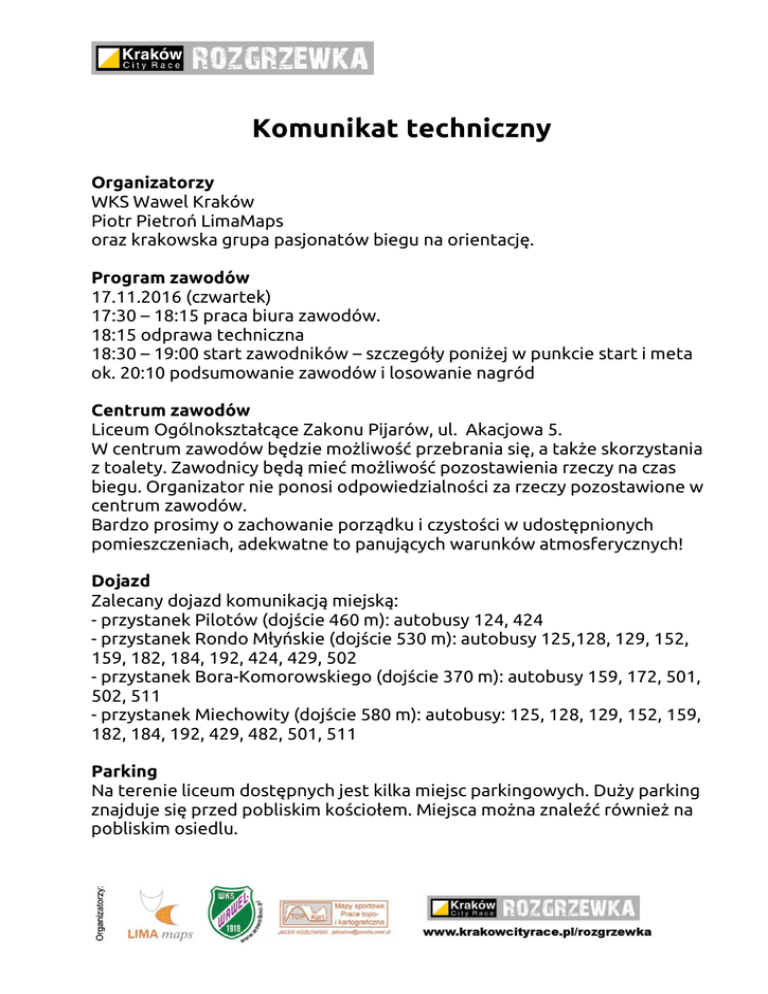 Komunikat techniczny Organizatorzy WKS Wawel Kraków Piotr Pietroń LimaMaps oraz krakowska grupa pasjonatów biegu na orientację. Program zawodów 17.11.2016 (czwartek) 17:30 – 18:15 praca biura zawodów. 18:15 odprawa techniczna 18:30 – 19:00 start zawodników – szczegóły poniżej w punkcie start i meta ok. 20:10 podsumowanie zawodów i losowanie nagród Centrum zawodów Liceum Ogólnokształcące Zakonu Pijarów, ul. Akacjowa 5. W centrum zawodów będzie możliwość przebrania się, a także skorzystania z toalety. Zawodnicy będą mieć możliwość pozostawienia rzeczy na czas biegu. Organizator nie ponosi odpowiedzialności za rzeczy pozostawione w centrum zawodów. Bardzo prosimy o zachowanie porządku i czystości w udostępnionych pomieszczeniach, adekwatne to panujących warunków atmosferycznych! Dojazd Zalecany dojazd komunikacją miejską: - przystanek Pilotów (dojście 460 m): autobusy 124, 424 - przystanek Rondo Młyńskie (dojście 530 m): autobusy 125,128, 129, 152, 159, 182, 184, 192, 424, 429, 502 - przystanek Bora-Komorowskiego (dojście 370 m): autobusy 159, 172, 501, 502, 511 - przystanek Miechowity (dojście 580 m): autobusy: 125, 128, 129, 152, 159, 182, 184, 192, 429, 482, 501, 511 Parking Na terenie liceum dostępnych jest kilka miejsc parkingowych. Duży parking znajduje się przed pobliskim kościołem. Miejsca można znaleźć również na pobliskim osiedlu. W trakcie trwania zawodów w sąsiedniej szkole (Gimnazjum Pijarów) odbywać się będzie wywiadówka, więc trzeba się liczyć ze zwiększoną liczbą parkujących w okolicy samochodów. Biuro zawodów Czynne w godzinach 17:15 – 18:15 w budynku liceum. Podczas wizyty w biurze zawodów każdy zawodnik otrzyma elektroniczną kartę chipową oraz podpisze oświadczenie o przestrzeganiu regulaminu. O godzinie 18:15 odbędzie się odprawa techniczna poświęcona potwierdzaniu punktów kontrolnych. Start i meta Start i meta będą znajdować się przed budynkiem liceum. Start uczestników interwałowy, co 1 minutę lub 30 sekund, w zależności od liczby uczestników, począwszy od 18:30. Forma przeprowadzenia zawodów Uczestnicy otrzymają mapę w skali 1:4000, na której zaznaczono „klasyczną” trasę biegu na orientację z narzuconą kolejnością zaliczania punktów kontrolnych (PK). Zawody odbywają się całkowicie po zmroku, tak więc wskazanym jest zabranie czołówki lub innej latarki. Potwierdzanie punktów kontrolnych Potwierdzanie obecności na PK, odbywać się będzie przy pomocy elektronicznego systemu SPORTIdent. Stacje SportIdent’a przymocowane będą do stałych elementów (poręcze, drzewa i inne metalowe konstrukcje). Elementem punktu jest także lampion z kodem i odblask. Sposób potwierdzania punktów kontrolnych zostanie wytłumaczony podczas odprawy technicznej. Limit czasu Na wszystkich trasach limit czasowy to 60 min. Teren zawodów Obejmuje tereny mieszkaniowe w Rakowicach, czyli południowej części dzielnicy Prądnik Czerwony. Mapa obejmuje osiedla: Ugorek, Pszona, Akacjowa oraz teren Kolegium Pijarów. Jest to teren o małym ruchu samochodowym, dominują w większości ulice osiedlowe o małym ruchu. Teren zawodów dzieli na dwie części ruchliwa ulica Pilotów. Ulicę tę przekraczają zawodnicy na trasach Mistrz i Czeladnik. Przekraczanie tej ulicy dozwolone jest jedynie z wykorzystaniem przejść dla pieszych (symbol przejścia dla pieszych powyżej). Przekraczanie tej ulicy w każdym innym miejscu jest zakazane i grozi dyskwalifikacją. Prosimy również o uwagę podczas przekraczania każdej ulicy. Przypominamy, że biegnący zawodnik nie ma pierwszeństwa przed jadącym samochodem. Uczestnicy poruszają się po terenie zawodów na własną odpowiedzialność!!! Mapa Rakowice, skala 1:4000, warstwice co 2 m. Autor: Piotr Pietroń, listopad 2016 r. Opisy punktów kontrolnych będą na mapie. Parametry tras Trasa A TERMINATOR ok. 2,7 km, 12 PK, Trasa B CZELADNIK ok. 3,8 km, 16 PK, Trasa C MISTRZ ok. 4,8 km, 17 PK, Klasyfikacja O kolejności w klasyfikacji końcowej będzie decydowała liczba zaliczonych punktów kontrolnych, a następnie czas pokonania trasy. Nagrody Wszyscy zawodnicy, którzy zostaną na zakończeniu zawodów, wezmą udział w losowaniu nagród. Nagroda główna to bon podarunkowy na kwotę 100 zł do sklepu Decathlon. Świadczenia W ramach opłaty startowej organizator zapewnia zawodnikom: - mapę z zaznaczoną trasą biegu - drobny poczęstunek - pomiar czasu i weryfikacje poprawności pokonania trasy - dostęp do toalet i pomieszczeń szkolnych jako miejsca do przebrania się. Uwagi - Wniesienie opłaty za bieg jest równoznaczne z akceptacją regulaminu zawodów oraz zobowiązaniem się do jego przestrzegania. - Organizator nie ponosi odpowiedzialności materialnej za rzeczy zaginione w trakcie trwania zawodów. - Zawodnicy startują na własną odpowiedzialność z pełną świadomością możliwych niebezpieczeństw i ryzyka z tym związanego. W przypadku wypadku, utraty zdrowia lub mienia, osoby te nie będą rościły żadnych zobowiązań wobec organizatorów, współorganizatorów udostępniających swoje obiekty na czas i okoliczność zawodów. - Zawodnicy zobowiązani są do przestrzegania przepisów Kodeksu Drogowego. - Na zawodach nie będzie zapewniona opieka lekarska. - W sprawach spornych ostateczna decyzja należy do sędziego głównego. - Organizator zastrzega sobie prawo do ostatecznej interpretacji niniejszego regulaminu. Projekt jest realizowany przy wsparciu finansowym Województwa Małopolskiego