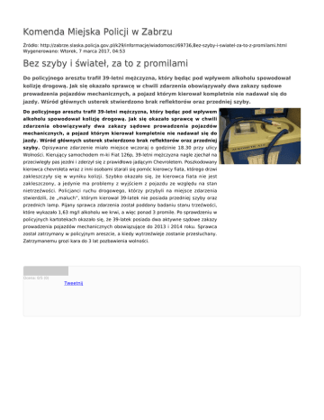 Komenda Miejska Policji w Zabrzu Źródło: http://zabrze.slaska.policja.gov.pl/k29/informacje/wiadomosci/69736,Bez-szyby-i-swiatel-za-to-z-promilami.html Wygenerowano: Wtorek, 7 marca 2017, 04:53 Bez szyby i świateł, za to z promilami Do policyjnego aresztu trafił 39-letni mężczyzna, który będąc pod wpływem alkoholu spowodował kolizję drogową. Jak się okazało sprawcę w chwili zdarzenia obowiązywały dwa zakazy sądowe prowadzenia pojazdów mechanicznych, a pojazd którym kierował kompletnie nie nadawał się do jazdy. Wśród głównych usterek stwierdzono brak reflektorów oraz przedniej szyby. Do policyjnego aresztu trafił 39-letni mężczyzna, który będąc pod wpływem alkoholu spowodował kolizję drogową. Jak się okazało sprawcę w chwili zdarzenia obowiązywały dwa zakazy sądowe prowadzenia pojazdów mechanicznych, a pojazd którym kierował kompletnie nie nadawał się do jazdy. Wśród głównych usterek stwierdzono brak reflektorów oraz przedniej szyby. Opisywane zdarzenie miało miejsce wczoraj o godzinie 18.30 przy ulicy Wolności. Kierujący samochodem m-ki Fiat 126p, 39-letni mężczyzna nagle zjechał na przeciwległy pas jezdni i zderzył się z prawidłowo jadącym Chevroletem. Poszkodowany kierowca chevroleta wraz z inni osobami starali się pomóc kierowcy fiata, którego drzwi zakleszczyły się w wyniku kolizji. Szybko okazało się, że kierowca fiata nie jest zakleszczony, a jedynie ma problemy z wyjściem z pojazdu ze względu na stan nietrzeźwości. Policjanci ruchu drogowego, którzy przybyli na miejsce zdarzenia stwierdzili, że „maluch”, którym kierował 39-latek nie posiada przedniej szyby oraz przednich lamp. Pijany sprawca zdarzenia został poddany badaniu stanu trzeźwości, które wykazało 1,63 mg/l alkoholu we krwi, a więc ponad 3 promile. Po sprawdzeniu w policyjnych kartotekach okazało się, że 39-latek posiada dwa aktywne sądowe zakazy prowadzenia pojazdów mechanicznych obowiązujące do 2013 i 2014 roku. Sprawca został zatrzymany w policyjnym areszcie, a kiedy wytrzeźwieje zostanie przesłuchany. Zatrzymanemu grozi kara do 3 lat pozbawienia wolności. Ocena: 0/5 (0) Tweetnij