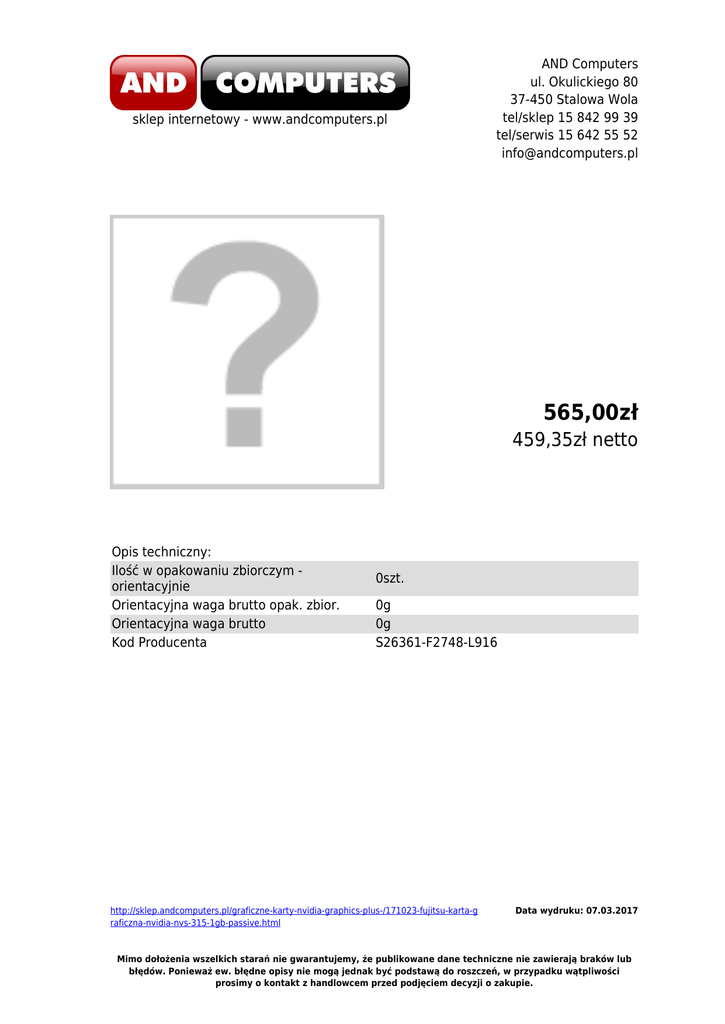 sklep internetowy - www.andcomputers.pl AND Computers ul. Okulickiego 80 37-450 Stalowa Wola tel/sklep 15 842 99 39 tel/serwis 15 642 55 52 [email protected] 565,00zł 459,35zł netto Opis techniczny: Ilość w opakowaniu zbiorczym orientacyjnie Orientacyjna waga brutto opak. zbior. Orientacyjna waga brutto Kod Producenta 0szt. 0g 0g S26361-F2748-L916 http://sklep.andcomputers.pl/graficzne-karty-nvidia-graphics-plus-/171023-fujitsu-karta-g raficzna-nvidia-nvs-315-1gb-passive.html Data wydruku: 07.03.2017 Mimo dołożenia wszelkich starań nie gwarantujemy, że publikowane dane techniczne nie zawierają braków lub błędów. Ponieważ ew. błędne opisy nie mogą jednak być podstawą do roszczeń, w przypadku wątpliwości prosimy o kontakt z handlowcem przed podjęciem decyzji o zakupie.