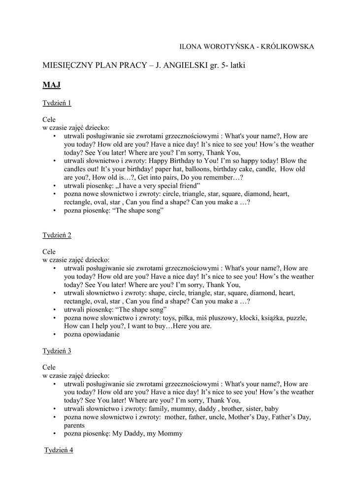 ILONA WOROTYŃSKA - KRÓLIKOWSKA MIESIĘCZNY PLAN PRACY – J. ANGIELSKI gr. 5- latki MAJ Tydzień 1 Cele w czasie zajęć dziecko: • utrwali posługiwanie sie zwrotami grzecznościowymi : What's your name?, How are you today? How old are you? Have a nice day! It’s nice to see you! How’s the weather today? See You later! Where are you? I’m sorry, Thank You, • utrwali słownictwo i zwroty: Happy Birthday to You! I’m so happy today! Blow the candles out! It’s your birthday! paper hat, balloons, birthday cake, candle, How old are you?, How old is…?, Get into pairs, Do you remember…? • utrwali piosenkę: „I have a very special friend” • pozna nowe słownictwo i zwroty: circle, triangle, star, square, diamond, heart, rectangle, oval, star , Can you find a shape? Can you make a …? • pozna piosenkę: “The shape song” Tydzień 2 Cele w czasie zajęć dziecko: • utrwali posługiwanie sie zwrotami grzecznościowymi : What's your name?, How are you today? How old are you? Have a nice day! It’s nice to see you! How’s the weather today? See You later! Where are you? I’m sorry, Thank You, • utrwali słownictwo i zwroty: shape, circle, triangle, star, square, diamond, heart, rectangle, oval, star , Can you find a shape? Can you make a …? • utrwali piosenkę: “The shape song” • pozna nowe słownictwo i zwroty: toys, piłka, miś pluszowy, klocki, książka, puzzle, How can I help you?, I want to buy…Here you are. • pozna opowiadanie Tydzień 3 Cele w czasie zajęć dziecko: • utrwali posługiwanie sie zwrotami grzecznościowymi : What's your name?, How are you today? How old are you? Have a nice day! It’s nice to see you! How’s the weather today? See You later! Where are you? I’m sorry, Thank You, • utrwali słownictwo i zwroty: family, mummy, daddy , brother, sister, baby • pozna nowe słownictwo i zwroty: mother, father, uncle, Mother’s Day, Father’s Day, parents • pozna piosenkę: My Daddy, my Mommy Tydzień 4 Cele w czasie zajęć dziecko: • utrwali posługiwanie sie zwrotami grzecznościowymi : What's your name?, How are you today? How old are you? Have a nice day! It’s nice to see you! How’s the weather today? See You later! Where are you? I’m sorry, Thank You, • utrwali słownictwo i zwroty: shape, circle, triangle, star, square, diamond, heart, rectangle, oval, star , Can you find a shape? Can you make a …? toys, ball, teaddy bear, blocks, book, puzzle, How can I help you?, I want to buy…Here you are, shapes and colours • pozna nowe słownictwo i zwroty: What do you like playing with? Who’s this? What have you got? I like playing with…This is my favourite toy. Piosenki: “The shape song” Can you make a circle? Can you make a heart, squere, diamond? Can you make a triangle, rectangle? Can you find a …?