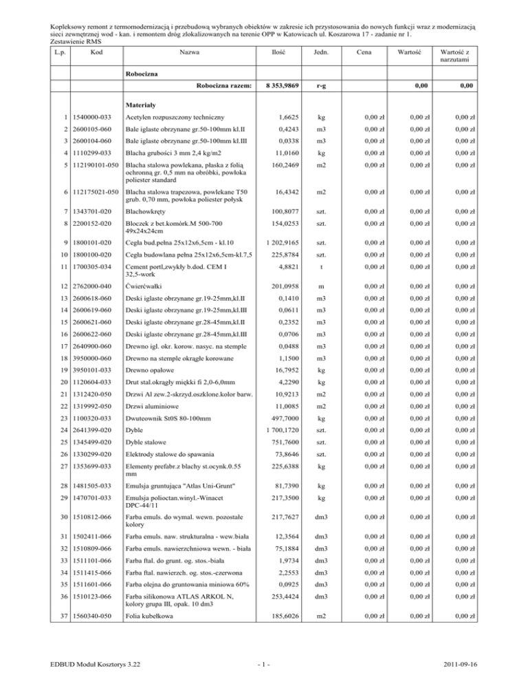 Kopleksowy remont z termomodernizacją i przebudową wybranych obiektów w zakresie ich przystosowania do nowych funkcji wraz z modernizacją sieci zewnętrznej wod - kan. i remontem dróg zlokalizowanych na terenie OPP w Katowicach ul. Koszarowa 17 - zadanie nr 1. Zestawienie RMS L.p. Kod Nazwa Ilość Jedn. Cena Wartość Wartość z narzutami Robocizna Robocizna razem: 8 353,9869 r-g 0,00 0,00 Materiały 1 1540000-033 Acetylen rozpuszczony techniczny 1,6625 kg 0,00 zł 0,00 zł 0,00 zł 2 2600105-060 Bale iglaste obrzynane gr.50-100mm kl.II 0,4243 m3 0,00 zł 0,00 zł 0,00 zł 3 2600104-060 Bale iglaste obrzynane gr.50-100mm kl.III 4 1110299-033 Blacha grubości 3 mm 2,4 kg/m2 0,0338 m3 0,00 zł 0,00 zł 0,00 zł 11,0160 kg 0,00 zł 0,00 zł 0,00 zł 5 112190101-050 Blacha stalowa powlekana, płaska z folią ochronną gr. 0,5 mm na obróbki, powłoka poliester standard 160,2469 m2 0,00 zł 0,00 zł 0,00 zł 6 112175021-050 Blacha stalowa trapezowa, powlekane T50 grub. 0,70 mm, powłoka poliester połysk 16,4342 m2 0,00 zł 0,00 zł 0,00 zł 7 1343701-020 Blachowkręty 100,8077 szt. 0,00 zł 0,00 zł 0,00 zł 8 2200152-020 Bloczek z bet.komórk.M 500-700 49x24x24cm 154,0253 szt. 0,00 zł 0,00 zł 0,00 zł 9 1800101-020 Cegła bud.pełna 25x12x6,5cm - kl.10 1 202,9165 szt. 0,00 zł 0,00 zł 0,00 zł 225,8784 10 1800100-020 Cegła budowlana pełna 25x12x6,5cm-kl.7,5 11 1700305-034 Cement portl,zwykły b.dod. CEM I 32,5-work szt. 0,00 zł 0,00 zł 0,00 zł 4,8821 t 0,00 zł 0,00 zł 0,00 zł 12 2762000-040 Ćwierćwałki 201,0958 m 0,00 zł 0,00 zł 0,00 zł 13 2600618-060 Deski iglaste obrzynane gr.19-25mm,kl.II 0,1410 m3 0,00 zł 0,00 zł 0,00 zł 14 2600619-060 Deski iglaste obrzynane gr.19-25mm,kl.III 0,0611 m3 0,00 zł 0,00 zł 0,00 zł 15 2600621-060 Deski iglaste obrzynane gr.28-45mm,kl.II 0,2352 m3 0,00 zł 0,00 zł 0,00 zł 16 2600622-060 Deski iglaste obrzynane gr.28-45mm,kl.III 0,0706 m3 0,00 zł 0,00 zł 0,00 zł 17 2640900-060 Drewno igl. okr. korow. nasyc. na stemple 0,0488 m3 0,00 zł 0,00 zł 0,00 zł 18 3950000-060 Drewno na stemple okrągłe korowane 19 3950101-033 Drewno opałowe 20 1120604-033 Drut stal.okrągły miękki fi 2,0-6,0mm 21 1312420-050 22 1319992-050 23 1100320-033 Dwuteownik St0S 80-100mm 24 2641399-020 Dyble 25 1345499-020 Dyble stalowe 26 1330299-020 Elektrody stalowe do spawania 27 1353699-033 Elementy prefabr.z blachy st.ocynk.0.55 mm 28 1481505-033 Emulsja gruntująca "Atlas Uni-Grunt" 29 1470701-033 Emulsja polioctan.winyl.-Winacet DPC-44/11 30 1510812-066 Farba emuls. do wymal. wewn. pozostałe kolory 31 1502411-066 1,1500 m3 0,00 zł 0,00 zł 0,00 zł 16,7952 kg 0,00 zł 0,00 zł 0,00 zł 4,2290 kg 0,00 zł 0,00 zł 0,00 zł Drzwi Al zew.2-skrzyd.oszklone.kolor barw. 10,9213 m2 0,00 zł 0,00 zł 0,00 zł Drzwi aluminiowe 11,0085 m2 0,00 zł 0,00 zł 0,00 zł 497,7000 kg 0,00 zł 0,00 zł 0,00 zł 1 700,1720 szt. 0,00 zł 0,00 zł 0,00 zł 751,7600 szt. 0,00 zł 0,00 zł 0,00 zł 73,8646 szt. 0,00 zł 0,00 zł 0,00 zł 225,6388 kg 0,00 zł 0,00 zł 0,00 zł 81,7390 kg 0,00 zł 0,00 zł 0,00 zł 217,3500 kg 0,00 zł 0,00 zł 0,00 zł 217,7627 dm3 0,00 zł 0,00 zł 0,00 zł Farba emuls. naw. strukturalna - wew.biała 12,3564 dm3 0,00 zł 0,00 zł 0,00 zł 32 1510809-066 Farba emuls. nawierzchniowa wewn. - biała 75,1884 dm3 0,00 zł 0,00 zł 0,00 zł 33 1511101-066 Farba ftal. do grunt. og. stos.-biała 1,9734 dm3 0,00 zł 0,00 zł 0,00 zł 34 1511415-066 Farba ftal. nawierzch. og. stos.-czerwona 2,2553 dm3 0,00 zł 0,00 zł 0,00 zł 35 1511601-066 Farba olejna do gruntowania miniowa 60% 0,0925 dm3 0,00 zł 0,00 zł 0,00 zł 36 1510123-066 Farba silikonowa ATLAS ARKOL N, kolory grupa III, opak. 10 dm3 253,4424 dm3 0,00 zł 0,00 zł 0,00 zł 37 1560340-050 Folia kubełkowa 185,6026 m2 0,00 zł 0,00 zł 0,00 zł EDBUD Moduł Kosztorys 3.22 -1- 2011-09-16 Kopleksowy remont z termomodernizacją i przebudową wybranych obiektów w zakresie ich przystosowania do nowych funkcji wraz z modernizacją sieci zewnętrznej wod - kan. i remontem dróg zlokalizowanych na terenie OPP w Katowicach ul. Koszarowa 17 - zadanie nr 1. Zestawienie RMS L.p. Kod Nazwa Ilość 38 156030101-050 Folia PE paroizolacyjna ROCKWOOL, stabilizowana grub. 0,2 mm, szerokość 2,0 m Jedn. Cena Wartość Wartość z narzutami 7,9596 m2 0,00 zł 0,00 zł 0,00 zł 74,5200 m2 0,00 zł 0,00 zł 0,00 zł 40 174010107-033 Gips budowlany GIPSAR GB , opak. 25 kg 1 520,5773 kg 0,00 zł 0,00 zł 0,00 zł 41 1740224-033 Gips szpachl. "Gispar Uni" 1 903,5205 kg 0,00 zł 0,00 zł 0,00 zł 42 1740222-033 Gips szpachl. Dolina Nidy "Dolonez" 3,3211 kg 0,00 zł 0,00 zł 0,00 zł 43 1740221-033 Gips szpachl. Dolina Nidy "Ekstra" 9,5869 kg 0,00 zł 0,00 zł 0,00 zł 44 1330499-033 Gwoździe budowlane okrągłe gołe 39 1560412-050 Folia z PVC o gr.0,15-0,25mm 10,9252 kg 0,00 zł 0,00 zł 0,00 zł 45 133056540-033 Gwoździe typ 4,0/35, 4,0/40, 4,0/50, 4,0/60 mm 0,9397 kg 0,00 zł 0,00 zł 0,00 zł 46 1340399-033 Haki do muru 5,6386 kg 0,00 zł 0,00 zł 0,00 zł 47 1220299-040 Kątowniki aluminiowe 542,6064 m 0,00 zł 0,00 zł 0,00 zł 48 1341299-033 Klamry ciesielskie z prętów stal. typu U 53,2706 kg 0,00 zł 0,00 zł 0,00 zł 49 1550203-033 Klej kauczukowy-rozpuszcz.Butapren OBT-III 5,7136 kg 0,00 zł 0,00 zł 0,00 zł 50 1551000-033 Klej winyl-emuls. do wykł.PVC "Osakrylowy" 84,5760 kg 0,00 zł 0,00 zł 0,00 zł 51 6803599-020 Kołki do wstrzeliwania 29,4870 szt. 0,00 zł 0,00 zł 0,00 zł 52 8990499-020 Kołki rozporowe 94,2981 szt. 0,00 zł 0,00 zł 0,00 zł 53 8990412-020 Kołki rozporowe plastykowe fi 8 mm 274,1250 szt. 0,00 zł 0,00 zł 0,00 zł 54 1341099-020 Kotwy elastyczne kpl. 366,9838 szt. 0,00 zł 0,00 zł 0,00 zł 55 1040600-033 Lepik asfalt.stos.na gorąco b/wypełniacza 11,1780 kg 0,00 zł 0,00 zł 0,00 zł 56 2313301-040 Listwa cokołowa LC-ECOROCK 153 mm 17,0625 m 0,00 zł 0,00 zł 0,00 zł 57 2313301-040 Listwa cokołowa LC-ECOROCK 83 mm 58 1566313-040 Listwa wykoń. PVC do pł.ceram.