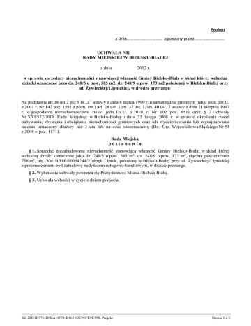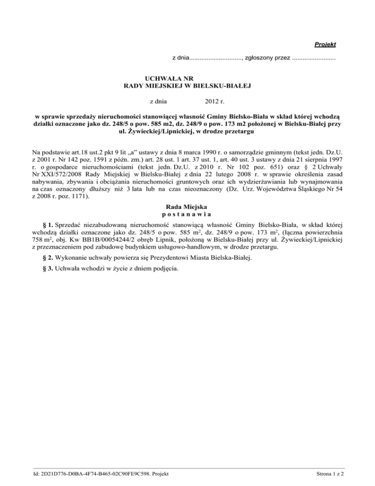 Projekt z dnia.............................., zgłoszony przez ......................... UCHWAŁA NR RADY MIEJSKIEJ W BIELSKU-BIAŁEJ z dnia 2012 r. w sprawie sprzedaży nieruchomości stanowiącej własność Gminy Bielsko-Biała w skład której wchodzą działki oznaczone jako dz. 248/5 o pow. 585 m2, dz. 248/9 o pow. 173 m2 położonej w Bielsku-Białej przy ul. Żywieckiej/Lipnickiej, w drodze przetargu Na podstawie art.18 ust.2 pkt 9 lit „a” ustawy z dnia 8 marca 1990 r. o samorządzie gminnym (tekst jedn. Dz.U. z 2001 r. Nr 142 poz. 1591 z późn. zm.) art. 28 ust. 1 art. 37 ust. 1, art. 40 ust. 3 ustawy z dnia 21 sierpnia 1997 r. o gospodarce nieruchomościami (tekst jedn. Dz.U. z 2010 r. Nr 102 poz. 651) oraz § 2 Uchwały Nr XXI/572/2008 Rady Miejskiej w Bielsku-Białej z dnia 22 lutego 2008 r. w sprawie określenia zasad nabywania, zbywania i obciążania nieruchomości gruntowych oraz ich wydzierżawiania lub wynajmowania na czas oznaczony dłuższy niż 3 lata lub na czas nieoznaczony (Dz. Urz. Województwa Śląskiego Nr 54 z 2008 r. poz. 1171). Rada Miejska postanawia § 1. Sprzedać niezabudowaną nieruchomość stanowiącą własność Gminy Bielsko-Biała, w skład której wchodzą działki oznaczone jako dz. 248/5 o pow. 585 m2, dz. 248/9 o pow. 173 m2, (łączna powierzchnia 758 m2, obj. Kw BB1B/00054244/2 obręb Lipnik, położoną w Bielsku-Białej przy ul. Żywieckiej/Lipnickiej z przeznaczeniem pod zabudowę budynkiem usługowo-handlowym, w drodze przetargu. § 2. Wykonanie uchwały powierza się Prezydentowi Miasta Bielska-Białej. § 3. Uchwała wchodzi w życie z dniem podjęcia. ——————————————————————————————————————————————————————— Id: 2D21D776-D0BA-4F74-B465-02C90FE9C598. Projekt Strona 1 z 2 Uzasadnienie Nieruchomość gminna, w skład której wchodzą działki oznaczone jako dz. 248/5 o pow. 585 m2i dz. 248/9 o pow. 173 m2o łącznej powierzchni 758 m2, położone są przy ul. Żywieckiej/Lipnickiej, obręb Lipnik. Dla opisanego terenu nie obowiązuje plan zagospodarowania. Zgodnie z decyzją o warunkach zabudowy działka 248/5 może zostać przeznaczona pod budowę budynku usługowo-handlowego. Sprzedaż działek 248/5 i 248/9 w drodze przetargu pozwoli na uporządkowanie przedmiotowego terenu i wypełnienie luki pomiędzy zainwestowanymi sąsiednimi nieruchomościami. ——————————————————————————————————————————————————————— Id: 2D21D776-D0BA-4F74-B465-02C90FE9C598. Projekt Strona 2 z 2
