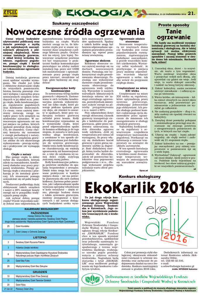 PIĄTEK-NIEDZIELA, 21-23 PAŹDZIERNIKA 2016 Szukamy oszczędności Nowoczesne źródła ogrzewania Coraz więcej budynków użyteczności publicznej oraz domów powstaje z myślą o jak największych oszczędnościach płynących z późniejszej eksploatacji. Nowoczesna instalacja grzewcza, w skład której wchodzą kolektory, regulatory pogodowe, pompa ciepła i kocioł kondensacyjny to ekologiczne i ekonomiczne ogrzewanie budynku. Dzisiaj instalacja grzewcza musi spełniać wysokie wymagania. Nie chodzi już tylko o efektywne dostarczanie ciepła do wszystkich pomieszczeń. Istotną kwestią pozostaje również wydajna i oszczędna praca nowoczesnych urządzeń wchodzących w jej skład m.in. pompy ciepła, kotła kondensacyjnego, regulatorów pogodowych oraz kolektorów słonecznych. Co cieszy, coraz częściej inwestorzy zwracają uwagę na wpływ pracy tych urządzeń na środowisko naturalne. W nowoczesnym ogrzewaniu nie ma już miejsca na paliwa, których spalanie powoduje dużą emisję CO2 do atmosfery. Coraz chętniej korzysta się natomiast z energii pochodzącej z natury, powstają też urządzenia grzewcze zdolne do ich skutecznego wykorzystania – pracują wydajnie i praktycznie nie wymagają obsługi. Ciepło z natury Eko pompy ciepła to dobry wybór dla wszystkich, którym zależy na oszczędności, komfortowej obsłudze oraz pracy przyjaznej środowisku. Pompy pobierają ciepło z otoczenia i przekazują je do instalacji grzewczej. Ich stosowanie pomaga uniezależnić się od paliw kopalnych. Producenci podkreślają dużą efektywność takich urządzeń i nawet o 20% mniejsze koszty energii niż w przypadku tradycyjnych pomp ciepła. Jak wybrać dobrą pompę ciepła? Przede wszystkim należy dobrać moc odpowiednią do zapotrzebowania konkretnego budynku na ciepło. Warto zwrócić uwagę na to, ile kilowatów ciepła jest w stanie wytworzyć dane urządzenie z jednego kilowata prądu. Oczywiście im więcej, tym lepiej. Nowoczesne urządzenie powinno też być wyposażone w praktyczne funkcje komunikacyjne pozwalające na zdalny nadzór instalacji (np. przez sieć GSM) lub monitorowanie i optymalizowanie pracy pompy ciepła przez internet, niezależnie od tego, gdzie będziemy się znajdować Energooszczędne kotły kondensacyjne To nowoczesna wersja kotłów gazowych i olejowych. Zastosowana w nich technika kondensacyjna pozwala wykorzystywać nie tylko ciepło, które powstaje podczas spalania gazu czy oleju, ale również to zawarte w spalinach, które przy tradycyjnej technice grzewczej uchodzi przez komin. Kotły kondensacyjne wyposażone są w wymienniki ciepła, które przed odprowadzeniem spalin do komina schładzają je do tego stopnia, że zawarta w nich para wodna ulega kondensacji, a uwolnione w ten sposób ciepło odprowadzane jest dodatkowo do systemu grzewczego. Dzięki temu kotły kondensacyjne charakteryzują się większą sprawnością niż konwencjonalne, a więc do uzyskania tej samej ilości ciepła zużywają znaczniej mniej paliwa. Kotły kondensacyjne pobierają powietrze niezbędne do spalania bezpośrednio z zewnątrz. Dzięki temu mogą być montowane praktycznie w każdym miejscu domu – nie ma potrzeby planowania dla nich osobnej kotłowni. Zarówno pobór powietrza, jak i odprowadzanie spalin wymusza specjalny wbudowany w kotle wentylator – dzięki temu, planując budowę domu z takim systemem grzewczym, możemy zrezygnować z kosztownych i nie zawsze dodających budynkowi uroku wyso- KALENDARZ EKOLOGICZNY PAŹDZIERNIK miesiąc Dobroci Dla Zwierząt pierwsza sobota i niedziela października: Światowy Dzień Ptaków druga środa października: Międzynarodowy Dzień Ograniczania Klęsk Żywiołowych 25 Dzień Kundelka 25 Dzień Ustawy o Ochronie Zwierząt LISTOPAD 3 Światowy Dzień Rzucania Palenia 3 Hubertus (święto leśników) 6 Międzynarodowy Dzień Zapobiegania Wyzyskowi Środowiska Naturalnego podczas Wojen i Konfliktów Zbrojnych 25 Dzień Bez Futra 28 Międzynarodowy Dzień Bez Zakupów GRUDZIEŃ 10 Międzynarodowy Dzień Praw Zwierząt 11 Międzynarodowy Dzień Terenów Górskich 20 Dzień Ryby 21 lub 22 Pierwszy Dzień Zimy kich murowanych przewodów spalinowych. Spaliny z takich kotłów mogą być bowiem odprowadzane specjalnym przewodem prowadzonym np. wprost przez ścianę zewnętrzną. Ogrzewane słońcem Kolektory słoneczne coraz częściej montuje się na dachach nowoczesnych domów. Pozwalają one wykorzystywać ciepło promieniowania słonecznego. Pozwalają one wykorzystać darmowe ciepło promieniowania słonecznego do ogrzewania wody użytkowej. Wprawdzie w naszych warunkach klimatycznych instalacja solarna nie zastąpi centralnego ogrzewania, pozwoli jednak zmniejszyć zużycie energii na potrzeby przygotowywania c.w.u. nawet o 60%. Przy odpowiedniej ilości energii słonecznej czynnik grzewczy transportuje ciepło z kolektorów do podgrzewacza, gdzie przez wężownicę umieszczoną na dole zbiornika ogrzewa wodę użytkową. Jeśli jej temperatura jest niższa od wymaganej, do pracy włączy się dodatkowo kocioł grzewczy i przez górną wężownicę szybko ją dogrzeje. Ilość dodatkowej energii, którą trzeba będzie doprowadzić do zbiornika, zależy od powierzchni kolektorów oraz pojemności podgrzewacza c.w.u., dlatego wykonanie projektu instalacji warto zlecić projektantowi. Ogrzewanie zdalnie sterowane Sterowanie temperaturą we wnętrzach domu czy budynku jest coraz popularniejszym rozwiązaniem, zapewniającym dodatkowe oszczędności, a przede wszystkim komfort użytkowania. Wystarczy sobie wyobrazić, że przebywając w miejscu pracy możemy odpowiednio wcześnie włączyć ogrzewanie u siebie, tak aby wrócić do przyjemnie ciepłego domu. Urządzeniami na miarę XXI wieku Urządzeniami na miarę XXI wieku są regulatory, które optymalizują pracę systemu grzewczego, zwiększając jednocześnie jego efektywność. Ich prosta obsługa podnosi komfort codziennego życia domowników przez
