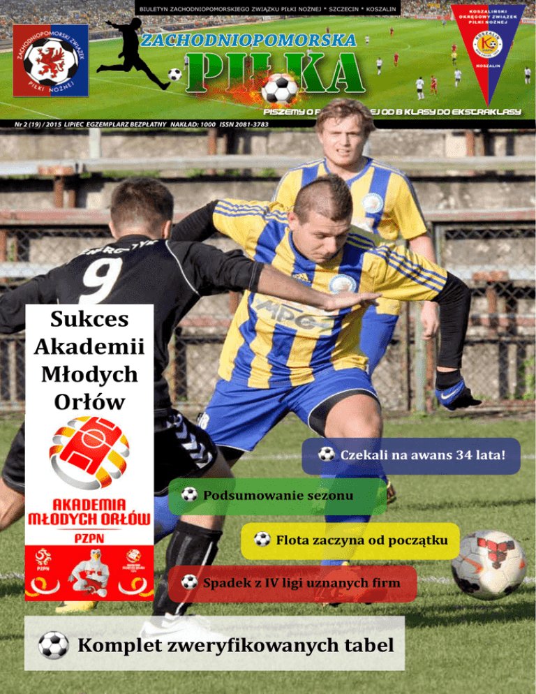 BIULETYN ZACHODNIOPOMORSKIEGO ZWIĄZKU PIŁKI NOŻNEJ * SZCZECIN * KOSZALIN Fot. Google.pl ZACHODNIOPOMORSKA Piszemy o piłce nożnej od b-klasy do ekstraklasy Nr 2 (19) / 2015 LIPIEC EGZEMPLARZ BEZPŁATNY NAKŁAD: 1000 ISSN 2081-3783 Sukces Akademii Młodych Orłów Czekali na awans 34 lata! Podsumowanie sezonu Flota zaczyna od początku Spadek z IV ligi uznanych firm Komplet zweryfikowanych tabel Zachodniopomorski Związek Piłki Nożnej w… Faktach i liczbach Zakres działania Zachodniopomorskiego Związku Piłki Nożnej jest bardzo szeroki. Podstawowe zadanie to organizacja piłkarskich rozgrywek, w których regularnie uczestniczy około 19 tysięcy zawodników. To jednak tylko jeden z bardzo wielu elementów, którymi zajmuje się związek. W sezonie 2014/2015 w ZZPN (w tym KOZPN) rozgrywki prowadzone były w 75 klasach rozgrywkowych (senior, junior, trampkarz, młodzik) oraz rozgrywki turniejowe dla 274 drużyn w kat. orlik i żak. W sezonie 2014/2015 WGiE uprawnił do gry 19 tysięcy zawodników w systemie extranet. Obecnie w systemie extranet w ZZPN zarejestrowanych jest około 46 tysięcy zawodników. Związek przeprowadza regularne kursy trenerskie podczas których wiedzę i uprawnienia zdobywają szkoleniowcy z całego województwa. W ostatnim czasie ZZPN przeprowadził 11 kursów, które ukończyło 274 trenerów. Zdobyli oni dyplomy UEFA C lub UEFA B. ZZPN prowadzi sześć reprezentacji młodzieżowych (4 chłopców i 2 dziewcząt), które biorą udział w eliminacjach i turniejach o mistrzostwo Polski w różnych kategoriach wiekowych przy Twardowskiego stawia się na młodzież. Pod patronatem ZZPN funkcjonują dwie szkoły gimnazjalne w Szczecinie i w Koszalinie. Uczęszcza do nich w sumie ponad 180 uczniów uprawiających w klasach sportowych piłkę nożną. Zatrudnieni przez ZZPN szkoleniowcy prowadzą tygodniowo z każdą klasą po 12 godzin lekcyjnych zajęć piłkarskich. Kolegium sędziów ZZPN prowadzi regu- larne szkolenia sędziów. W ostatnich dwóch latach związek wyszkolił ponad 100 nowych arbitrów. Związek przeprowadza corocznie bezpłatne kursy dla kierowników ds. bezpieczeństwa, spikerów i służb informacyjnych (stewardów) klubów niższych klas rozgrywkowych. W ostatnich latach przeszkolonych zostało ponad 200 osób, które otrzymały wspomniane uprawnienia. ZZPN jest pomysłodawcą i realizatorem projektu pod nazwą “Zachodniopomorski program szkolenia młodzieży piłkarskiej i rozwoju infrastruktury piłkarskiej euroboiska”. W ramach tej inicjatywy w dziesięciu gminach powstały pełnowymiarowe boiska piłkarskie ze sztuczną nawierzchnią z infrastrukturą w postaci szatni z pełnym kompleksem sanitarnym i sztucznym oświetleniem. Budowa tych obiektów została dofinansowana ze środków z Unii Europejskiej, o które skutecznie zabiegał związek. ZZPN od lat współpracuje z naszymi zachodnimi sąsiadami z Meklemburgii Pomorza Przedniego. Polega ona między innymi na udziale naszych szkoleniowców i arbitrów w szkoleniach organizowanych przez Niemców (i vice versa), wymianie sędziowskiej, rozgrywaniu spotkań sparingowych z udziałem naszych reprezentacji młodzieżowych oraz w organizacji przygranicznych turniejów piłkarskich juniorów oraz senio- rów (Pomerania Cup). Cyklicznie nasze i niemieckie zespoły dziecięce biorą też udział w młodzieżowych turniejach piłkarskich organizowanych po obu stronach granicy. ZZPN jest także inicjatorem powstania przy Urzędzie Marszałkowskim funduszu programu dofinansowania małej infrastruktury sportowej. Dzięki temu przeprowadzonych zostało wiele remontów i modernizacji boisk na kwotę przekraczającą milion złotych. Związek przeprowadził weryfikacje kilkuset boisk w województwie i corocznie przyznaje klubom licencję na grę w poszczególnych klasach rozgrywkowych. ZZPN zorganizował także wiele międzynarodowych imprez piłkarskich. Były wśród nich między innymi turniej do lat 16 UEFA development, mecz Polska - Włochy do lat 20, mecz Polska - Niemcy do lat 20 (oba w ramach Turnieju Czterech Narodów), dwumecz Polska - Rosja w futsalu, dwumecz Polska - Irlandia Płn. do lat 16, turniej eliminacji ME kobiet do lat 17. W województwie zachodniopomorskim odbyły się także finały wojewódzkie turnieju z podwórka na stadion o puchar Tymbarku. Dwukrotnie w Policach zorganizowaliśmy finałowe turnieje turnieju o Puchar Kazimierza Górskiego mające rangę mistrzostw Polski do lat 15. Dwumecz Polska - Rosja zorganizowany w lutym przez Zachodniopomorski Związek Piłki Nożnej okazał się organizacyjnym sukcesem. Niestety, pod względem sportowym wypadliśmy bardzo słabo. Oba mecze rozgrywane w Szczecinie i Stargardzie zakończyły się porażkami biało-czerwonych w stosunku 0:6. Jednym smutek, drugim radość Słowo prezesa Nie ma co ukrywać. To była dla nas trudna piłkarska wiosna. Kłopoty Floty Świnoujście spędzały wielu nam sen z powiek. Zawirowania wokół naszego pierwszoligowca trwały stanowczo za długo. Fatalnie, że Flota nie dotrwała do końca rozgrywek. Nie ma jednak tego złego co by na dobre nie wyszło. Jestem przekonany, że w Świnoujściu szybko doczekamy się poważnej piłki, a przede wszystkim prawidłowego szkolenia dzieci i młodzieży. Wszyscy w związku kibicujemy nowej Flocie. MKS zaczyna od klasy A, ale w kolejnych latach świnoujścianie powinni piąć się w górę ligowej hierarchii. Myślę, że nowym działaczom, na czele z Panem Prezesem Leszkiem Zakrzewskim można zaufać. Mam nadzieję, że nowa Flota szybko nadrobi utracony dystans. Jednym smutek, drugim radość. To co zafundowali nam Błękitni Stargard w rozgrywkach Pucharu Polski przez wiele lat z ogromnym sentymentem będzie wspominane nie tylko przez kibiców w Stargardzie. Działacze z trenerem Krzysztof Kapuś- Sonda • cińskim udowodnili, że można zbudować bardzo dobry zespół w oparciu o wychowanków i piłkarzy z naszego regionu. Do pełni szczęścia zabr