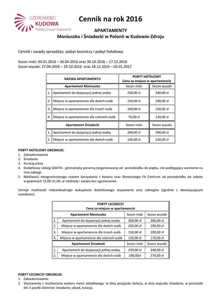 Cennik na rok 2016 APARTAMENTY Moniuszko i Śniadecki w Polonii w Kudowie-Zdroju Cennik i zasady sprzedaży: pobyt leczniczy i pobyt hotelowy Sezon niski: 04.01.2016 – 26.04.2016 oraz 30.10.2016 – 17.12.2016 Sezon wysoki: 27.04.2016 – 29.10.2016 oraz 18.12.2016 – 03.01.2017 NAZWA APARTAMENTU Apartament Moniuszko POBYT HOTELOWY Cena za miejsce w apartamencie Sezon niski Sezon wysoki 1. Apartament do dyspozycji jednej osoby 250,00 zł 340,00 zł 2. Miejsce w apartamencie dla dwóch osób 150,00 zł 240,00 zł 3. Miejsce w apartamencie dla trzech osób 100,00 zł 150,00 zł 4. Miejsce w apartamencie dla czterech osób 70,00 zł 120,00 zł Apartament Śniadecki Sezon niski Sezon wysoki 1. Apartament do dyspozycji jednej osoby 200,00 zł 290,00 zł 2. Miejsce w apartamencie dla dwóch osób 140,00 zł 220,00 zł POBYT HOTELOWY OBEJMUJE: 1. Zakwaterowanie 2. Śniadanie 3. Kurację pitną 4. Dodatkowy zabieg GRATIS - gimnastykę poranną (organizowaną od poniedziałku do piątku, nie podlegający wymianie na inny zabieg). 5. Możliwość nieograniczonego czasem korzystania z basenu oraz Słonecznego Fit Centrum od poniedziałku do soboty w godzinach 15.00-21.00, w niedzielę i święta bez ograniczenia. Istnieje możliwość indywidualnego wykupienia dodatkowego wyżywienia oraz zabiegów (zgodnie z obowiązującym cennikiem). POBYT LECZNICZY Cena za miejsce w apartamencie Apartament Moniuszko Sezon niski Sezon wysoki 1. 2. Apartament do dyspozycji jednej osoby Miejsce w apartamencie dla dwóch osób 300,00 zł 200,00 zł 390,00 zł 290,00 zł 3. Miejsce w apartamencie dla trzech osób 150,00 zł 200,00 zł 4. Miejsce w apartamencie dla czterech osób 120,00 zł 170,00 zł Apartament Śniadecki Sezon niski Sezon wysoki 1. Apartament do dyspozycji jednej osoby 250,00 zł 340,00 zł 2. Miejsce w apartamencie dla dwóch osób 190,00zł 270,00 zł POBYT LECZNICZY OBEJMUJE: 1. Zakwaterowanie. 2. Wyżywienie z możliwością wyboru menu obiadowego: w dniu przyjazdu kolacja, w dniu wyjazdu śniadanie, w pozostałe dni 3 posiłki dziennie: śniadanie, obiad, kolacja. 3. Opiekę lekarską i pielęgniarską. 4. Trzy zabiegi dziennie zgodnie z ordynacją lekarza - od poniedziałku do soboty z wyłączeniem świąt. 5. Dodatkowy zabieg GRATIS - gimnastykę poranną (organizowaną od poniedziałku do piątku, nie podlegający wymianie na inny zabieg). 6. Kurację pitną 7. Możliwość nieograniczonego czasem korzystania z basenu oraz Słonecznego Fit Centrum od poniedziałku do soboty w godzinach 15.00-21.00, w niedzielę i święta bez ograniczenia. OPIS APARTAMENTÓW: 1. Apartament Moniuszko – max 4 osobowy z osobnym wejściem, powierzchnia 51 m 2, sypialnia z łóżkiem małżeńskim, pokój dzienny z kanapą rozkładaną, aneks kuchenny, łazienka, telefon, TV, sejf, dostęp do internetu, istnieje możliwość przyjęcia zwierząt. 2. Apartament Śniadecki – max 2 osobowy z osobnym wejściem, powierzchnia 30 m 2, pokój dzienny z kanapą rozkładaną, aneks kuchenny, łazienka, telefon, TV, sejf, dostęp do internetu, istnieje możliwość przyjęcia zwierząt. ZASADY SPRZEDAŻY: 1. Ceny nie zawierają opłaty klimatycznej. 2. Doba hotelowa 15.00 – 11.00. 3. POBYT LECZNICZY I UZDROWISKOWY z dwoma zabiegami/ dzień – cena pobytu za osobodzień ulega obniżeniu 12 zł. 4. POBYT LECZNICZY I UZDROWISKOWY z czterema zabiegami/ dzień – cena pobytu za osobodzień – dopłata 12 zł. 5. Rabaty dzieci Noclegi: dzieci do lat 3 - gratis - pobyt hotelowy bez dodatkowego łóżka, nie dotyczy wyżywienia, dzieci do lat 12 - 50 % ceny noclegu. Wyżywienie: dzieci do lat 12 - 50 % . 6. Rabaty dorośli: pobyt trwający od 14 do 20 osobodni - 5% wartości pobytu, pobyt trwający ≥ 21 osobodni - 10% wartości pobytu.
