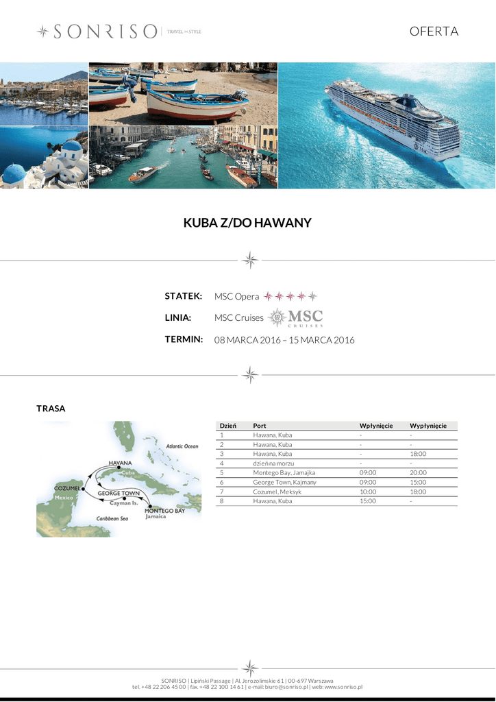 OFERTA KUBA Z/DO HAWANY STATEK: MSC Opera LINIA: MSC Cruises TERMIN: 08 MARCA 2016 – 15 MARCA 2016 TRASA Dzień 1 2 3 4 5 6 7 8 Port Hawana, Kuba Hawana, Kuba Hawana, Kuba dzień na morzu Montego Bay, Jamajka George Town, Kajmany Cozumel, Meksyk Hawana, Kuba Wpłynięcie 09:00 09:00 10:00 15:00 SONRISO | Lipiński Passage | Al. Jero zo limskie 61 | 00-697 Warszawa tel. +48 22 206 45 00 | fax. +48 22 100 14 61 | e-mail: biuro @so nriso .pl | web: www.so nriso .pl Wypłynięcie 18:00 20:00 15:00 18:00 - OFERTA CENA Typ kabiny Cena z osobę Kabina wewnętrzna od 469 EUR Kabina z oknem od 609 EUR Kabina z balkonem od 899 EUR Apartament z balkonem od 1 679 EUR CENA ZAWIERA DOTATKOWE OPŁATY zakwaterowanie w 2 - os. kabinie wybranej kategorii pełne wyżywienie: 3 posiłki, przekąski między posiłakmi, bufet o północy napoje: woda stołowa, kawa, herbata oraz sok do śniadania dostępne 24 h w restauracji bufetowej oraz w restauracji głównej wyłącznie podczas śniadań serwis bagażowy podczas wejścia i zejścia ze statku 24 godzinny serwis kabinowy korzystanie z urządzeń sportowo - rekreacyjnych dostępnych na pokładzie (baseny, jacuzzi, boiska sportowe, kluby dla dzieci i młodzieży itp.) udział we wszystkich imprezach organizowanych na pokładzie (przedstawienia, pokazy, aukcje, animacje i inne) dojazd/przelot do portu rozpoczęcia i zakończenia rejsu transfery (lotnisko - port - lotnisko) ewentualne noclegi przed lub po rejsie wycieczki fakultatywne napoje: bezalkoholowe, alkoholowe, woda mineralna dostępne w restauracjach i barach (istnieje możliwość wykupienia pakietów napojów, o szczegóły zapytaj w biurze) korzystanie z mini baru w kabinie korzystanie z usług typu: SPA, salon piękności, pralnia itp. wydatki osobiste tj. zakupy w butikach, internet, kasyno itp. obowiązkowe opłaty portowe obowiązkowa opłata serwisowa (napiwki dla obsługi statku ok.8,5 EUR/os. dorosła/dzień, dzieci poniżej 3 lat nie płacą) obowiązkowe ubezpieczenie turystyczne koszt wymaganych wiz ewentualna opłata paliwowa (linia w momencie wzrotu cen ropy zastrzega sobie prawo do dodania oplaty paliwowej do każdej rezerwacji) Na życzenie świadczymy dodatkowo usługi: rezerwacje hotelowe na całym świecie rezerwacje biletów lotniczych, trasferów oraz parkingu w porcie rezerwacje wycieczek fakultatywnych i innych atrakcji SONRISO | Lipiński Passage | Al. Jero zo limskie 61 | 00-697 Warszawa tel. +48 22 206 45 00 | fax. +48 22 100 14 61 | e-mail: biuro @so nriso .pl | web: www.so nriso .pl