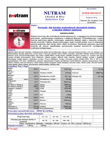 klasa produktu NUTRAM SUPER PREMIUM Chicken & Rice Producent / Kraj Selective Cat Nutram Pet Products Ltd. KANADA Opis: Formuła dla bardzo wybrednych dorosłych kotów, o bardzo słabym apetycie KURCZAK Z RYŻEM Pokarm stworzony dla wybrednych kocich mięsożerców, wymagających zrównoważonego pożywienia , pozbawionego wypełniaczy i zbędnych tłuszczów. Wyprodukowany z mięsa kurcząt najwyższej jakości, zawierający smakowity dodatek mięsa z tuńczyka, kraba, łososia, krewetek i indyka. Bardzo interesujący smak i kształt granul, wraz ze znakomitą jakością pokarmu, daje bardzo dobre efekty żywieniowe. Stosowanie pokarmu zapewnia kontrolę ph moczu, zapobiegając powstawaniu kamieni moczowych (wystąpieniu syndromu urologicznego). Skład: mielone mięso kurcząt (mączka), selekcjonowane pełne ziarno kukurydzy, tłuszcz z kurcząt (konserwowany z wit. E), mielony ryż, kukurydziana mączka glutenowa, świeże mięso z kurcząt, mielone mięso śledzia (mączka), naturalne dodatki smakowe(kurczak, tuńczyk, krab, łosoś,krewetka,indyk), olej rybny (źródło DHA), siemię lniane, włóknik grochowy, suszony ser, suszone całe jaja, suszone drożdże browarniane, kwas fosforowy, chlorek potasu, chlorek sodu, tauryna, chlorek choliny, wyciąg z nagietka lekarskiego (żródło luteiny), metionina, wyciąg z Yucca schidigera, wyciąg z korzenia cykorii (źródło FOS), Wit. A, D3, E, K (menadionina), Wit. B12, ryboflawina, niacyna, d-pantotenian wapnia, pirydoksyna (hydrochlorek), tiamina (monoazotan), kwas foliowy, biotyna, siarczan żelazawy, chelat żelaza, tlenek manganu, chelat manganu, siarczan cynku, chelat cynku, siarczan miedzi, chelat miedzi, jodan wapnia, beta-karoten, chelat kobaltu, selenian sodu Analiza /na 1 kg/: Białko (min) Tłuszcz (min) Błonnik (max) Popiół (max) Wilgotność (max) Kw.tłuszcz. Omega 6 Kw.tłuszcz. Omega 3 Omega 6 : Omega 3 Wapń (min) Fosfor (min) Sód (min) Potas (min) Magnez (min) Witamina A Witamina D 3 30,8 % Witamina E 0,167 mg Kwas foliowy 20,4 % Tiamina (wit.B1) 12,9 mg Tauryna 1,59 % Ryboflawina (wit.B2) 10,7 mg Witamin K3 5,3 % Pirydoksyna ( wit.B6 ) 8,5 % Witamina B12 8,9 mg 156,0 mcg 3,6 % Żelazo 0,60 % Miedź 5,67 Cynk 209,0 mg 21,5 mg 167,0 mg 1,29 % Mangan 34,0 mg 1,18 % Jod 2,5mg 0,40 % Selen 0,20 mg 0,52 % Biotyna 314,0 mcg 0,10 % Niacyna 70,0 mg 13,8 mg Cholina 1,4 mg Kwas pantotenowy 2465,0 mg 21,8 mg Energia metaboliczna: 3890 Kcal/Kg. Orientacyjna dawka dzienna: Waga kota (kg) 2,3 - 4,5 4,5 - 6,8 6,8 - 9,0 Orientacyjna dzienna dawka w 50 - 95 95 - 140 140 - 185 gramach Jedna standardowa filiżanka / szklanka / 250 ml / zawiera ok. 120 g karmy / 428 Kcal /. Opakowanie 1,50 kg 3,00 kg Uwagi: 1,6 mg 1288,0 mg 1,8 mg zaleca się udostępniać karmę kotu przez całą dobę; zwiększenie lub zmniejszenie dawki dziennej pokarmu powinno zależeć od wielkości zwierzęcia , jego aktywności , wieku i kondycji; należy zapewnić kotu stały dostęp do świeżej wody; nie należy podawać dodatkowo żadnych preparatów witaminowych i mineralnych; produkt przechowywać w suchym i chłodnym miejscu.