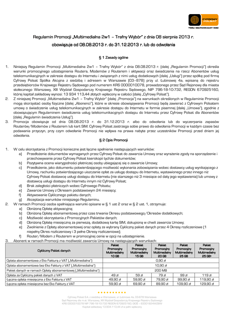 Regulamin Promocji „Multimedialna „Multimedialna 2w1 – Trafny Wybór” Wybór” z dnia 08 sierpnia 2013 r. obowiązuje od 08.08.2013 08.08.2013 r. do 31.12.2013 31.12.2013 r. lub do odwołania § 1 Zasady ogólne 1. 2. 3. 1. 2. 3. Niniejszy Regulamin Promocji „Multimedialna 2w1 – Trafny Wybór” z dnia 08.08.2013 r. (dalej „Regulamin Promocji”) określa warunki promocyjnego udostępnienia Routera, Modemów z Routerem i aktywacji oraz świadczenia na rzecz Abonentów usług telekomunikacyjnych w zakresie dostępu do Internetu i związanych z nimi usług dodatkowych (dalej „Usługi”) przez spółkę pod firmą Cyfrowy Polsat Spółka Akcyjna z siedzibą i adresem w Warszawie (03–878) przy ul. Łubinowej 4a, wpisaną do rejestru przedsiębiorców Krajowego Rejestru Sądowego pod numerem KRS 0000010078, prowadzonego przez Sąd Rejonowy dla miasta stołecznego Warszawy, XIII Wydział Gospodarczy Krajowego Rejestru Sądowego, NIP 796-18-10-732, REGON 670925160, której kapitał zakładowy wynosi: 13 934 113,44 złotych wpłacony w całości (dalej „Cyfrowy Polsat”). Z niniejszej Promocji „Multimedialna 2w1 – Trafny Wybór” (dalej „Promocja”) na warunkach określonych w Regulaminie Promocji mogą skorzystać osoby fizyczne (dalej „Abonenci”), które w okresie obowiązywania Promocji będą zawierać z Cyfrowym Polsatem umowy o świadczenie usług telekomunikacyjnych w zakresie dostępu do Internetu w formie pisemnej (dalej „Umowa”), zgodnie z obowiązującym Regulaminem świadczenia usług telekomunikacyjnych dostępu do Internetu przez Cyfrowy Polsat dla Abonentów (dalej „Regulamin świadczenia Usług”). Promocja obowiązuje od dnia 08.08.2013 r. do 31.12.2013 r. albo do odwołania lub do wyczerpania zapasów Routerów/Modemów z Routerem lub kart SIM. Cyfrowy Polsat zastrzega sobie prawo do odwołania Promocji w każdym czasie bez podawania przyczyn, przy czym odwołanie Promocji nie wpływa na prawa nabyte przez uczestników Promocji przed dniem jej odwołania. § 2 Opis Promocji W celu skorzystania z Promocji konieczne jest łączne spełnienie następujących warunków: a) Przedłożenie dokumentów wymaganych przez Cyfrowy Polsat do zawarcia Umowy oraz wyrażenie zgody na sporządzenie i przechowywanie przez Cyfrowy Polsat kserokopii tychże dokumentów; b) Pozytywna ocena wiarygodności płatniczej osoby ubiegającej się o zawarcie Umowy; c) Przedłożenie, jako dokumentu potwierdzającego możliwość wykonania zobowiązania wobec dostawcy usług wynikającego z Umowy, rachunku potwierdzającego uiszczanie opłat za usługę dostępu do Internetu, wystawionego przez innego niż Cyfrowy Polsat dostawcę usługi dostępu do Internetu (nie starszego niż 3 miesiące od daty jego wystawienia) lub umowy z dostawcą usługi dostępu do Internetu innym niż Cyfrowy Polsat; d) Brak zaległości płatniczych wobec Cyfrowego Polsatu; e) Zawarcie Umowy z Okresem podstawowym 24 miesięcy; f) Aktywowanie Cyklicznego pakietu danych; g) Akceptacja warunków niniejszego Regulaminu. W ramach Promocji osoba spełniająca warunki opisane w § 1 ust 2 oraz w § 2 ust. 1, otrzymuje: a) Obniżoną Opłatę aktywacyjną; b) Obniżoną Opłatę abonamentową przez czas trwania Okresu podstawowego/Okresów dodatkowych; c) Możliwość skorzystania z Promocyjnych Pakietów danych; d) Obniżoną Opłatę miesięczną za pierwszą, dodatkową kartę SIM, dokupioną w chwili zawarcia Umowy; e) Zwolnienie z Opłaty abonamentowej oraz opłaty za wybrany Cykliczny pakiet danych przez 4 Okresy rozliczeniowe (1 niepełny Okres rozliczeniowy i 3 pełne Okresy rozliczeniowe); f) Router/Modem z Routerem w promocyjnej cenie w opcji na udostępnienie. Abonent w ramach Promocji ma możliwość zawarcia Umowy na następujących warunkach: Cykliczny Pakiet danych Oplata abonamentowa z Eko Fakturą z VAT („Multimedialna”) Oplata abonamentowa bez Eko Faktury z VAT („Multimedialna”) Pakiet danych w ramach Opłaty abonamentowej („Multimedialna”) Opłata za Cykliczny pakiet danych z VAT Łączna opłata miesięczna z Eko Fakturą z VAT Łączna opłata miesięczna bez Eko Faktury z VAT Pakiet Promocyjny Multimedialny 10 GB 49 zł 49,90 zł 59,90 zł Pakiet Pakiet Promocyjny Multimedialny 15 GB Pakiet Promocyjny Multimedialny 20 GB Pakiet Promocyjny Multimedialny 25 GB Pakiet Promocyjny Multimedialny 25 GB 59 zł 59,90 zł 69,90 zł 0,90 zł 10,90 zł 200 MB 79 zł 79,90 zł 89,90 zł 99 zł 99,90 zł 109,90 zł 119 zł 119,90 zł 129,90 zł Cyfrowy Polsat S.A. z siedzibą w Warszawie, ul. Łubinowa 4a, 03-878 Warszawa Sąd Rejonowy dla m.st. Warszawy, XIII Wydział Gospodarczy Krajowego Rejestru Sądowego KRS 0000010078 NIP 796-18-10-732 REGON 670925160, GIOŚ – E0001824WZBW Kapitał zakładowy 13.934.113,44 zł w pełni wpłacony 6) Opłata miesięczna za pierwszą, dodatkową kartę SIM Opłata aktywacyjna z VAT Opłata aktywacyjna za dodatkową kartę SIM Cena za SMS wysłany z modemu (z VAT) Pakiet danych do wykorzystania miesięcznie w godzinach 07:00:00-01:00:00 Cena 1 MB z VAT w godzinach 07:00:00-01:00:00 po wykorzystaniu pakietów danych Cena za 1 GB z VAT w godzinach 01:00:01-06:59:59 po wykorzystaniu pakietów danych 0 zł 49 zł 19 zł 0,20 zł 1) 10 GB 15 GB 20 GB 25 GB 25 GB 0,02 zł 1 zł Kategorie ruchu bez limitu / dodatkowy limit wysłanych i odebranych danych do wykorzystania na określone kategorie ruchu. nie wliczane do limitu pakietu danych. 2) Halo, www.cyfrowypolsat.pl Bez limitu 2) Serwisy społecznościowe Bez limitu 2) Przeglądanie stron www - Bez limitu 2) ipla, HBO GO 3 GB3) 5 GB4) Bez limitu2) Wideo Darmowe Noce BEZPŁATNIE Brak Opłaty miesięcznej za pierwszą, dodatkową kartę SIM dotyczy tylko karty dodatkowej, aktywowanej w chwili zawarcia Umowy. „Bez limitu” nie obejmuje niektórych treści i kategorii danych, wskazanych w §3 niniejszego Regulaminu promocji. Dodatkowy limit wysłanych i odebranych danych do wykorzystania na og