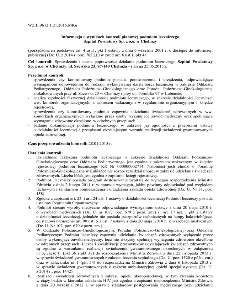 WZ.II.9612.1.21.2015.MKu Informacja o wynikach kontroli planowej podmiotu leczniczego Szpital Powiatowy Sp. z o.o. w Chełmży sporządzona na podstawie art. 4 ust.1, pkt 1 ustawy z dnia 6 września 2001 r. o dostępie do informacji publicznej (Dz. U. z 2014 r. poz. 782 j.t.) w zw. z art. 6 ust.1, pkt 4a. Cel kontroli: Sprawdzenie i ocena poprawności działania podmiotu leczniczego Szpital Powiatowy Sp. z o.o. w Chełmży, ul. Szewska 23, 87-140 Chełmża - stan na 25.05.2015 r. Przedmiot kontroli: - sprawdzenie czy kontrolowany podmiot posiada pomieszczenia i urządzenia, odpowiadające wymaganiom odpowiednim do rodzaju wykonywanej działalności leczniczej w zakresie Oddziału Pediatrycznego, Oddziału Położniczo-Ginekologicznego oraz Poradni Położniczo-Ginekologicznej zlokalizowanych przy ul. Szewska 23 w Chełmży i przy ul. Toruńska 97 w Łubiance, - analiza zgodności faktycznej działalności podmiotu leczniczego, w zakresie działalności leczniczej ww. komórek organizacyjnych, z zakresem wskazanym w regulaminie organizacyjnym i księdze rejestrowej, - sprawdzenie czy kontrolowany podmiot zapewnia udzielanie świadczeń zdrowotnych w ww. komórkach organizacyjnych wyłącznie przez osoby wykonujące zawód medyczny oraz spełniające wymagania zdrowotne określone w odrębnych przepisach, - badanie dokumentacji podmiotu leczniczego w zakresie jej zgodności z przepisami ustawy o działalności leczniczej i przepisami określającymi warunki realizacji świadczeń gwarantowanych opieki zdrowotnej. Czas przeprowadzenia kontroli: 28.01.2015 r. Ustalenia kontroli: 1. Działalność faktyczna podmiotu leczniczego w zakresie działalności Oddziału PołożniczoGinekologicznego oraz Oddziału Pediatrycznego jest zgodna z zakresem wskazanym w księdze rejestrowej podmiotu leczniczego KR Nr 000000002714. Natomiast jeśli chodzi o Poradnię Położniczo-Ginekologiczną w Łubiance nie rozpoczęła działalności w zakresie udzielania świadczeń zdrowotnych. Liczba łóżek jest zgodna z zapisami księgi rejestrowej. 2. Podmiot leczniczy posiada program dostosowania Szpitala do wymagań rozporządzenia Ministra Zdrowia z dnia 2 lutego 2011 r. w sprawie wymagań, jakim powinny odpowiadać pod względem fachowym i sanitarnym pomieszczenia i urządzenia zakładu opieki zdrowotnej (Dz. U. Nr 31, poz. 158). 3. Zgodne z zapisami art. 23 i art. 24 ust. 1 ustawy o działalności leczniczej Podmiot leczniczy posiada ustalony Regulamin Organizacyjny. 4. Podmiot stosuje wyroby medyczne odpowiadające wymaganiom ustawy z dnia 20 maja 2010 r. o wyrobach medycznych (Dz. U. nr 107, poz. 679 z późn. zm.) - art. 17 ust. 1 pkt 2 ustawy o działalności leczniczej, jednakże nie posiada paszportów technicznych na lampy bakteriobójcze, co stanowi naruszenie art. 90 ust. 6 i ust. 7 ustawy z dnia 20 maja 2010 r. o wyrobach medycznych (Dz. U. Nr 107, poz. 679 z poźn. zm.). 5. W Oddziale Położniczo-Ginekologicznym, Poradni Położniczo-Ginekologicznej oraz Oddziale Pediatrycznym Podmiot leczniczy zapewnia udzielanie świadczeń zdrowotnych wyłącznie przez osoby wykonujące zawód medyczny, lecz nie wszyscy spełniają wymagania zdrowotne określone w odrębnych przepisach. Liczba i kwalifikacje pracowników udzielających świadczeń zdrowotnych są zgodne z warunkami realizacji świadczenia gwarantowanego określonych w załączniku nr 3, część I (pkt 36 i pkt 37) do rozporządzenia Ministra Zdrowia z dnia 22 listopada 2013 r. w sprawie świadczeń gwarantowanych z zakresu leczenia szpitalnego (Dz. U. poz. 1520 z późn. zm.) oraz w załączniku nr 1 (pkt 34) do rozporządzenia Ministra Zdrowia z dnia 6 listopada 2013 r. w sprawie świadczeń gwarantowanych z zakresu ambulatoryjnej opieki specjalistycznej (Dz. U. z 2014 r., poz. 1442). 6. Realizacji świadczeń zdrowotnych z zakresu opieki okołoporodowej, w tym zlecania kobietom w ciąży badań w kierunku zakażenia HIV jest zgodna z zapisami rozporządzenia Ministra Zdrowia z dnia 20 września 2012 r. w sprawie standardów postępowania medycznego przy udzielaniu świadczeń zdrowotnych z zakresu opieki okołoporodowej sprawowanej nad kobietą w okresie fizjologicznej ciąży, fizjologicznego porodu, połogu oraz opieki nad noworodkiem (Dz. U. poz. 1100). Wskaźnik cięć cesarskich (32,1%) adekwatny dla szpitala rejonowego. Prowadzenie dokumentacji medycznej bez zastrzeżeń. Ocena działalności podmiotu kontrolowanego, uwagi i wnioski: Wydział Zdrowia – Kujawsko-Pomorskie Centrum Zdrowia Publicznego Kujawsko – Pomorskiego Urzędu Wojewódzkiego w Bydgoszczy kontrolowaną działalność ocenia pozytywnie z nieprawidłowościami. Wnioski dotyczące doskonalenia: Należy podjąć następujące działania w celu wyeliminowania stwierdzonych w wyniku kontroli nieprawidłowości, a w szczególności: 1. Złożyć do organu prowadzącego rejestr podmiotów wykonujących działalność leczniczą wniosek o dokonanie zmian w rejestrze dotyczący aktualizacji zakończenia działalności przez komórkę organizacyjną Poradnię Położniczo-Ginekologiczną w Łubiance. 2. Po zakończeniu wdrażania programu dostosowań przekazać do Wydziału Zdrowia KujawskoPomorskie Centrum Zdrowia Publicznego aktualną decyzję z Państwowego Wojewódzkiego Inspektora Sanitarnego w Bydgoszczy dotyczącą spełnienia wymogów fachowych i sanitarnych pomieszczeń i urządzeń na Oddziale Pediatrycznym i Oddziale Położniczo-Ginekologicznym. 3. Założyć paszporty techniczne dla lamp bakteriobójczych, w których odnotowywane będą przeglądy techniczne, ewentualne naprawy i terminy następnego badania technicznego. 4. Zapewnić udzielanie świadczeń zdrowotnych przez pracowników medycznych posiadających aktualne orzeczenia lekarskie, potwierdzające spełnianie wymagań zdrowotnych do wykonywania pracy na określonym stanowisku. Kontrolujący: Zatwierdziła: z up. Wojewody Dyrektor Wydziału