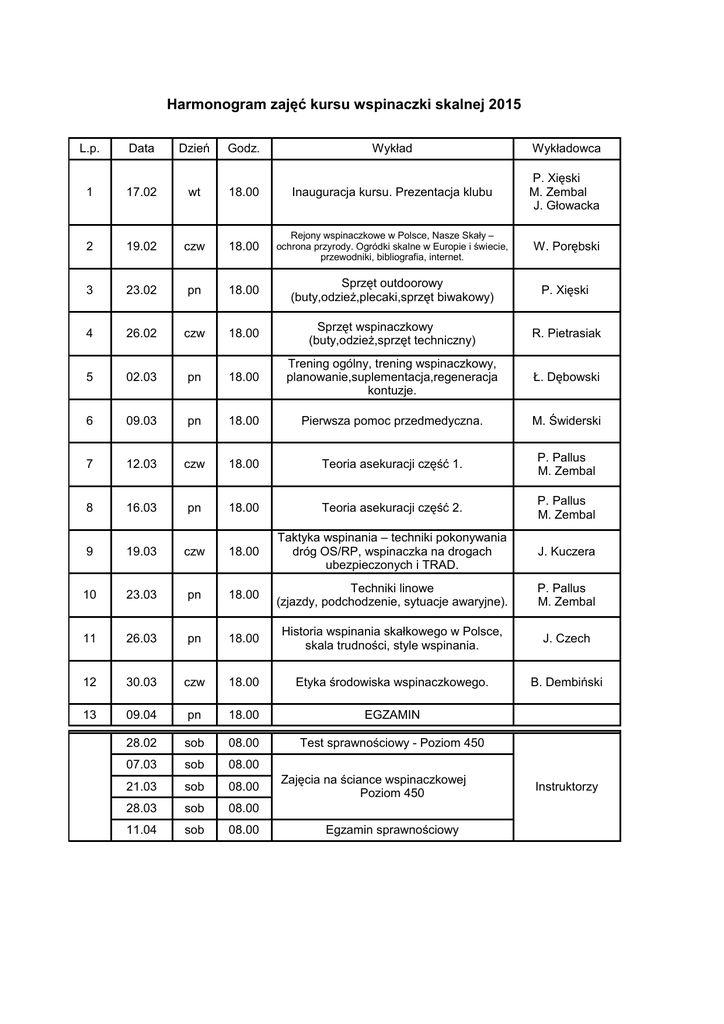 Harmonogram zajęć kursu wspinaczki skalnej 2015