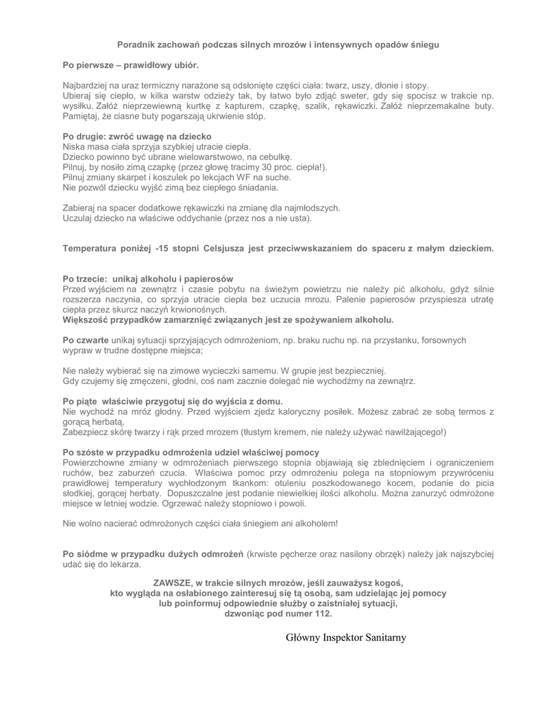 Poradnik zachowań podczas silnych mrozów i intensywnych opadów śniegu Po pierwsze – prawidłowy ubiór. Najbardziej na uraz termiczny narażone są odsłonięte części ciała: twarz, uszy, dłonie i stopy. Ubieraj się ciepło, w kilka warstw odzieży tak, by łatwo było zdjąć sweter, gdy się spocisz w trakcie np. wysiłku. Załóż nieprzewiewną kurtkę z kapturem, czapkę, szalik, rękawiczki. Załóż nieprzemakalne buty. Pamiętaj, że ciasne buty pogarszają ukrwienie stóp. Po drugie: zwróć uwagę na dziecko Niska masa ciała sprzyja szybkiej utracie ciepła. Dziecko powinno być ubrane wielowarstwowo, na cebulkę. Pilnuj, by nosiło zimą czapkę (przez głowę tracimy 30 proc. ciepła!). Pilnuj zmiany skarpet i koszulek po lekcjach WF na suche. Nie pozwól dziecku wyjść zimą bez ciepłego śniadania. Zabieraj na spacer dodatkowe rękawiczki na zmianę dla najmłodszych. Uczulaj dziecko na właściwe oddychanie (przez nos a nie usta). Temperatura poniżej -15 stopni Celsjusza jest przeciwwskazaniem do spaceru z małym dzieckiem. Po trzecie: unikaj alkoholu i papierosów Przed wyjściem na zewnątrz i czasie pobytu na świeżym powietrzu nie należy pić alkoholu, gdyż silnie rozszerza naczynia, co sprzyja utracie ciepła bez uczucia mrozu. Palenie papierosów przyspiesza utratę ciepła przez skurcz naczyń krwionośnych. Większość przypadków zamarznięć związanych jest ze spożywaniem alkoholu. Po czwarte unikaj sytuacji sprzyjających odmrożeniom, np. braku ruchu np. na przystanku, forsownych wypraw w trudne dostępne miejsca; Nie należy wybierać się na zimowe wycieczki samemu. W grupie jest bezpieczniej. Gdy czujemy się zmęczeni, głodni, coś nam zacznie dolegać nie wychodźmy na zewnątrz. Po piąte właściwie przygotuj się do wyjścia z domu. Nie wychodź na mróz głodny. Przed wyjściem zjedz kaloryczny posiłek. Możesz zabrać ze sobą termos z gorącą herbatą. Zabezpiecz skórę twarzy i rąk przed mrozem (tłustym kremem, nie należy używać nawilżającego!) Po szóste w przypadku odmrożenia udziel właściwej pomocy Powierzchowne zmiany w odmrożeniach pierwszego stopnia objawiają się zblednięciem i ograniczeniem ruchów, bez zaburzeń czucia. Właściwa pomoc przy odmrożeniu polega na stopniowym przywróceniu prawidłowej temperatury wychłodzonym tkankom: otuleniu poszkodowanego kocem, podanie do picia słodkiej, gorącej herbaty. Dopuszczalne jest podanie niewielkiej ilości alkoholu. Można zanurzyć odmrożone miejsce w letniej wodzie. Ogrzewać należy stopniowo i powoli. Nie wolno nacierać odmrożonych części ciała śniegiem ani alkoholem! Po siódme w przypadku dużych odmrożeń (krwiste pęcherze oraz nasilony obrzęk) należy jak najszybciej udać się do lekarza. ZAWSZE, w trakcie silnych mrozów, jeśli zauważysz kogoś, kto wygląda na osłabionego zainteresuj się tą osobą, sam udzielając jej pomocy lub poinformuj odpowiednie służby o zaistniałej sytuacji, dzwoniąc pod numer 112. Główny Inspektor Sanitarny