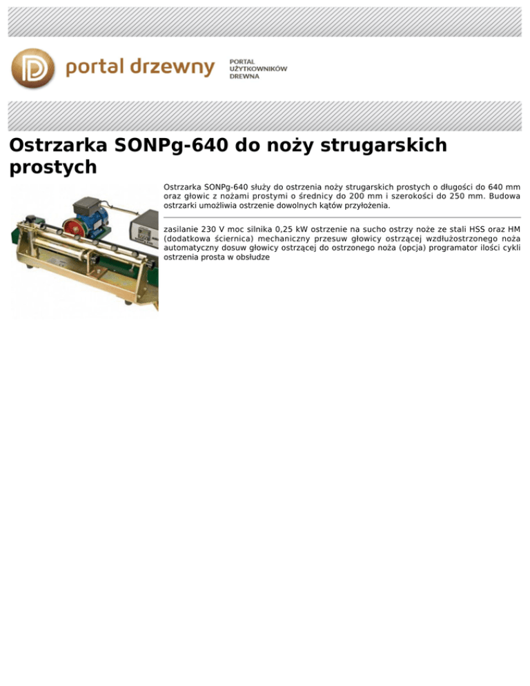 Ostrzarka SONPg-640 do noży strugarskich prostych Ostrzarka SONPg-640 służy do ostrzenia noży strugarskich prostych o długości do 640 mm oraz głowic z nożami prostymi o średnicy do 200 mm i szerokości do 250 mm. Budowa ostrzarki umożliwia ostrzenie dowolnych kątów przyłożenia. zasilanie 230 V moc silnika 0,25 kW ostrzenie na sucho ostrzy noże ze stali HSS oraz HM (dodatkowa ściernica) mechaniczny przesuw głowicy ostrzącej wzdłużostrzonego noża automatyczny dosuw głowicy ostrzącej do ostrzonego noża (opcja) programator ilości cykli ostrzenia prosta w obsłudze